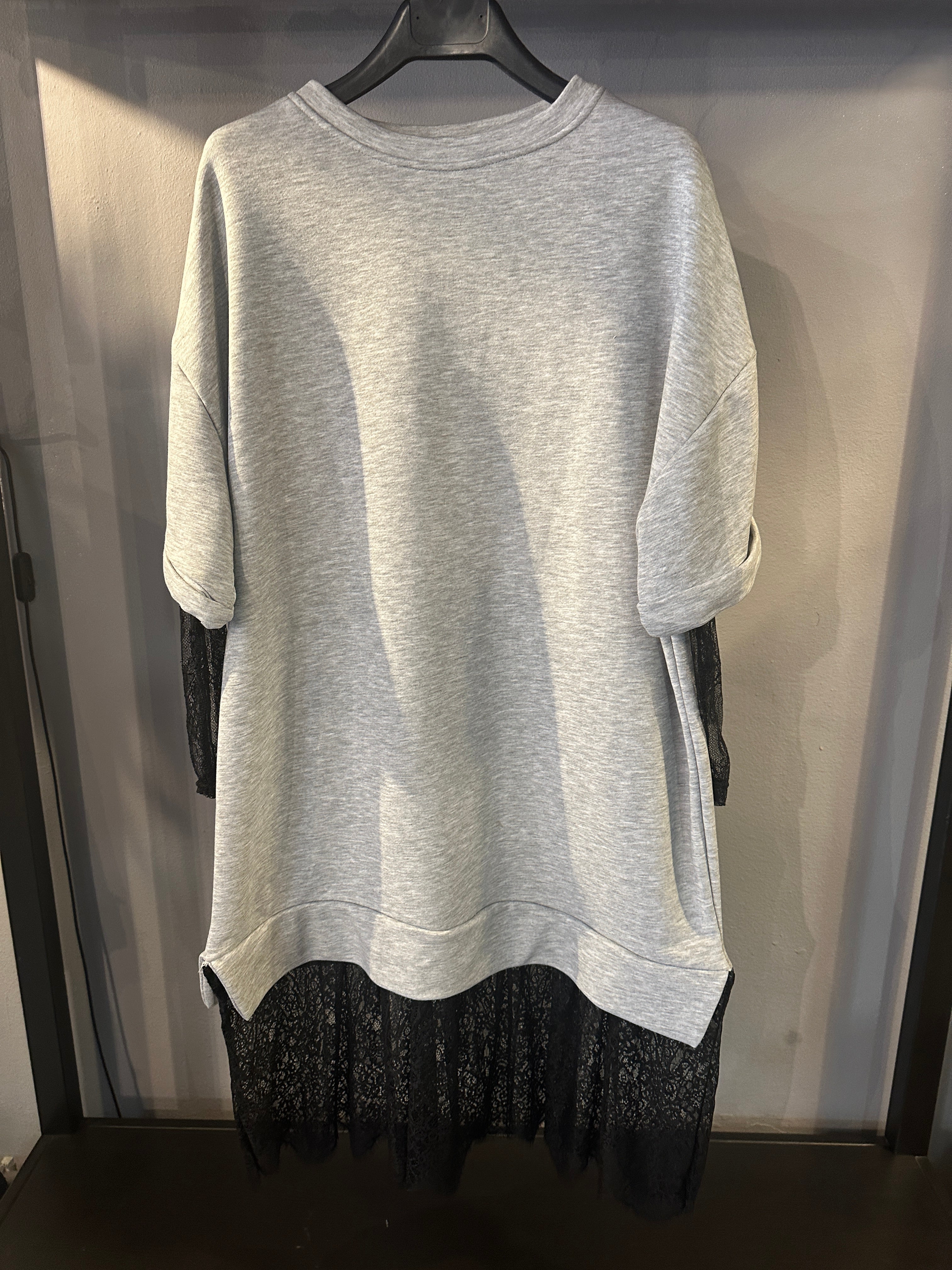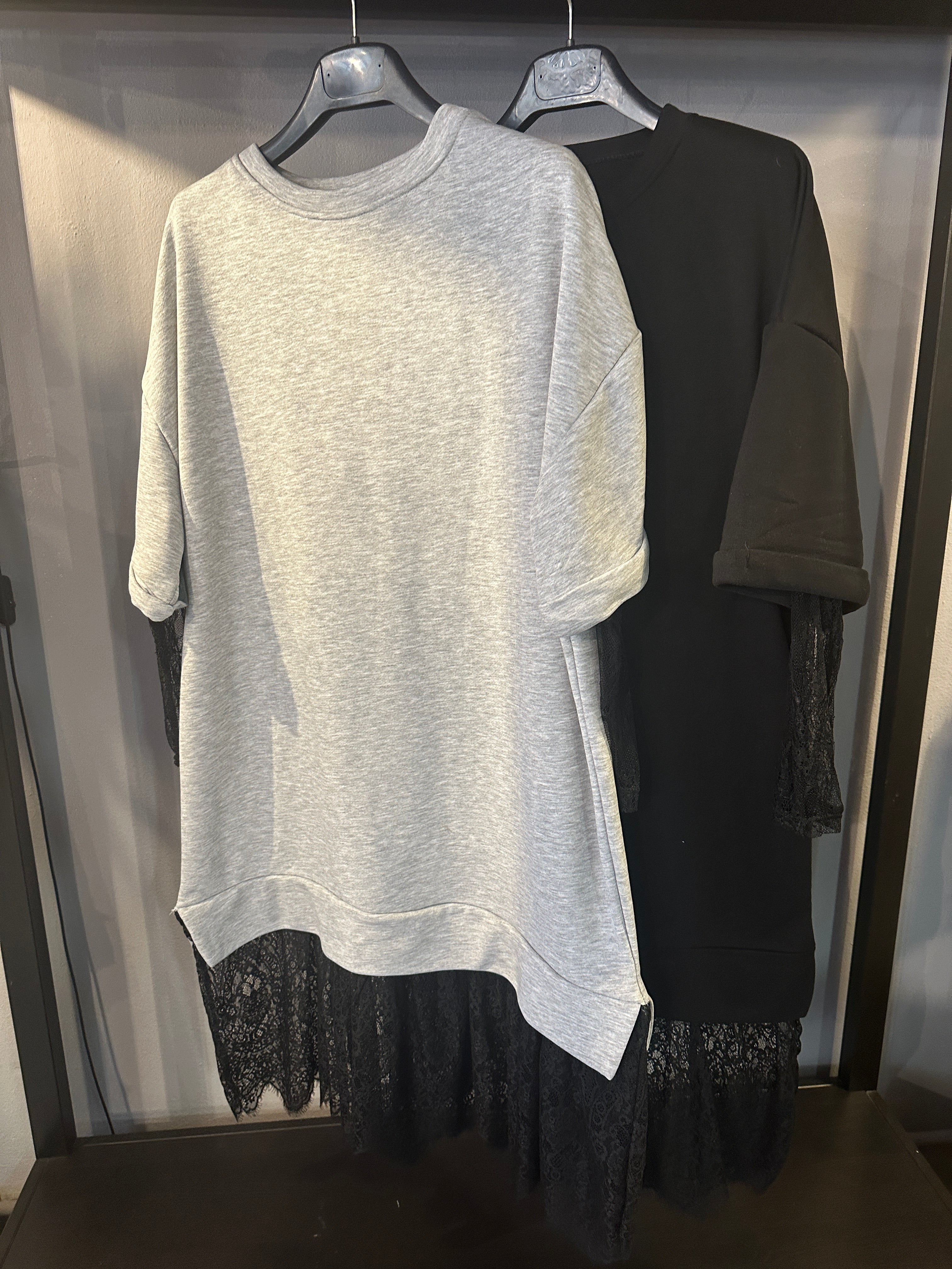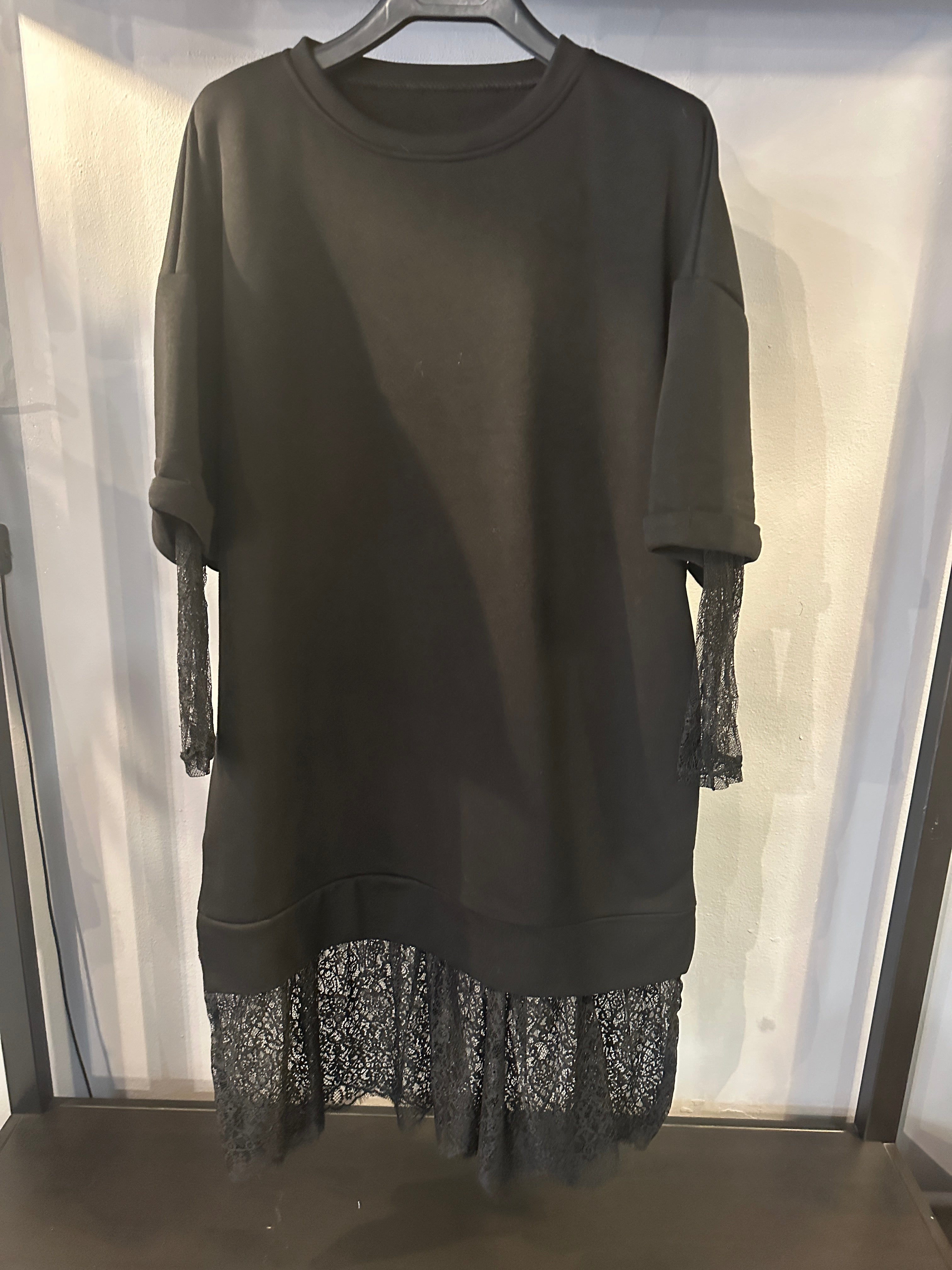 Descrizione: Abito in Felpa con Pizzo. Girocollo, manica metà in felpa e metà in pizzo, Balza in pizzo