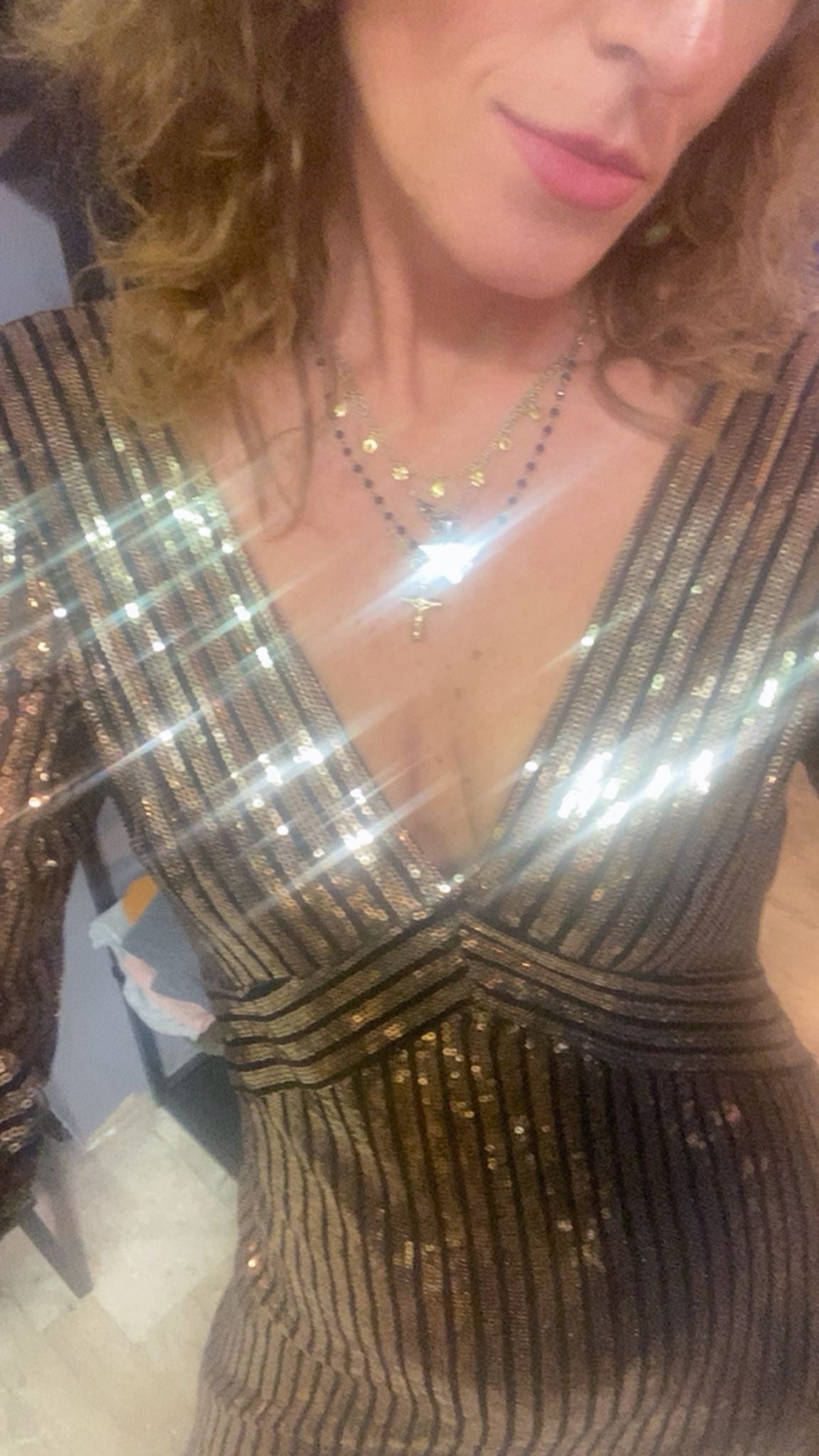 Descrizione: Abito al ginocchio in Paiellettes. Scollo a V, chiusura con zip, manica lunga