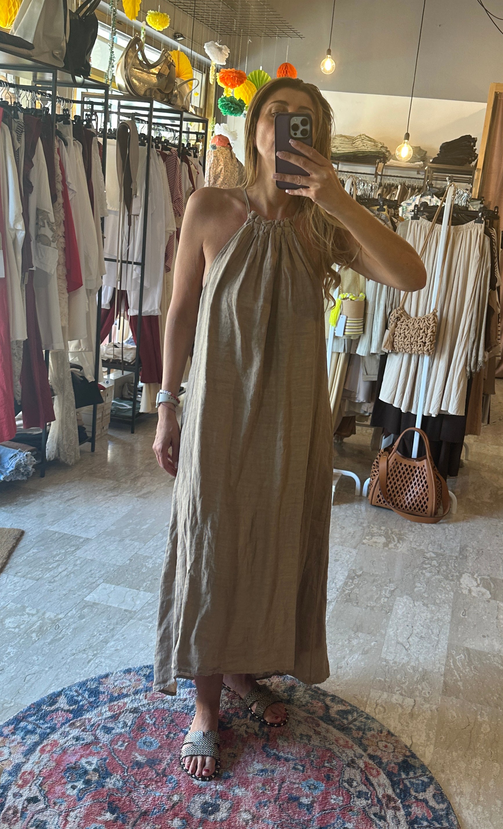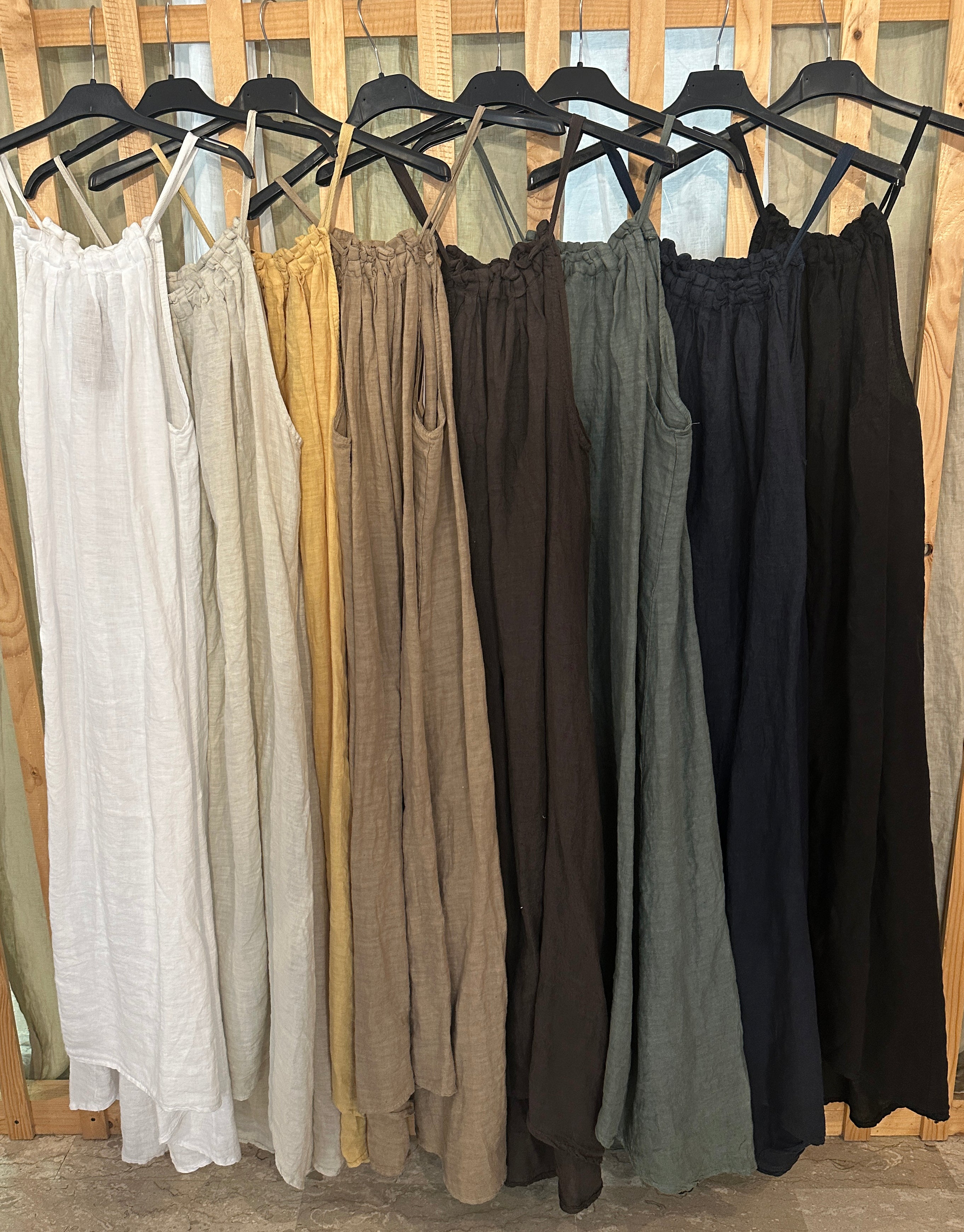 Descrizione: Abito lungo in Lino . Scollo davanti e dietro arricciato. Bretelline sottili in lino