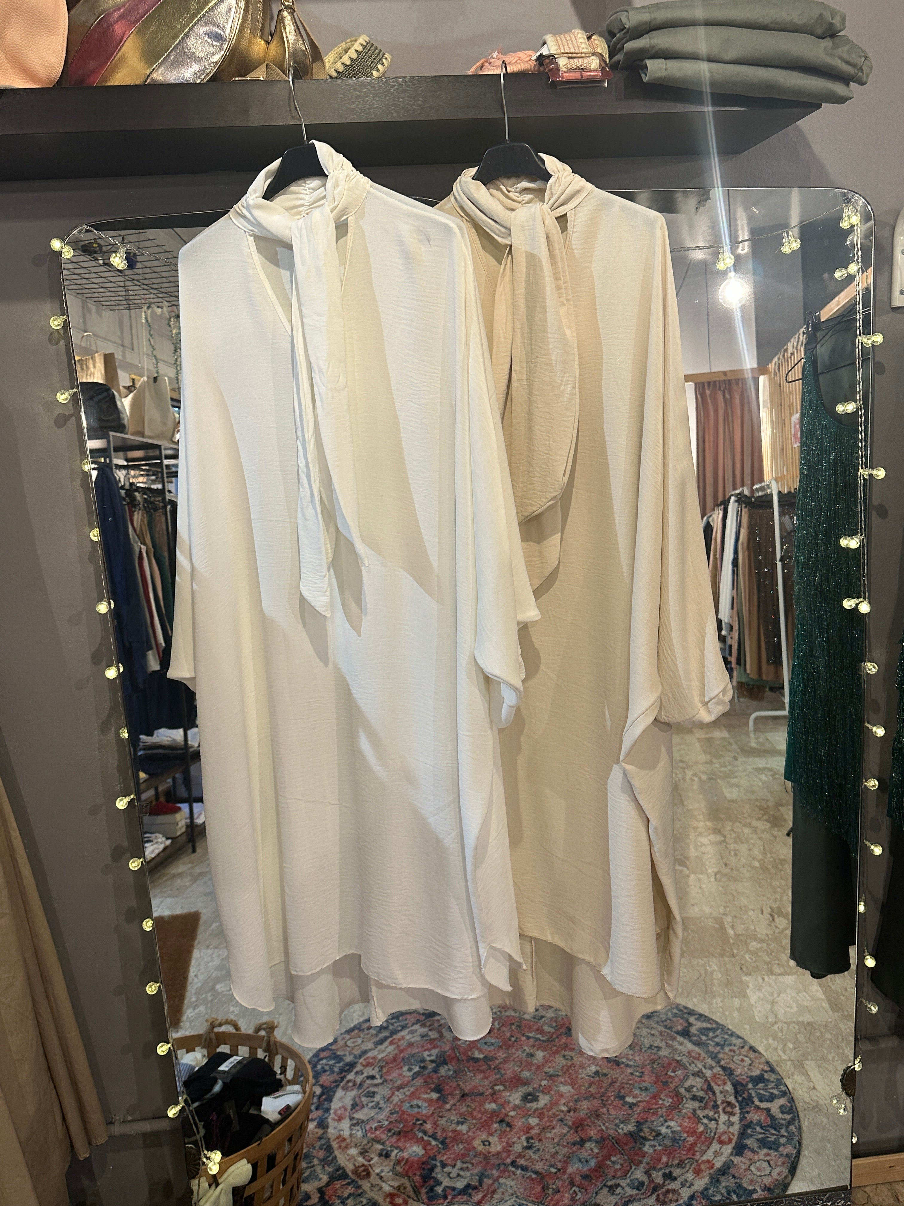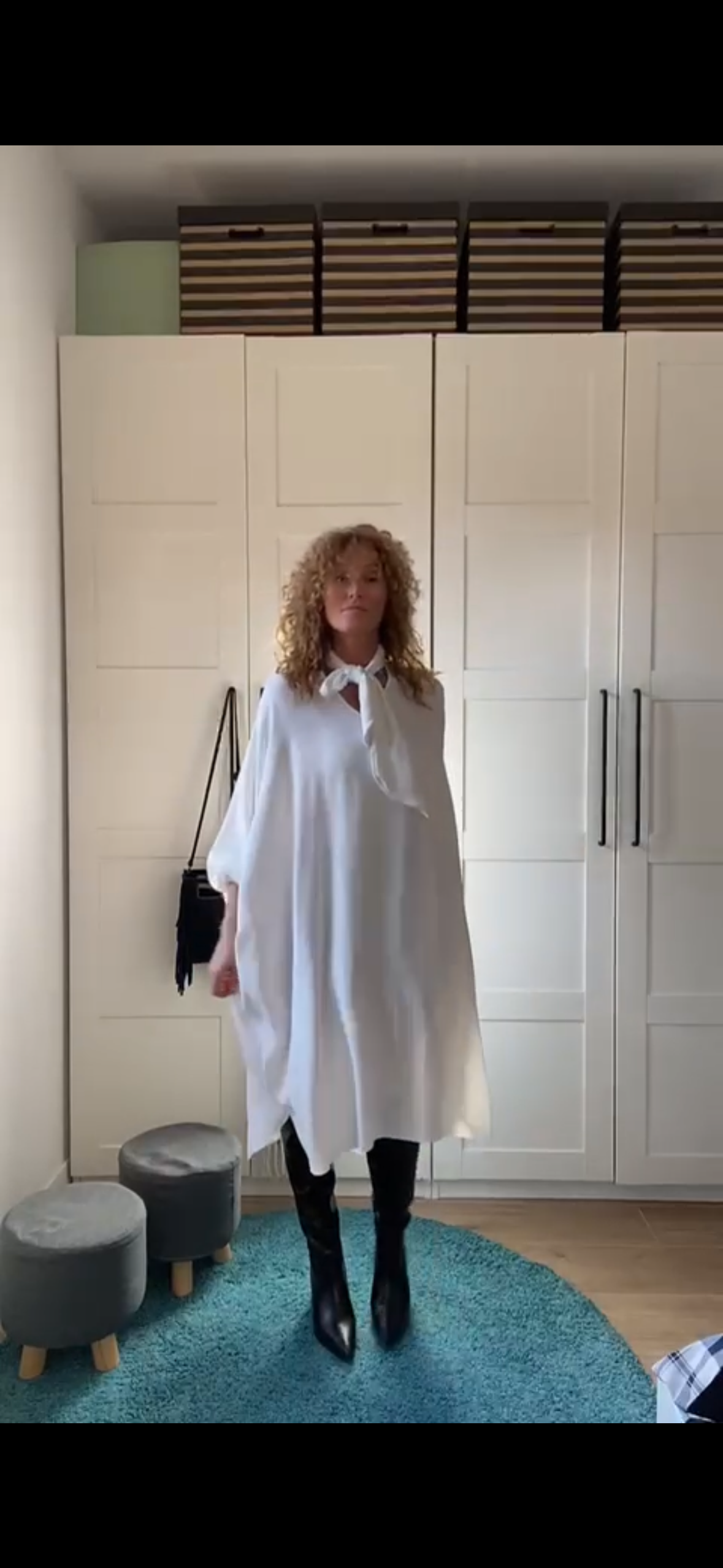Descrizione: Abito over con fiocco al collo. Maniche 3/4 con elastico in fondo. Davanti più corto e dietro stondato