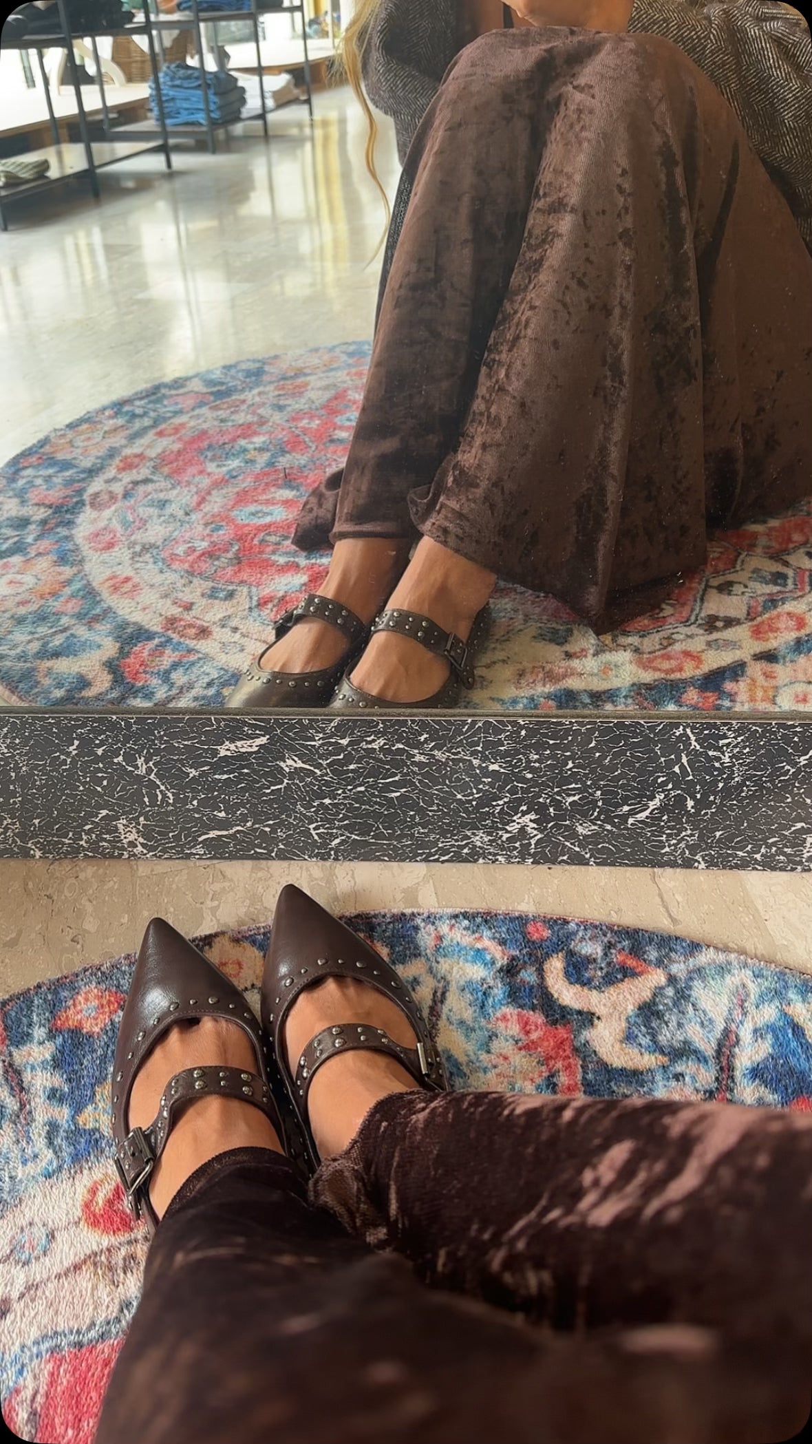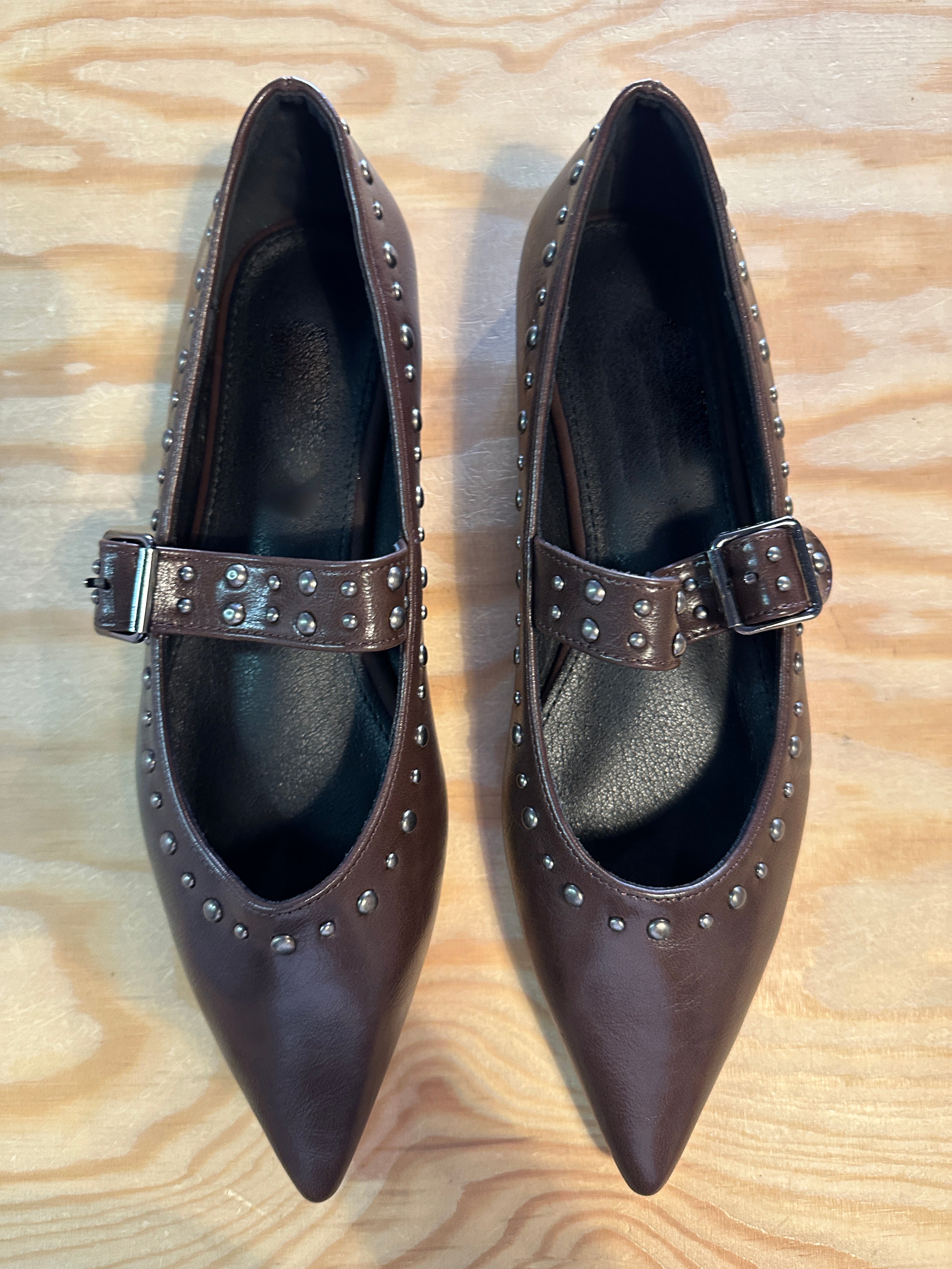 Descrizione: Ballerine a punta con borchie. Decorate con borchiette sui lati. Cinturino alto con fibbia sul collo del piede