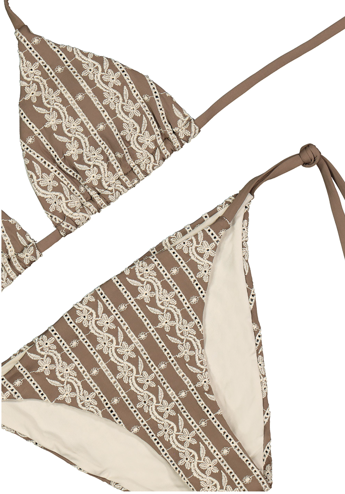 Bikini marrone con ricami floreali bianchi. Top a triangolo e slip con coulisse regolabile.