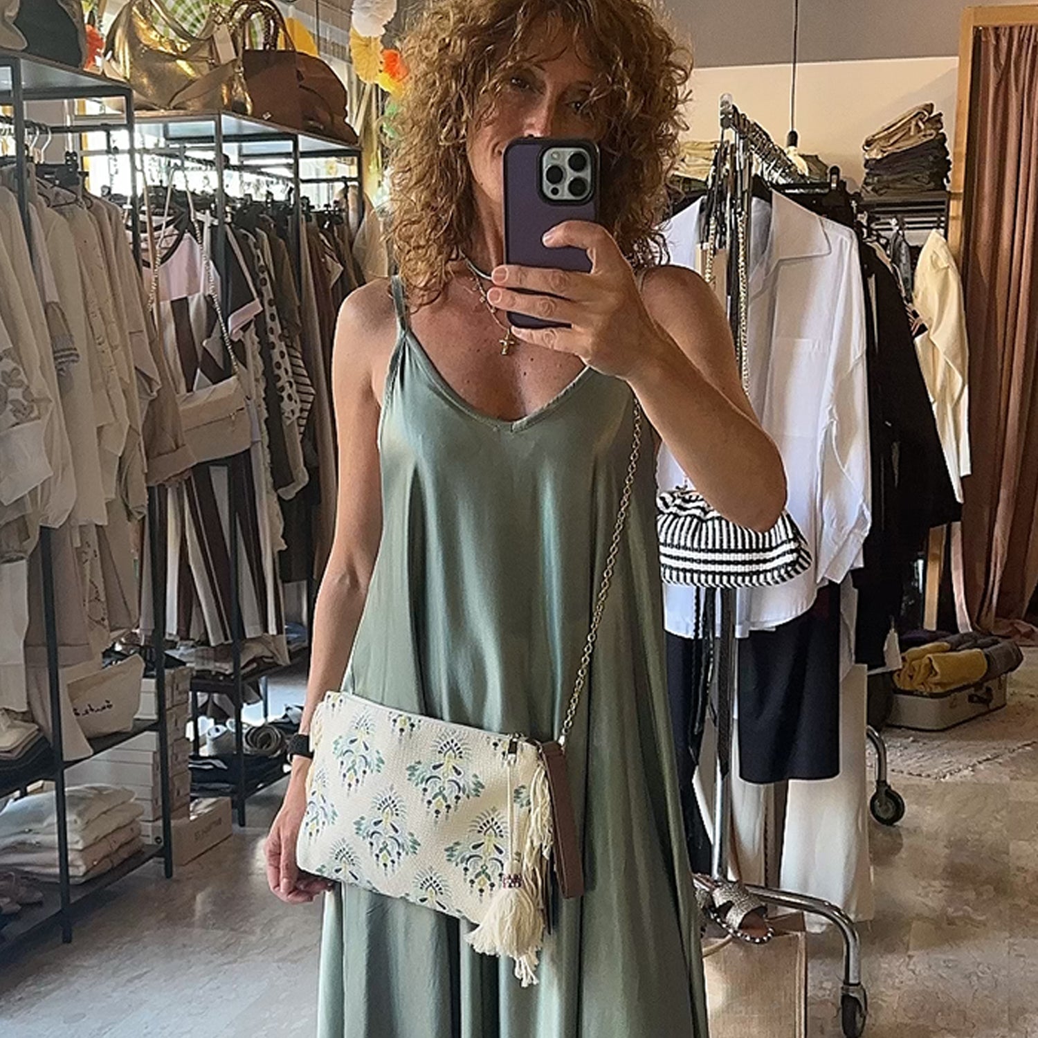 Descrizione: Borsa stile etnico. Manico in pelle e tracolla con catena. Frange laterali