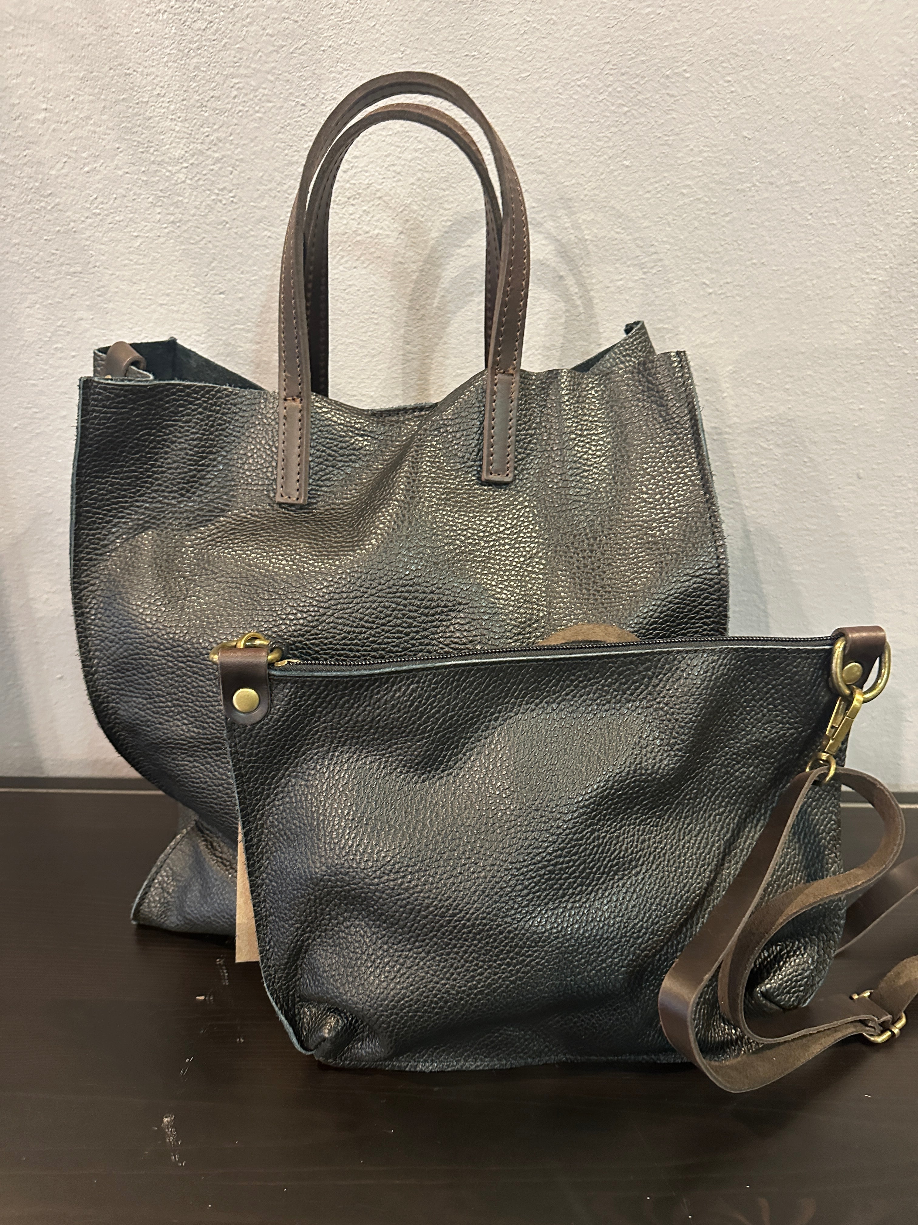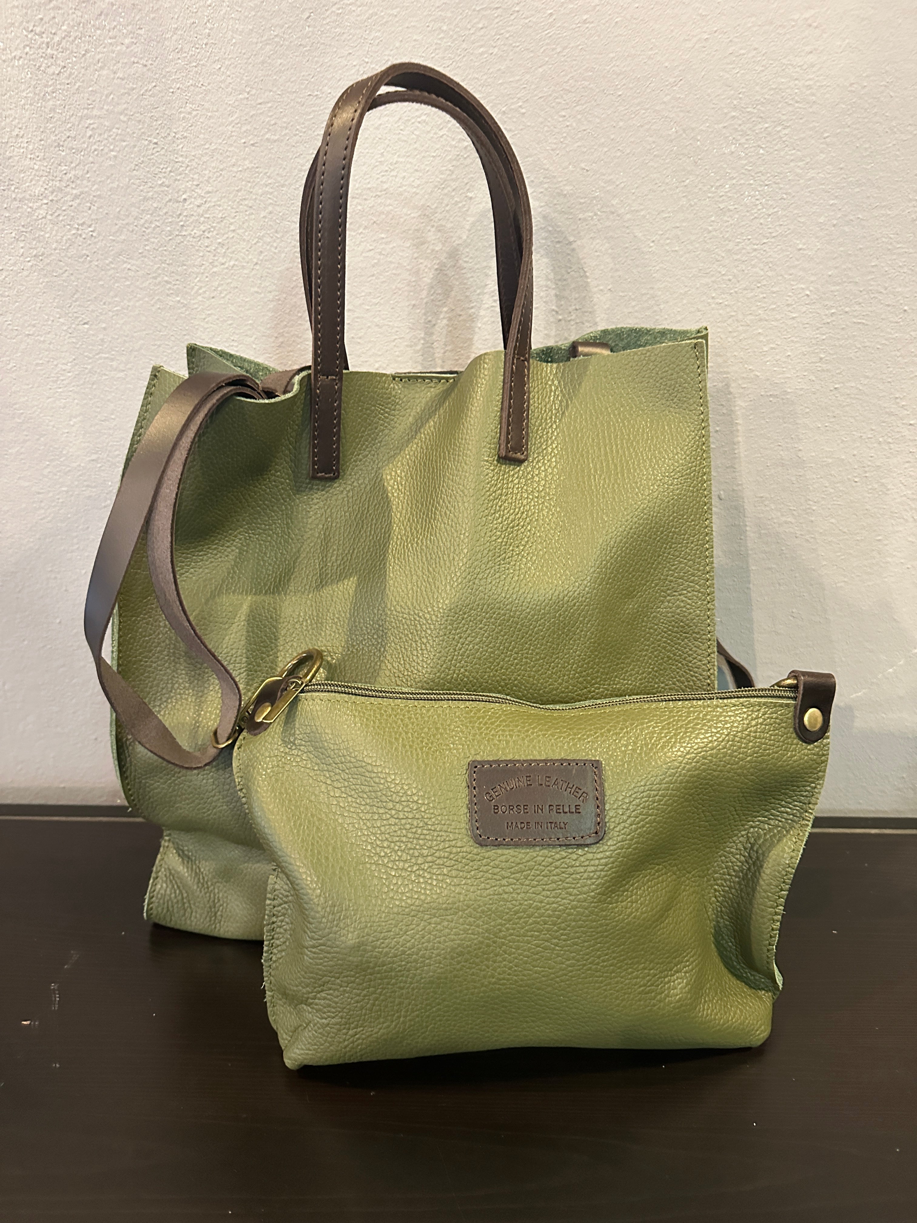 Descrizione: Borsa Shopper in Vera Pelle sfoderata. Manici e tracolla in pelle a contrasto. Busta interna estraibile in Vera Pelle