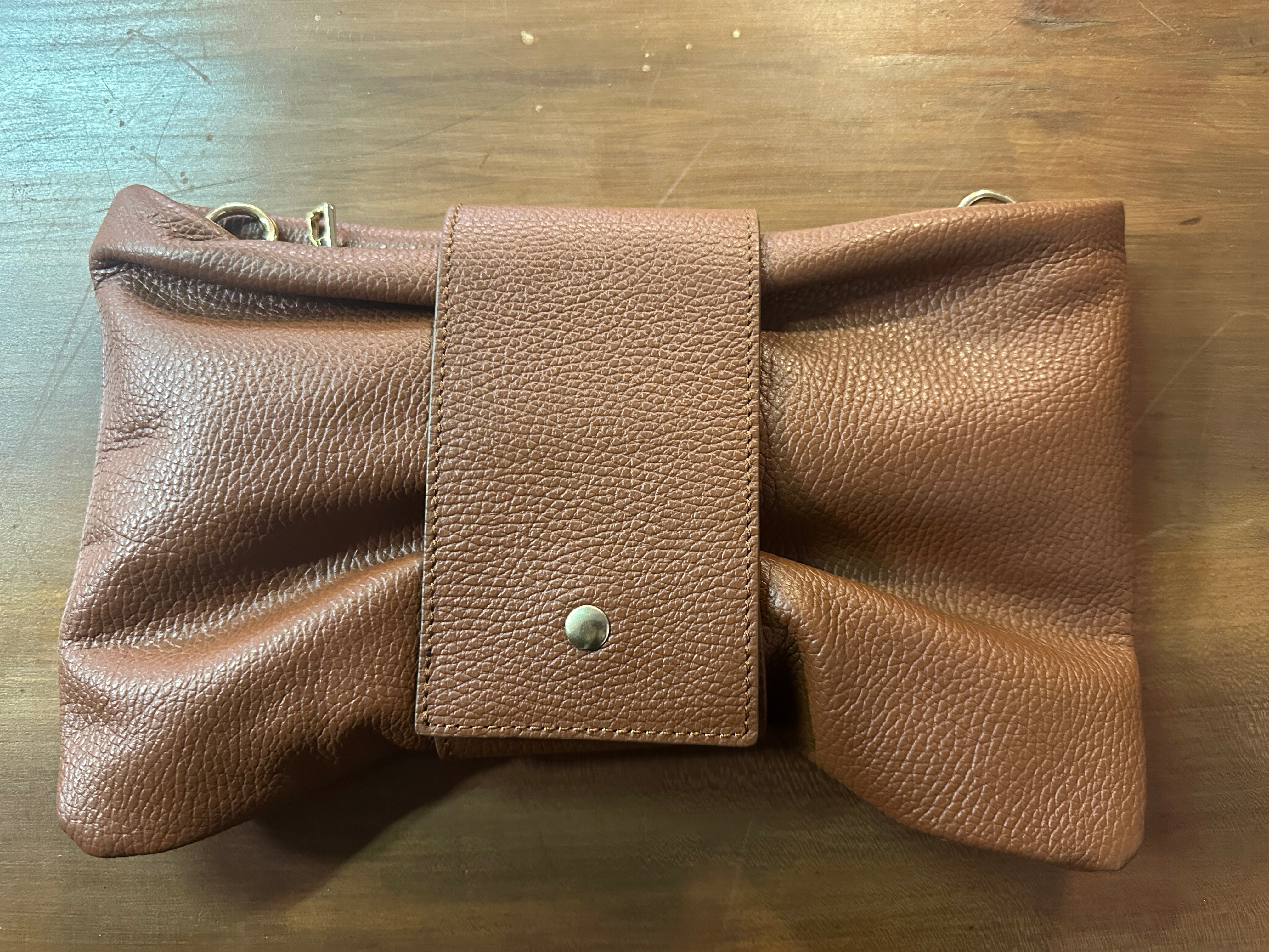 Descrizione: Busta a fiocco in Vera pelle. Interno foderato, con taschino. Tracolla in pelle rimovibile con moschettoni. Chiusura con zip lato superiore e patta con bottone