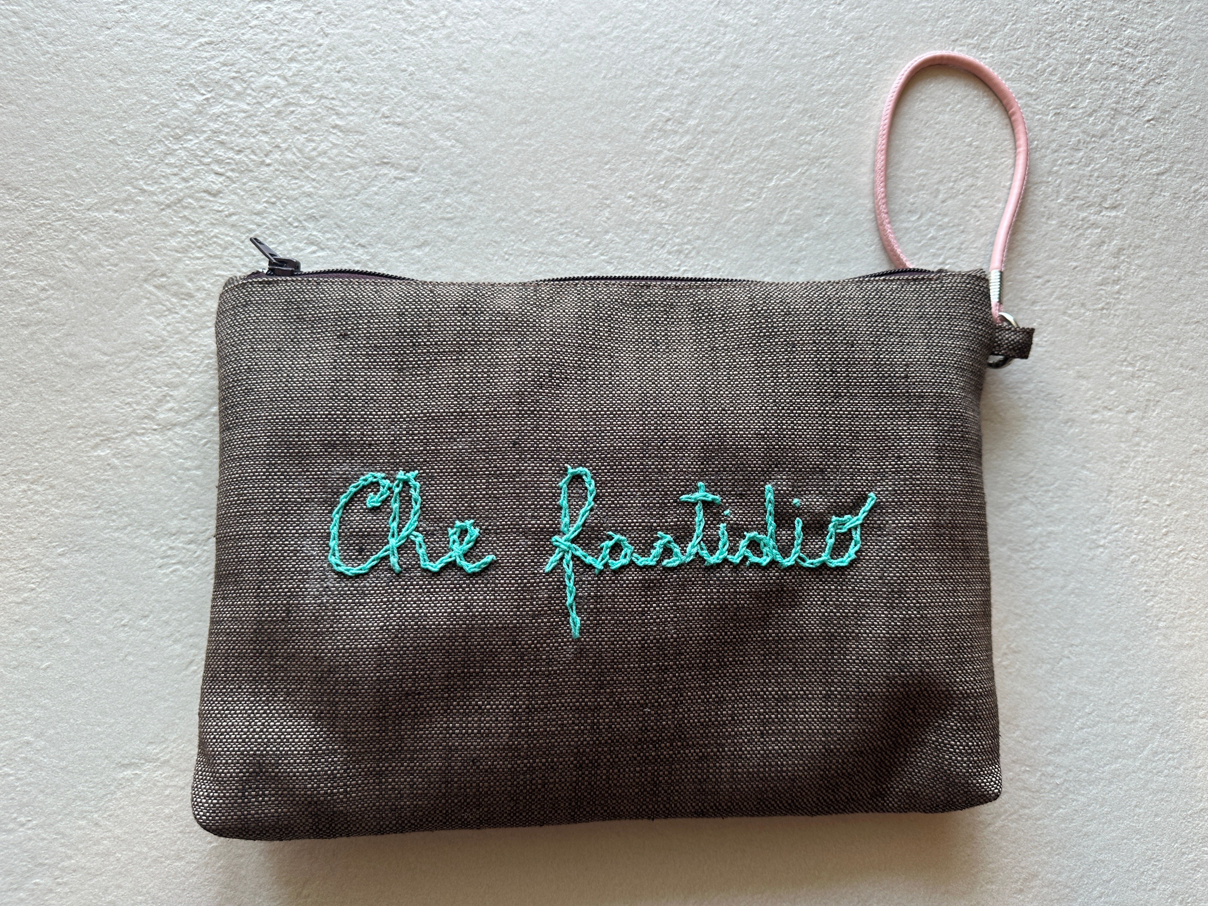 Descrizione: Busta a mano in cotone. Chiusura con zip. Foderata e taschina interna