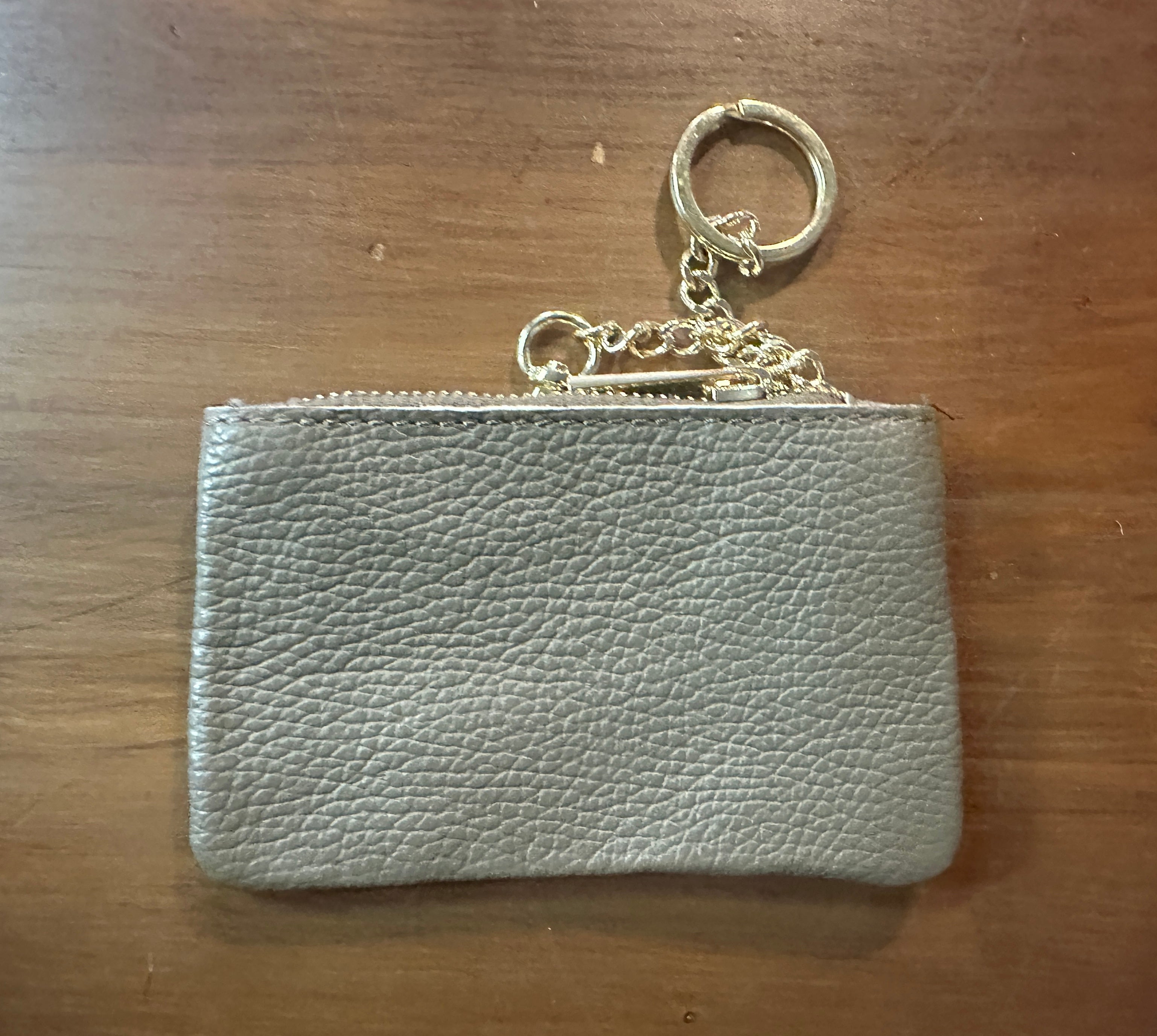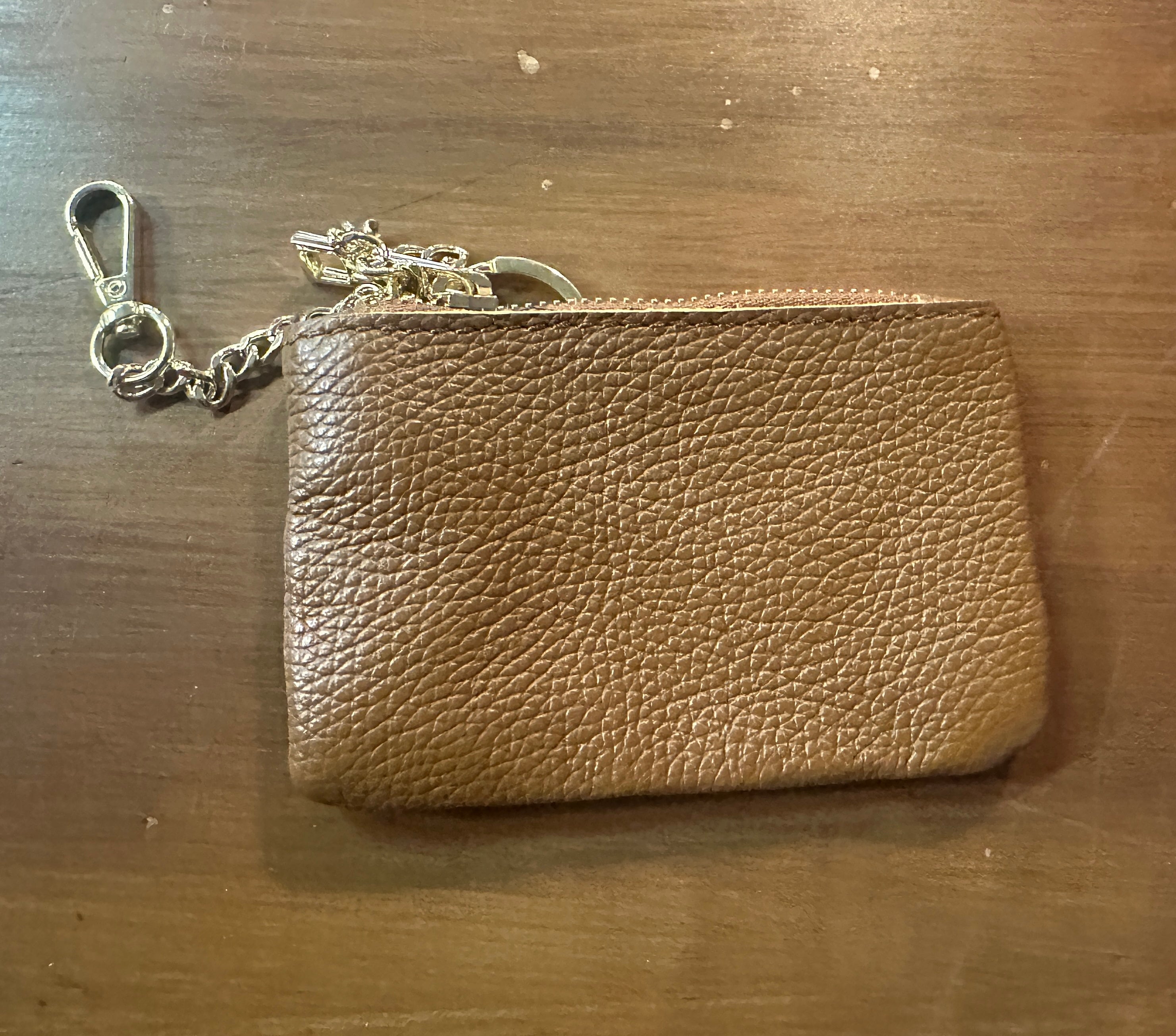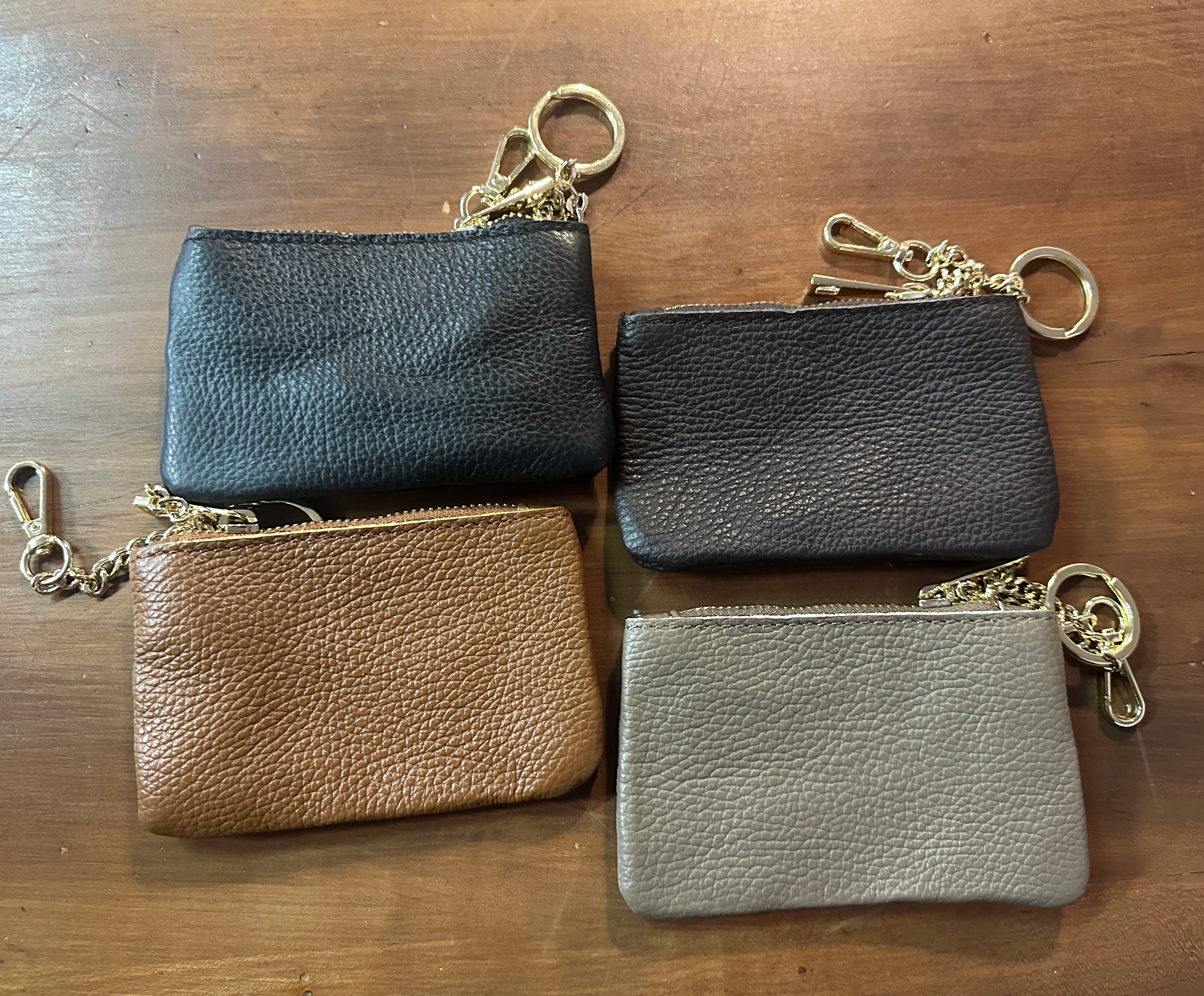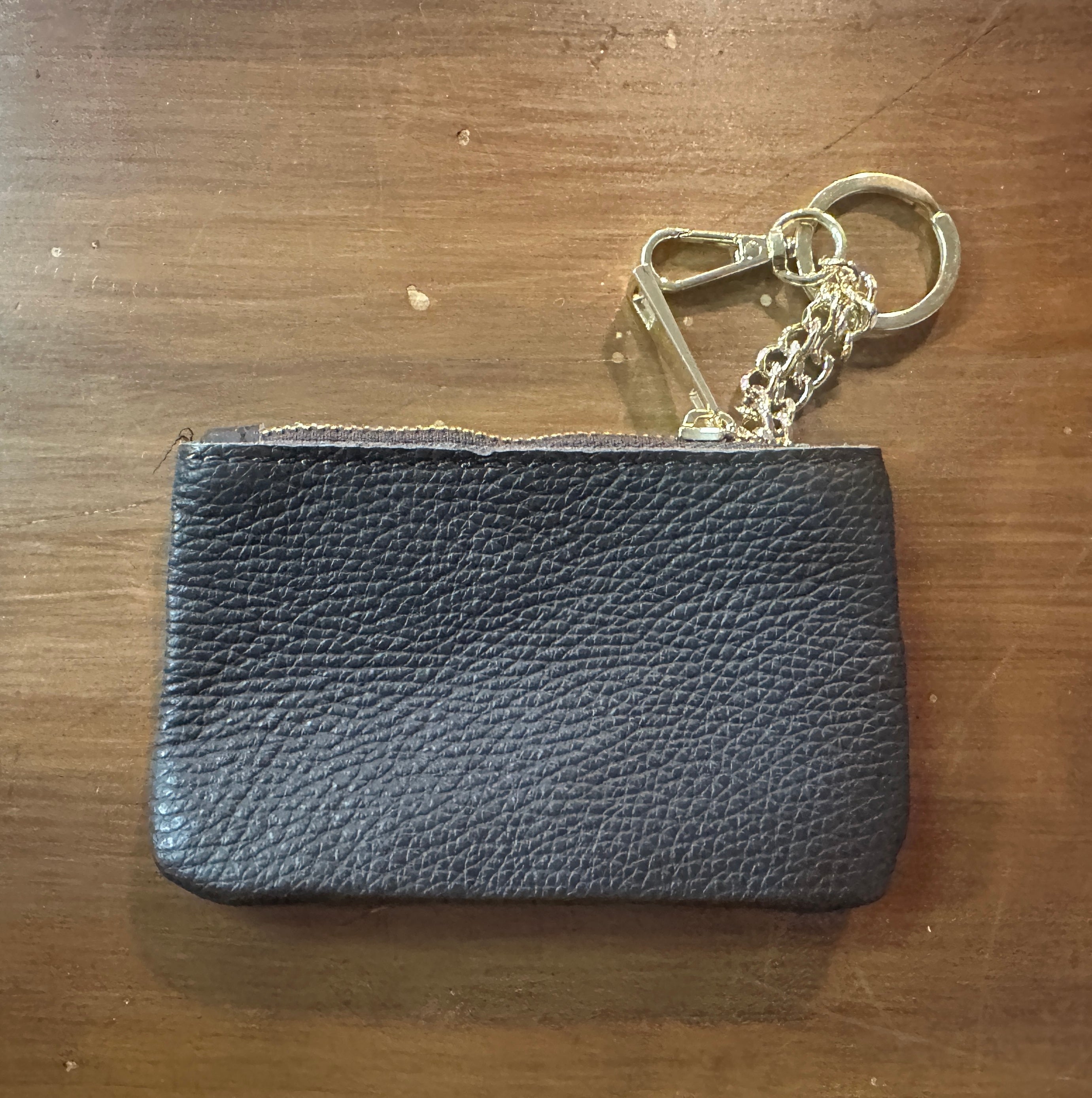 Descrizione: Bustina Portamonete in Vera pelle. Moschettone per chiavi . Chiusura con zip lato superiore