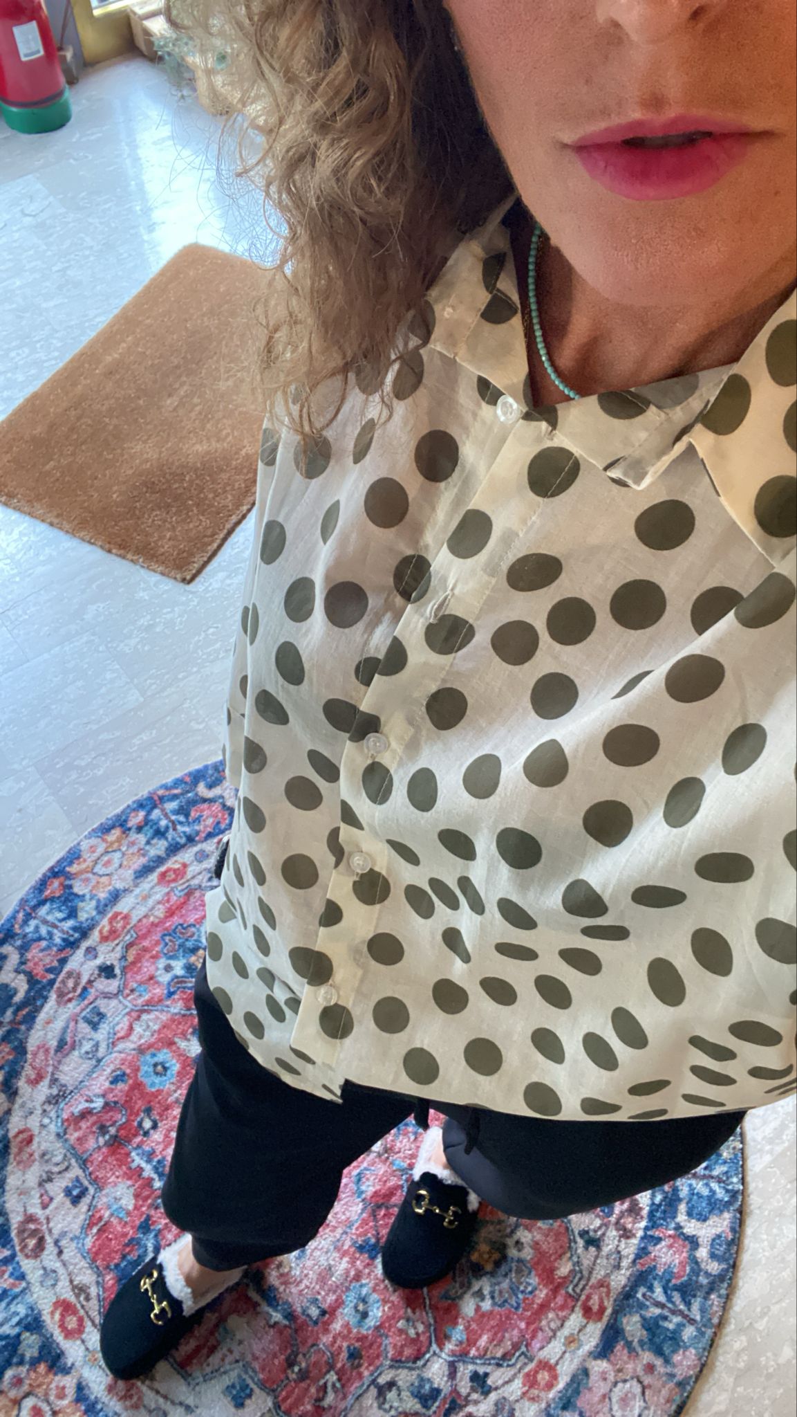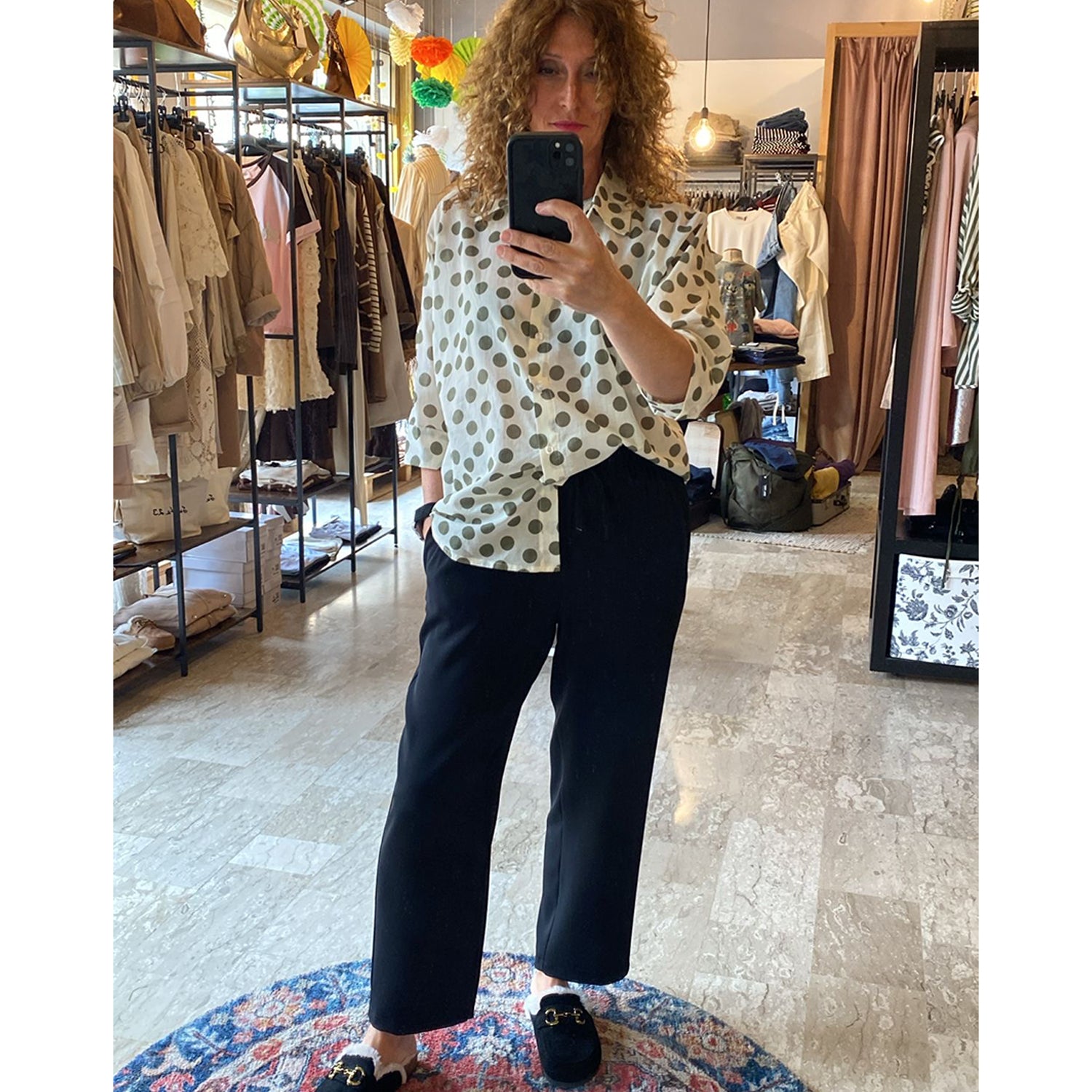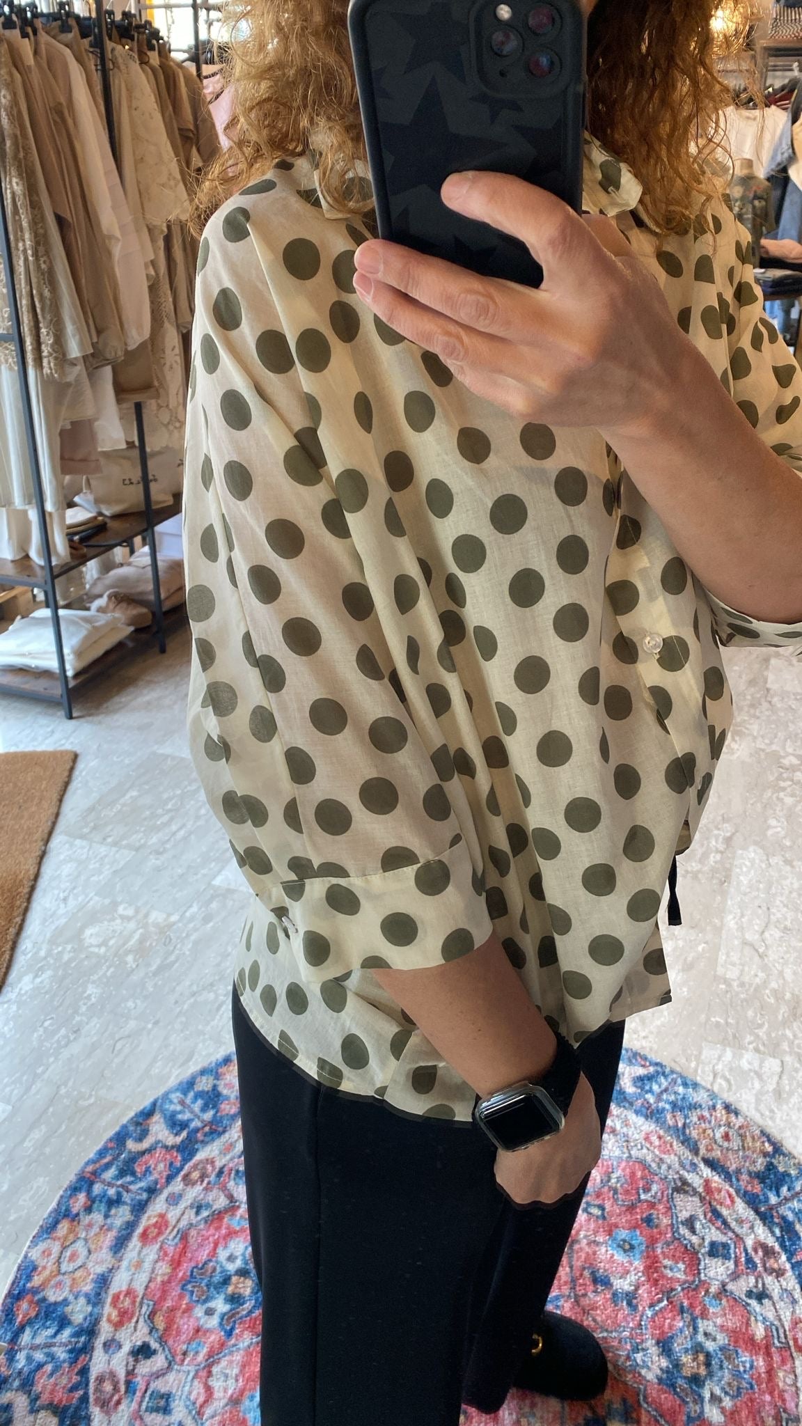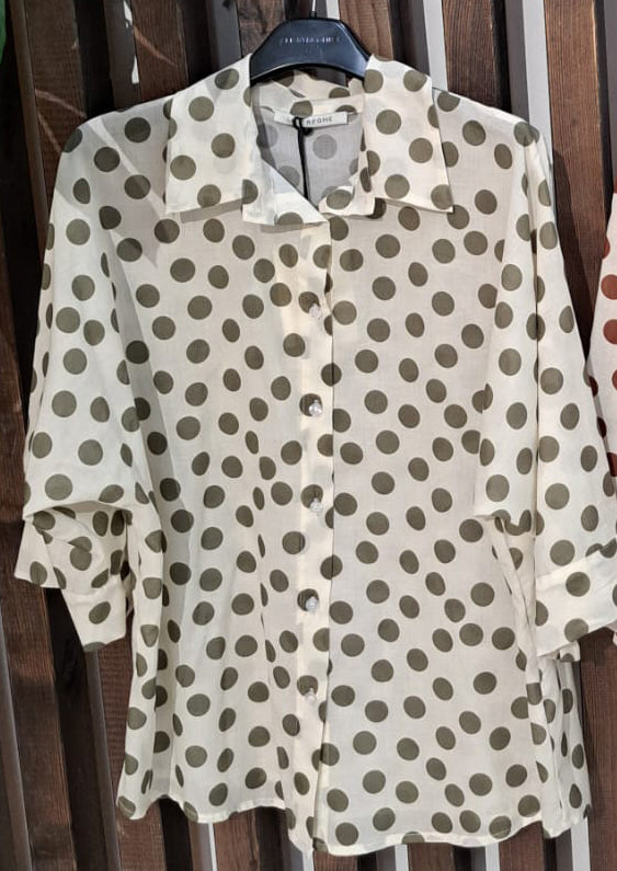 Descrizione: Camicia donna in mussola con Pois. Maniche 3/4 con polsini e bottone . Chiusura frontale con bottoni.