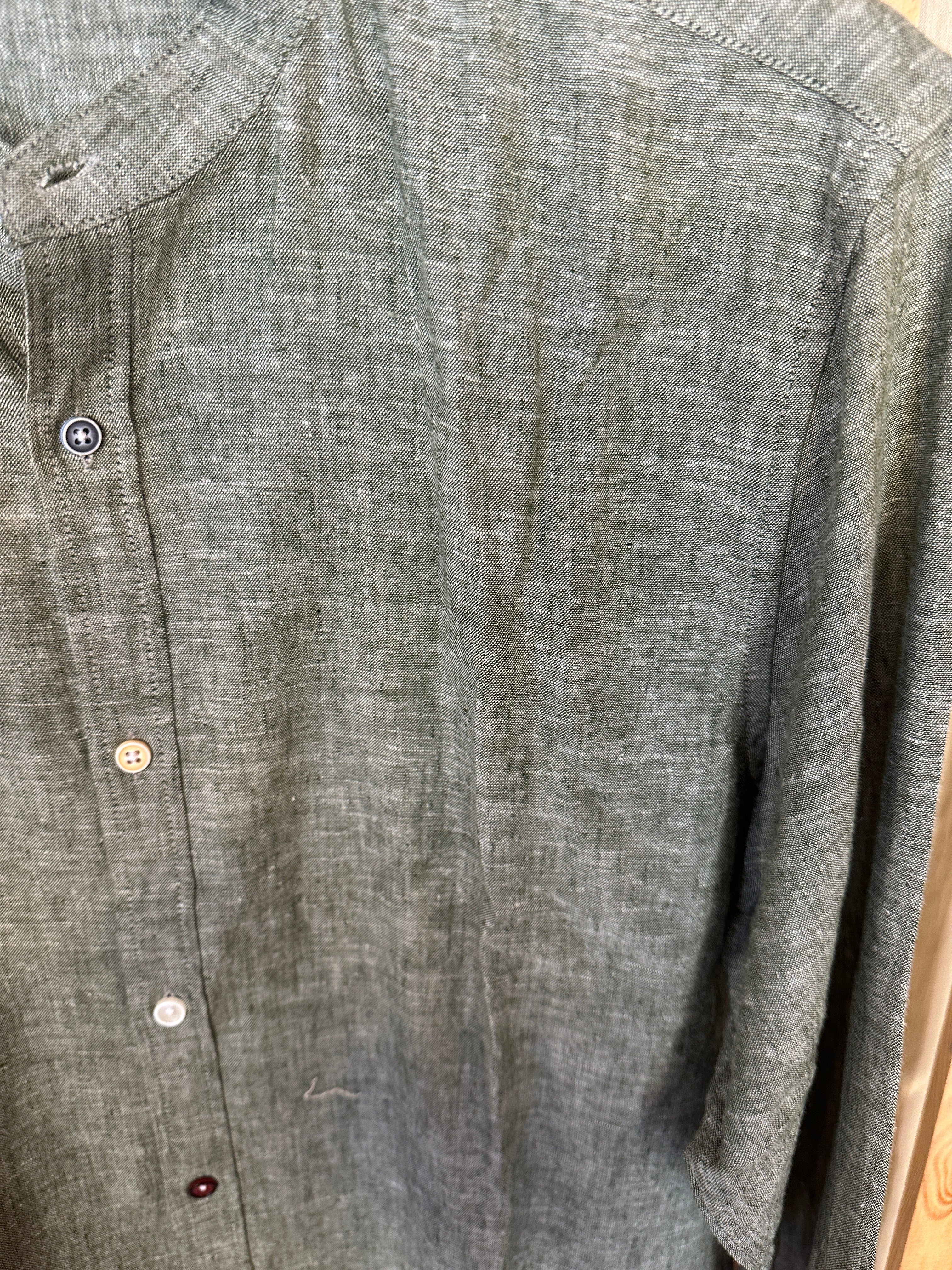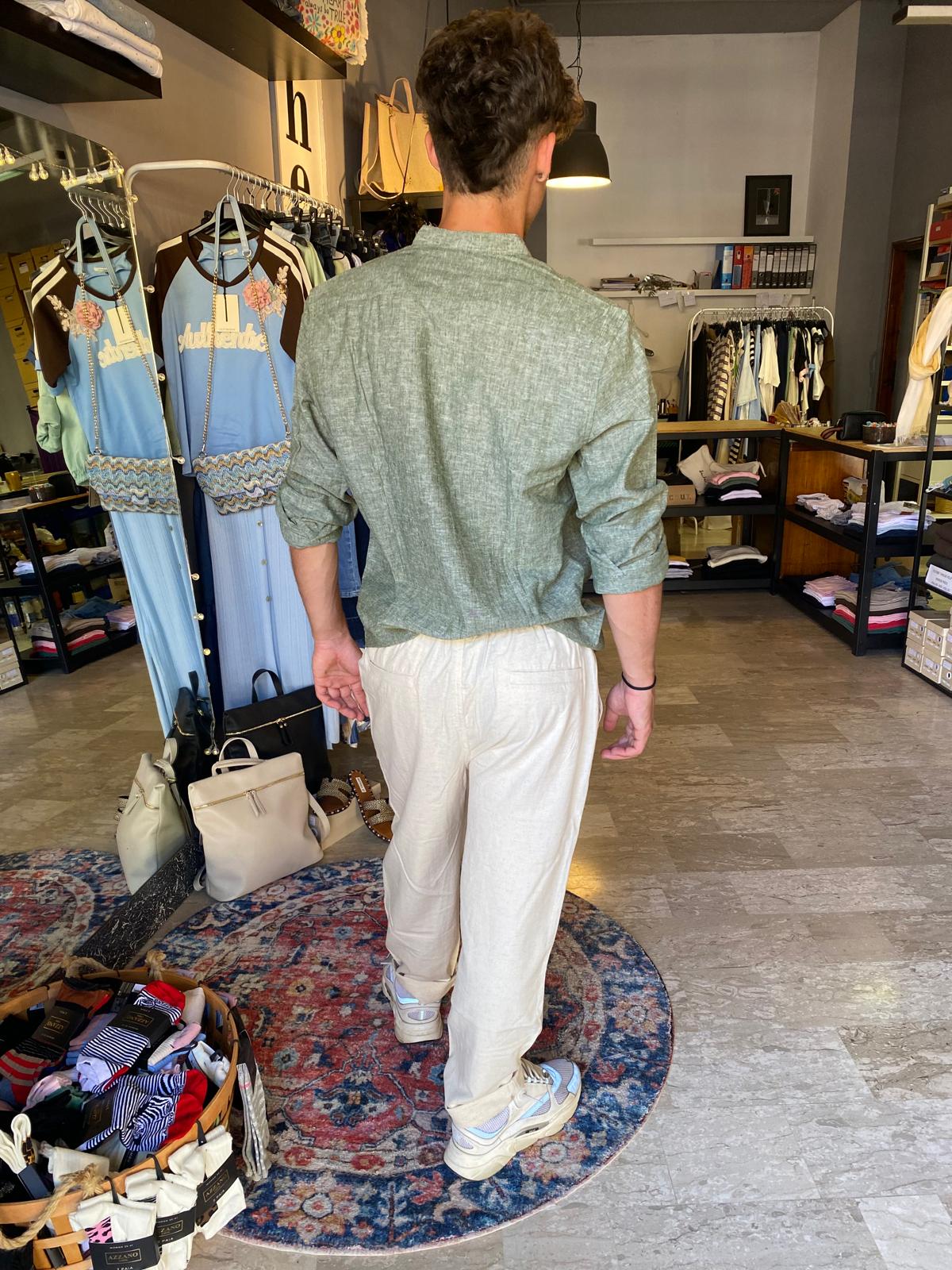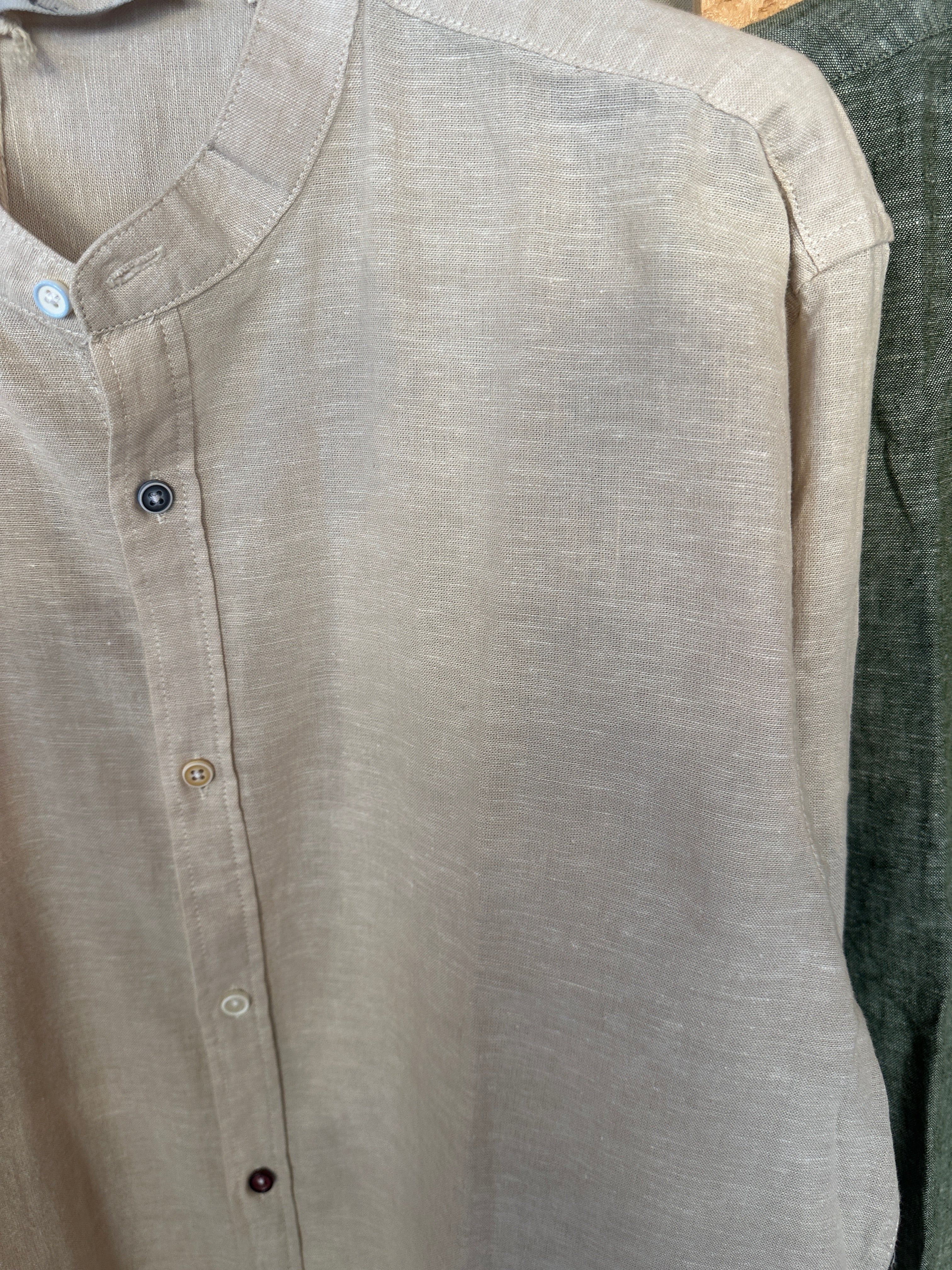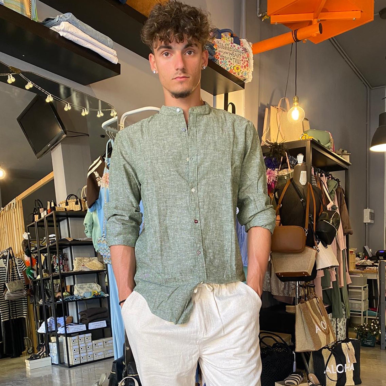 Descrizione: Camicia da uomo con vestibilità regolare. Colletto coreana con chiusura frontale con bottoni diversi. Maniche lunghe con polsini abbottonati