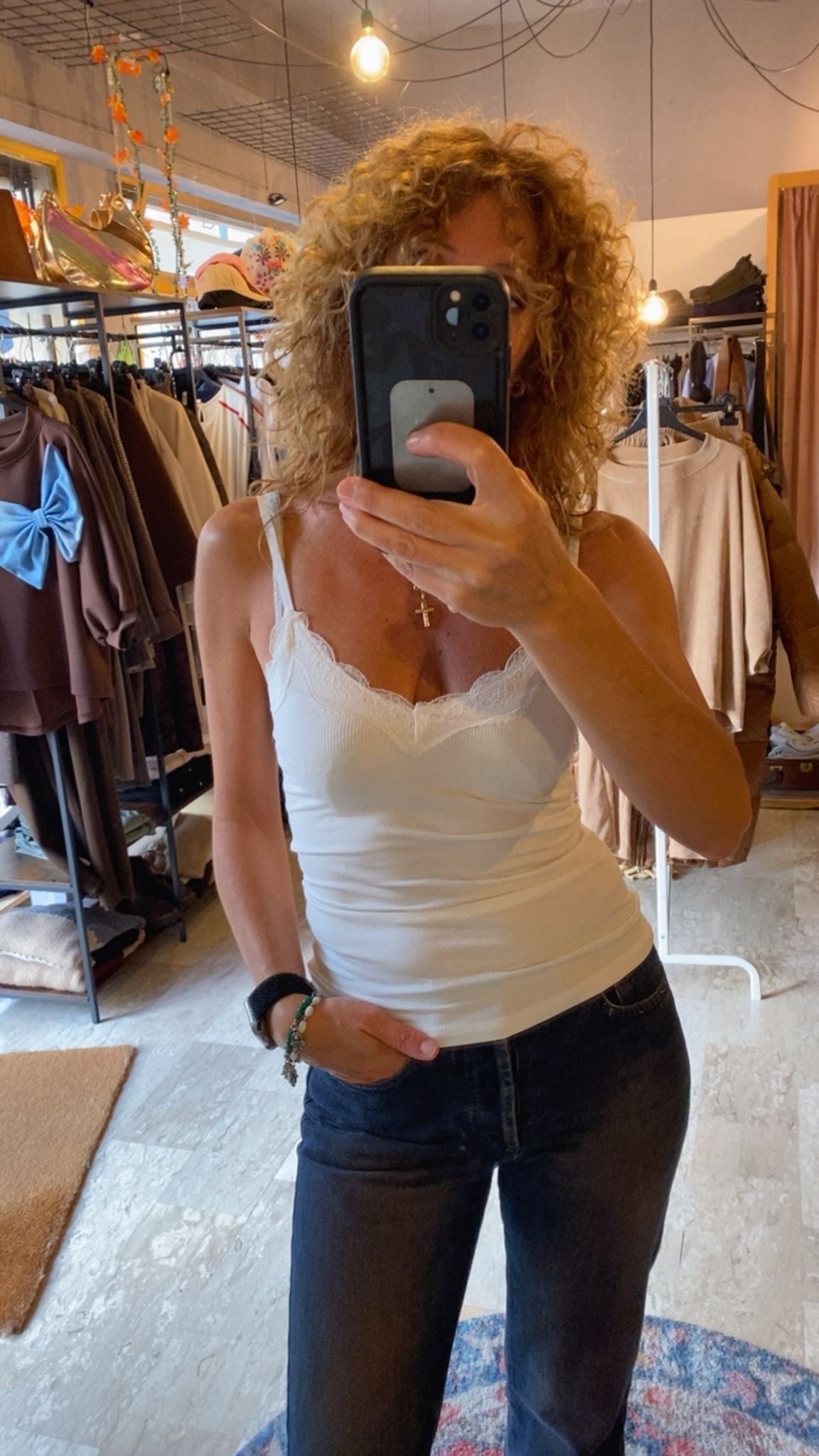 Descrizione: Canotta in costina. Scollo a V con pizzo. Bretelle regolabili