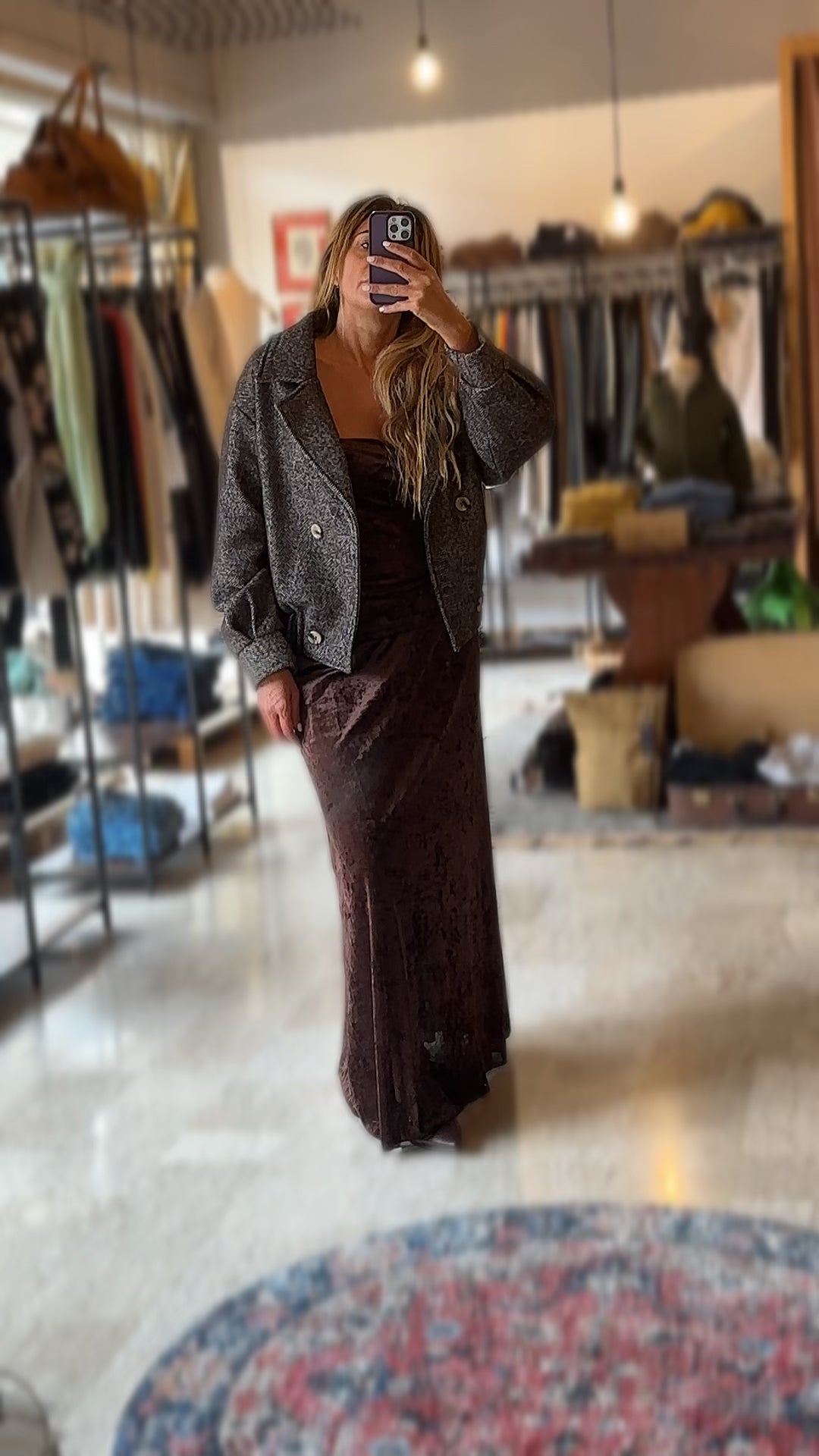 Giubbino Doppiopetto in Lana Tweed Spinato. Collo a camicia. Tasche a filetto.