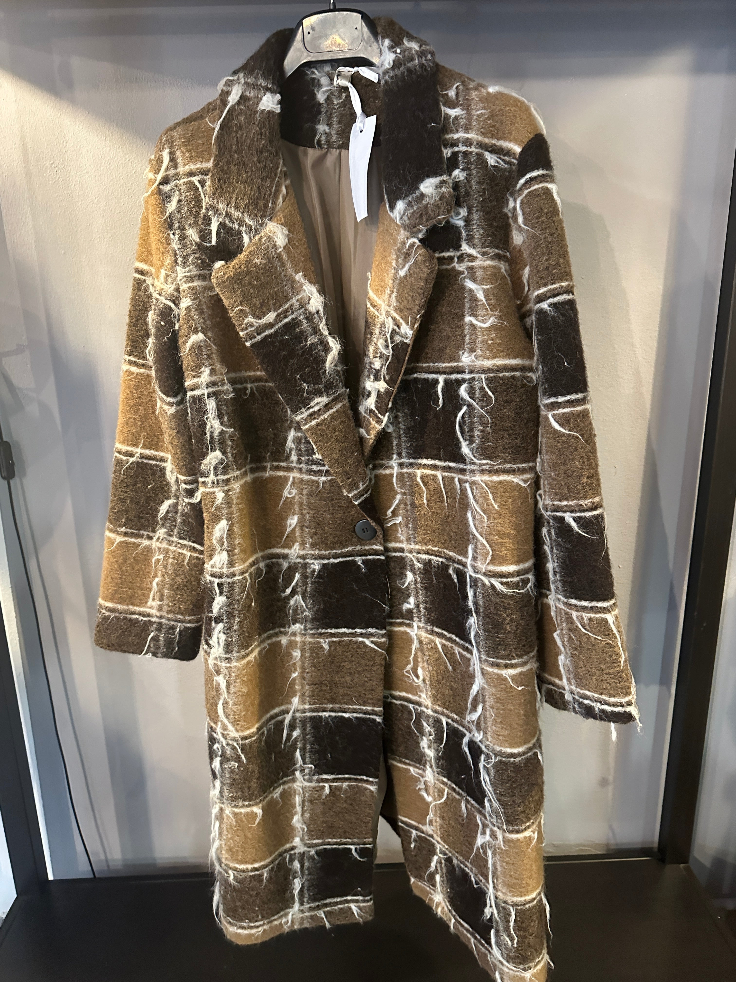 Descrizione: Cappotto Lungo Donna in lana cotta scozzese. Collo Revers. Tasche sul fianco.Chiusura frontale con bottone. Spalle scese, maniche lunghe. Fondo dritto