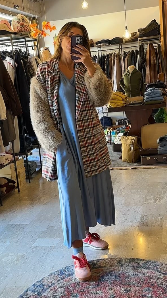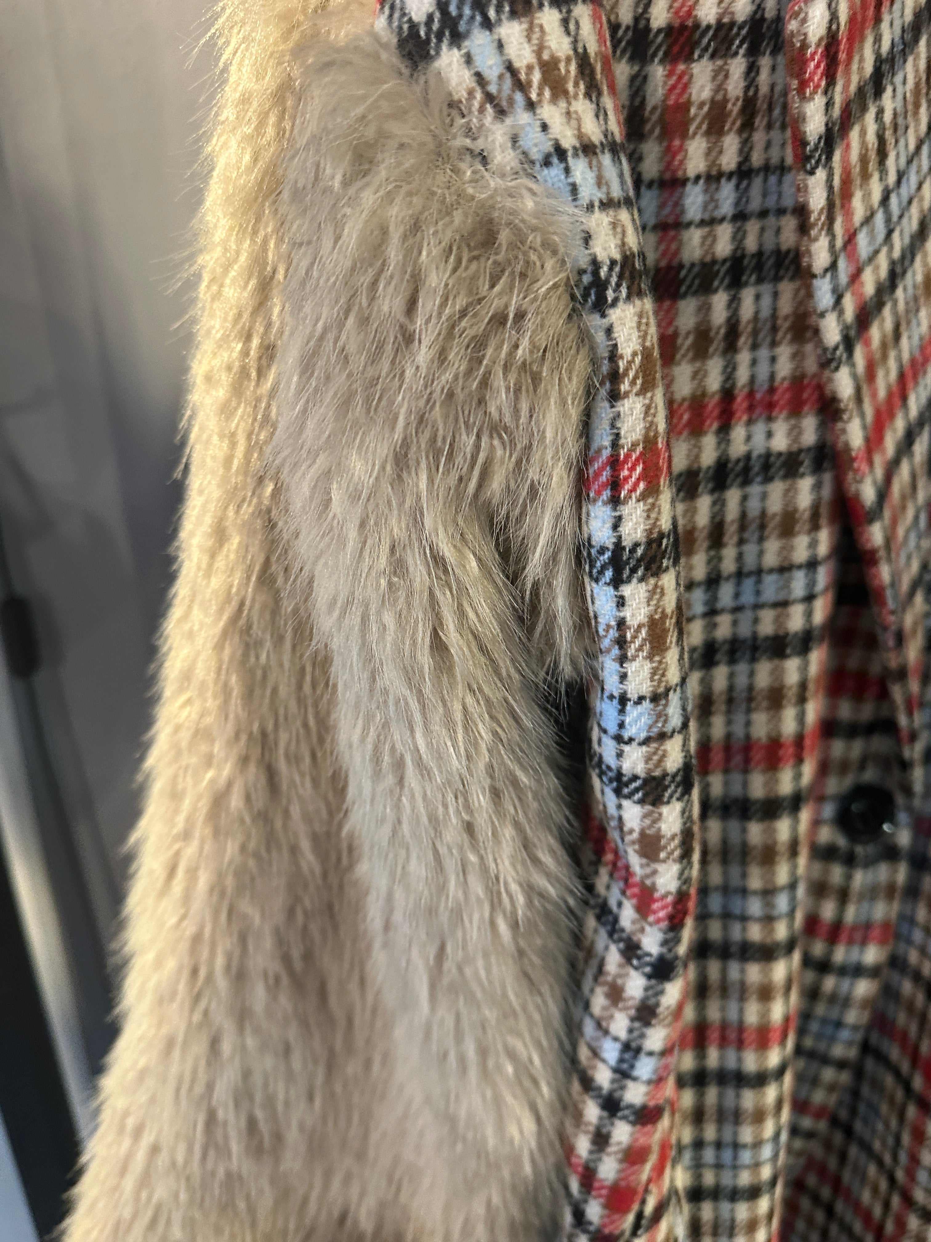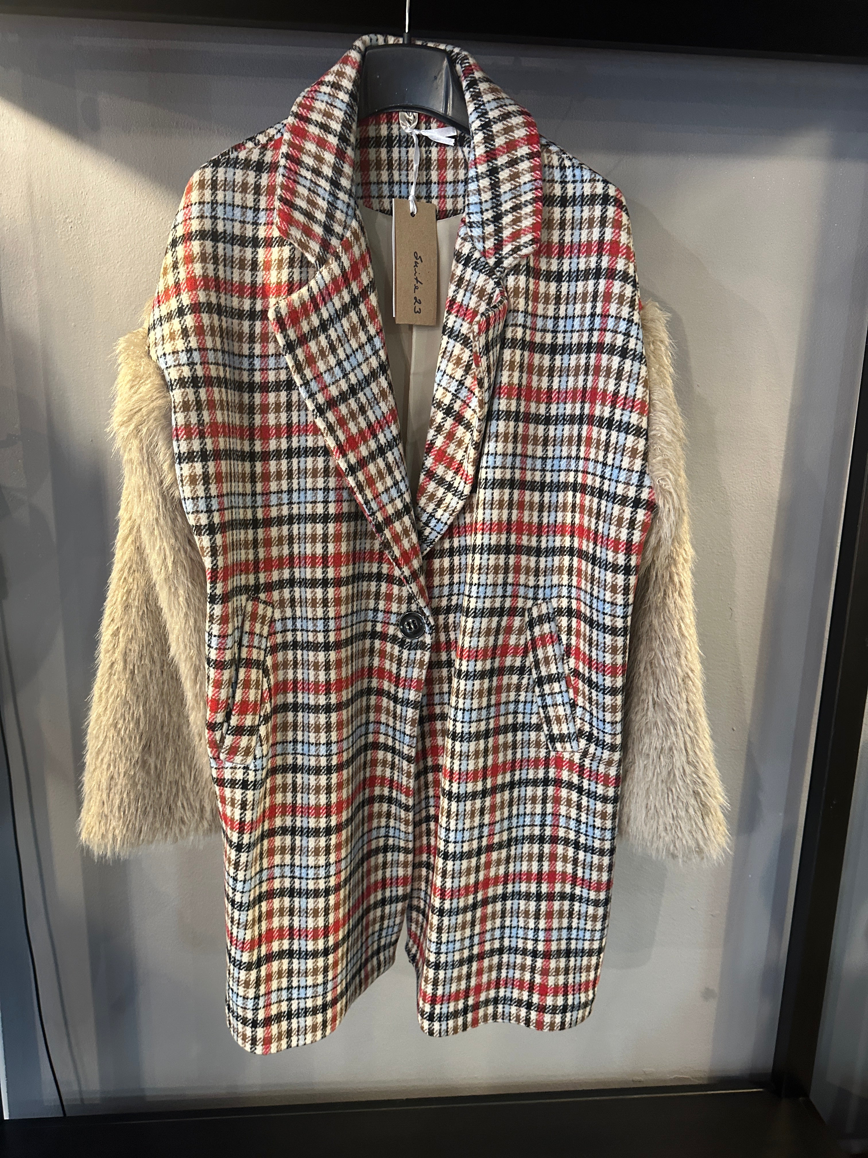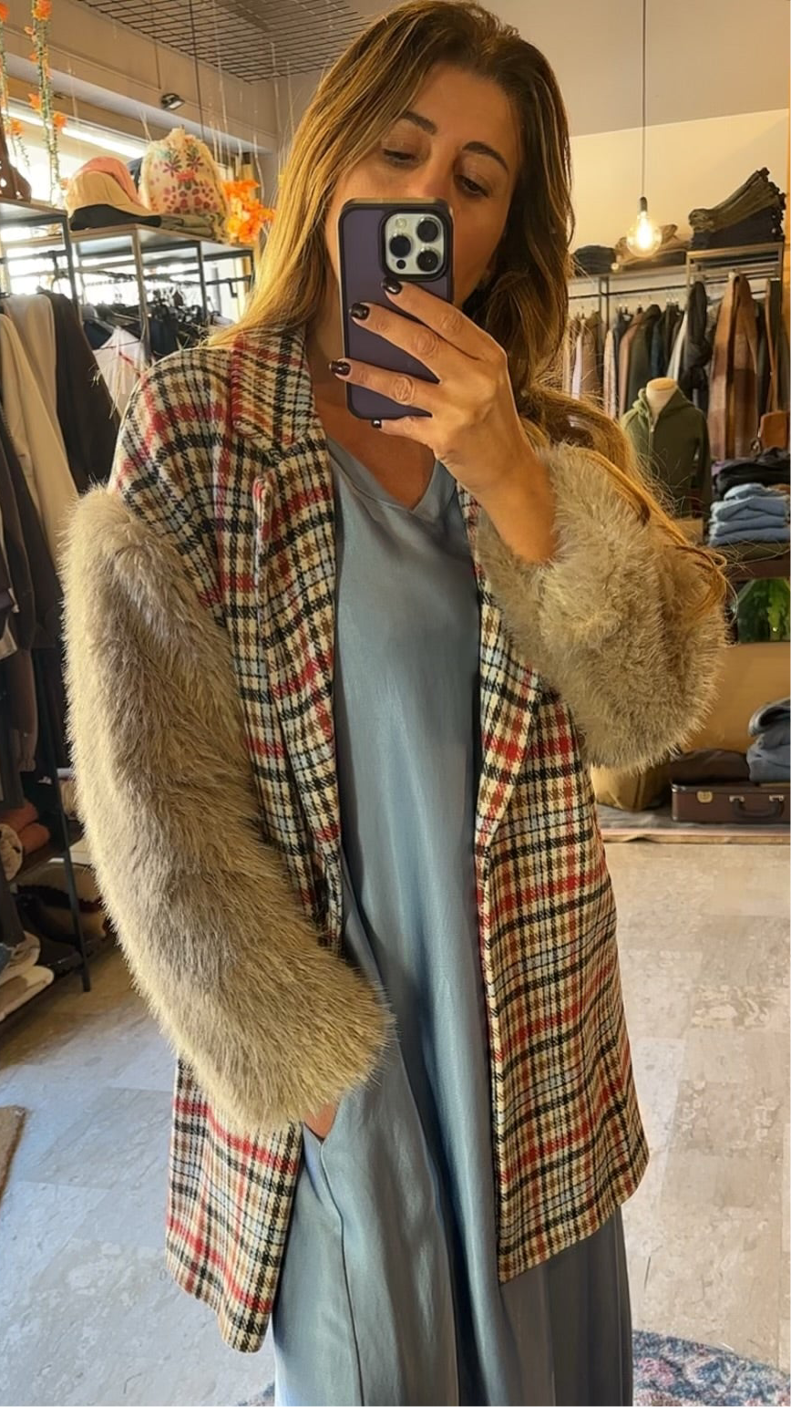 Descrizione: Cappotto Donna Scozzese con Maniche in Pelo. Collo a revers. Tasche a filetto. Chiusura frontale con bottone. Spalle scese, maniche lunghe in pelliccia.
