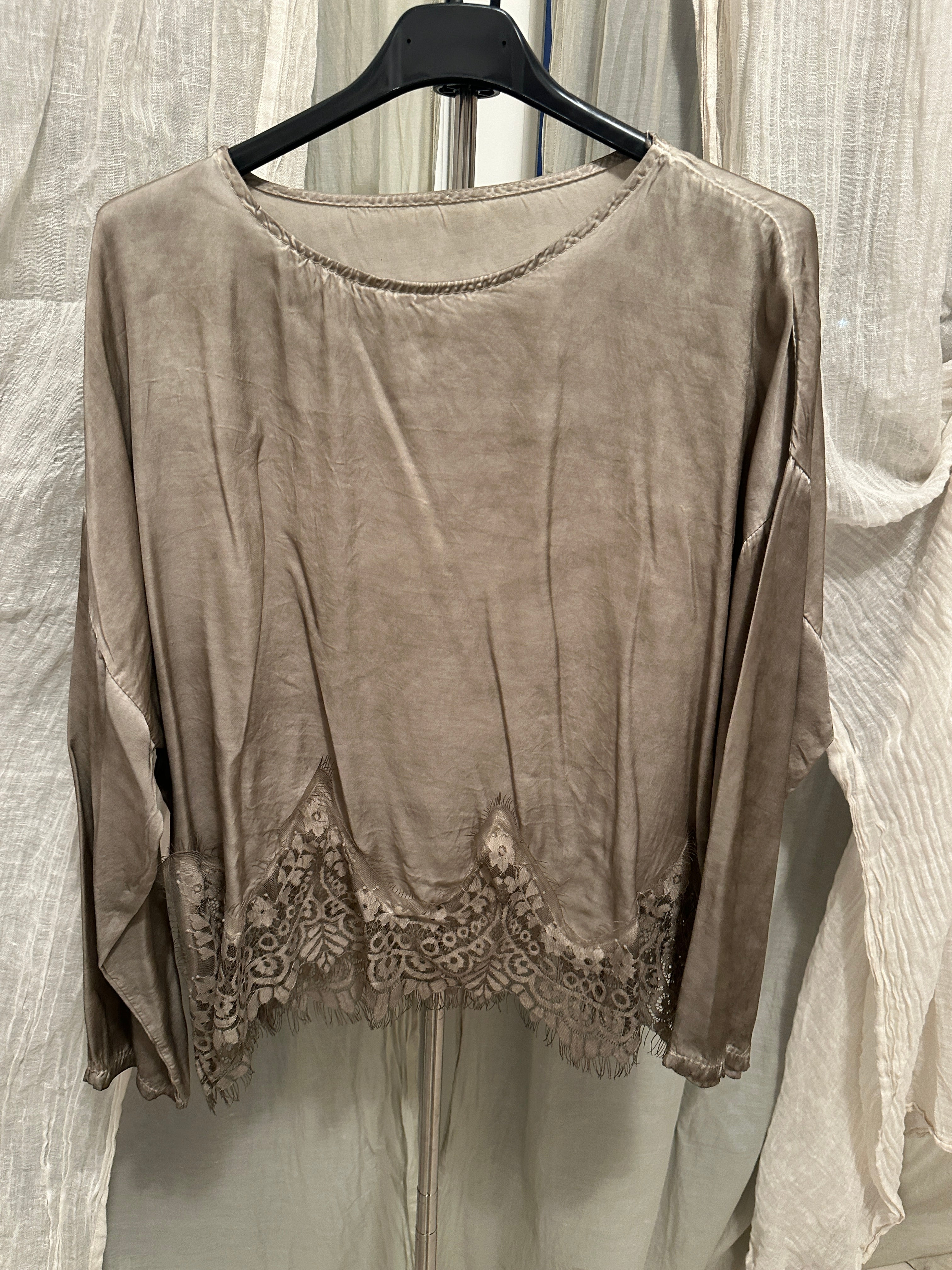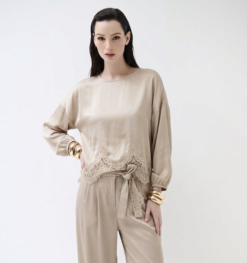 Descrizione: Casacca in raso di viscosa tinto capo con pizzo sul fondo. Girocollo. Manica lunga