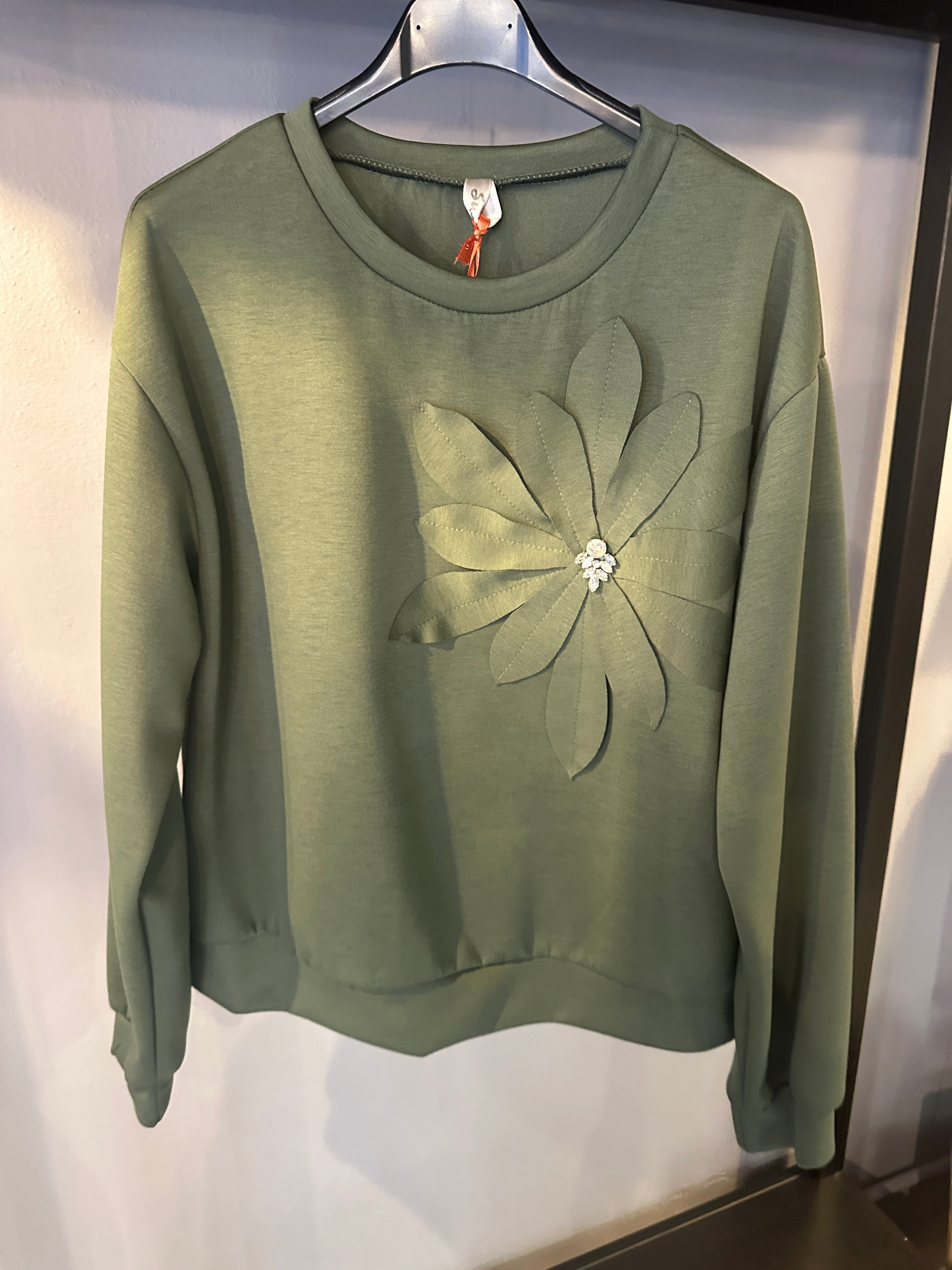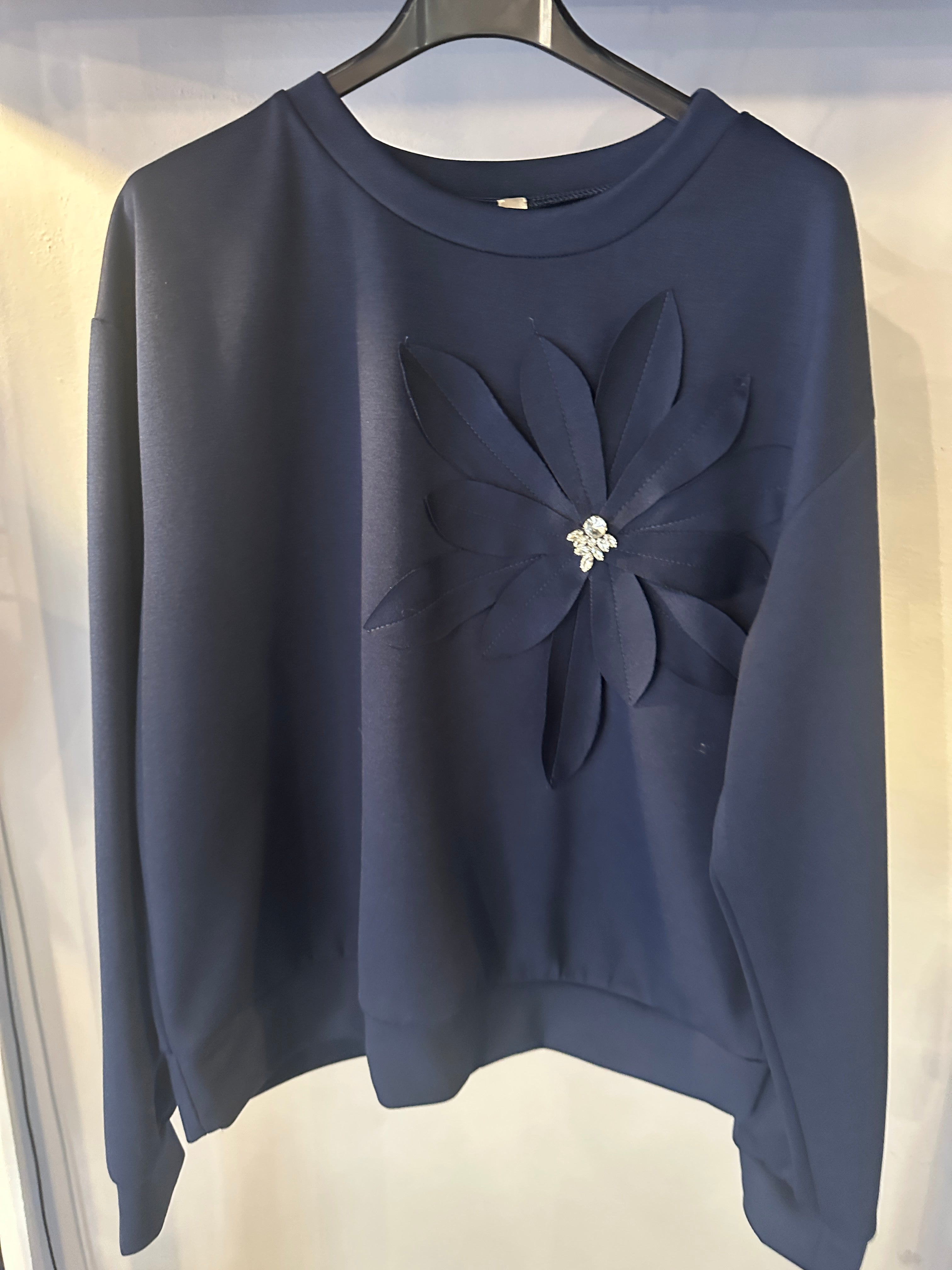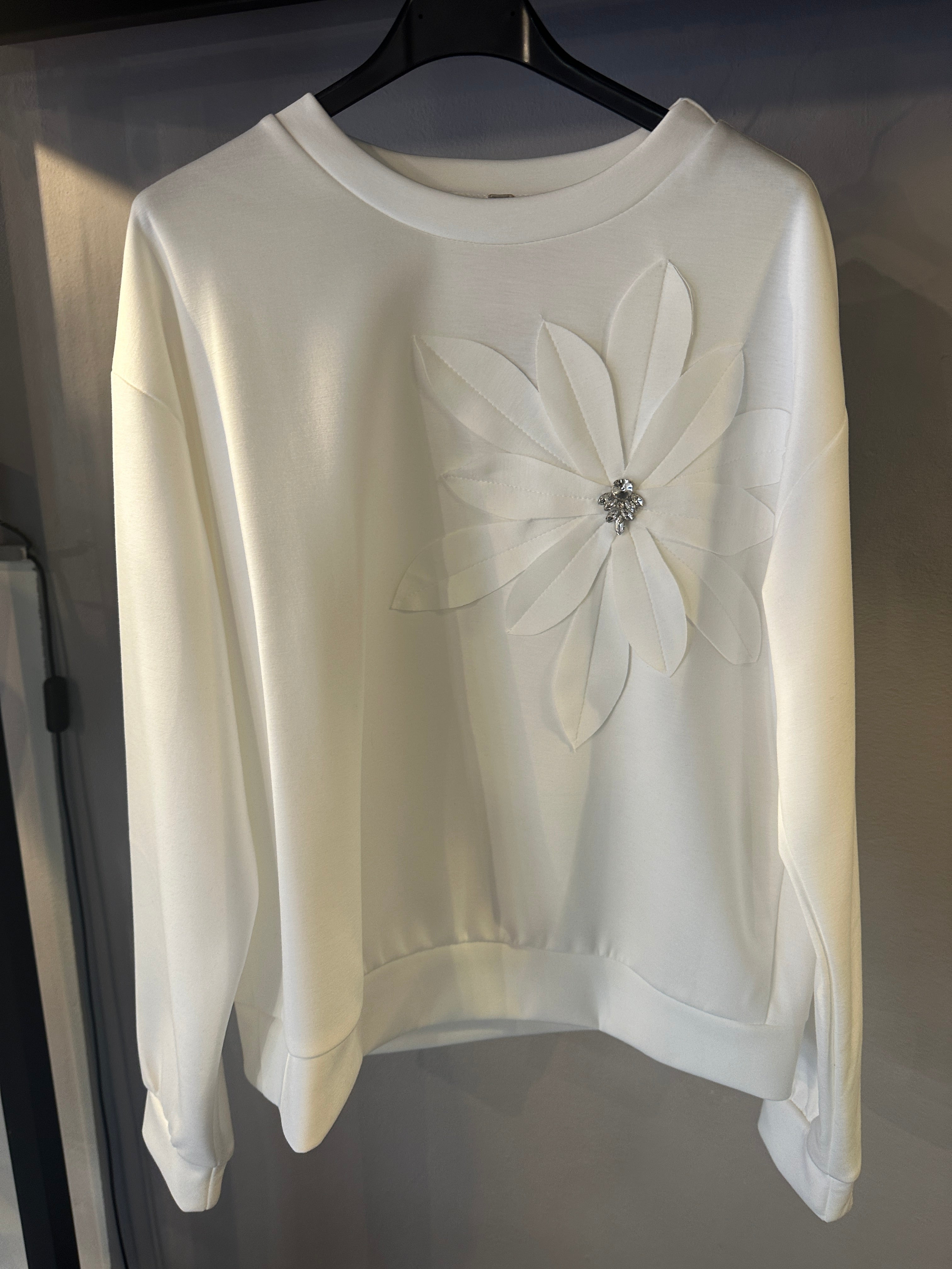 Descrizione: Felpa girocollo in tessuto tecnico. Scollo rotondo. Spalle scese e maniche lunghe con polsino. Fiore applicato con cabochon al centro