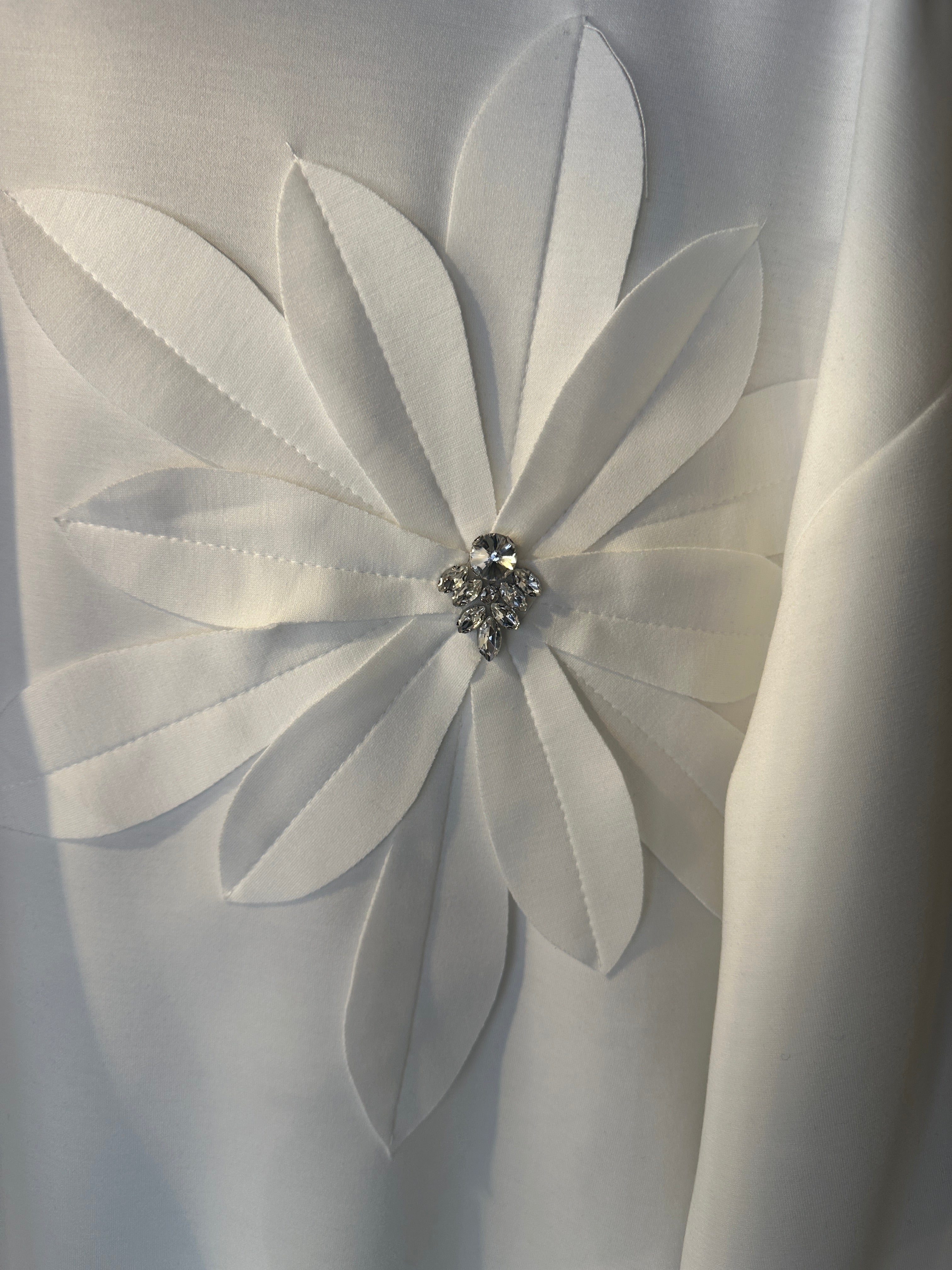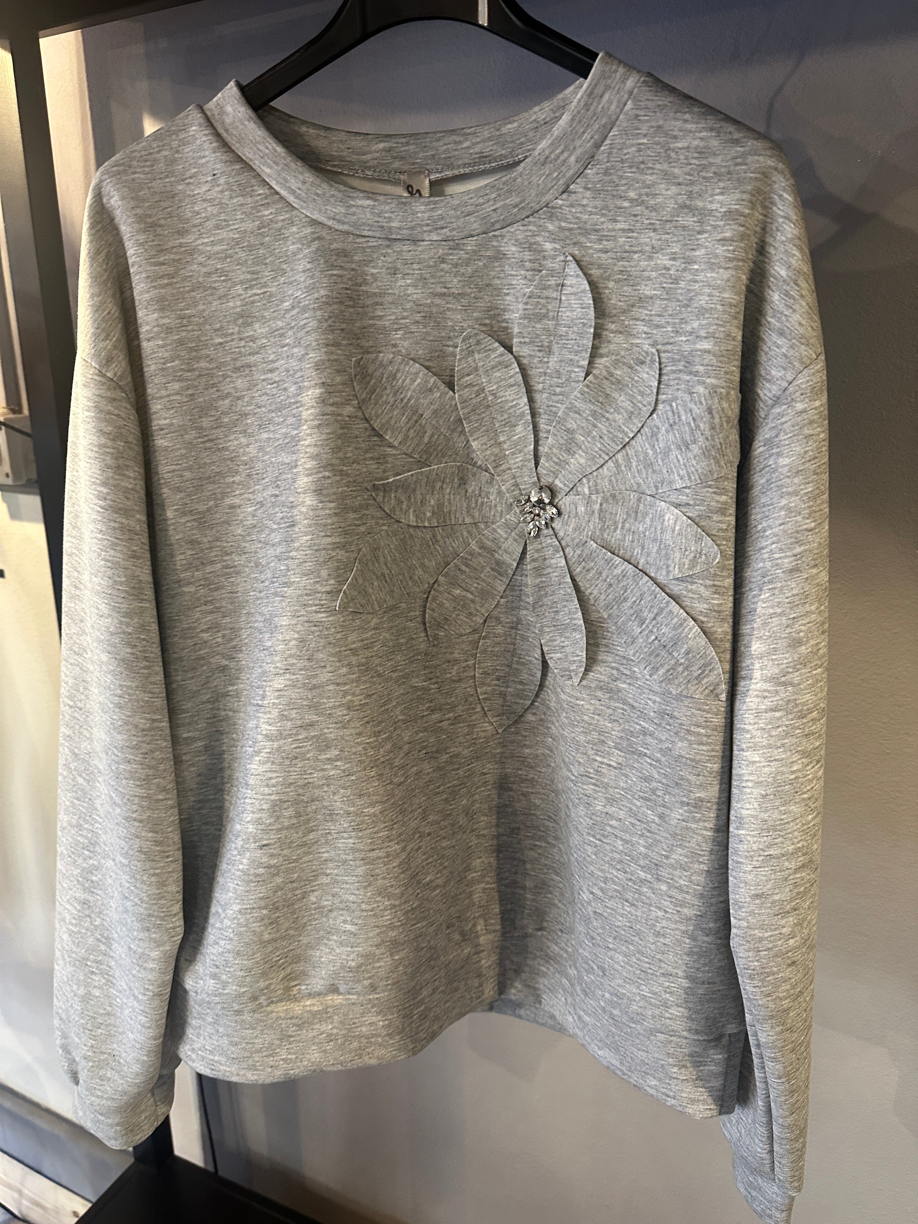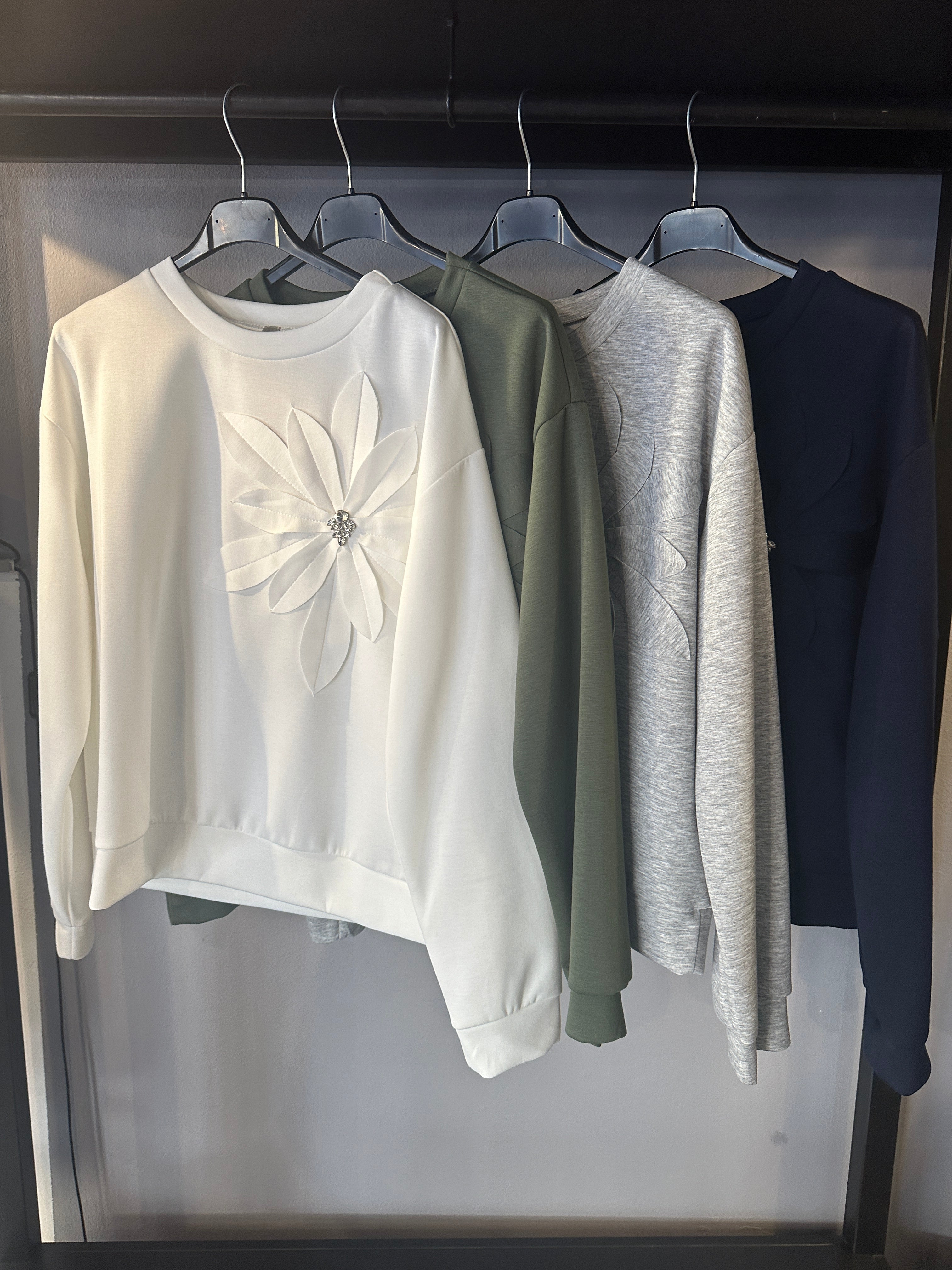 Descrizione: Felpa girocollo in tessuto tecnico. Scollo rotondo. Spalle scese e maniche lunghe con polsino. Fiore applicato con cabochon al centro