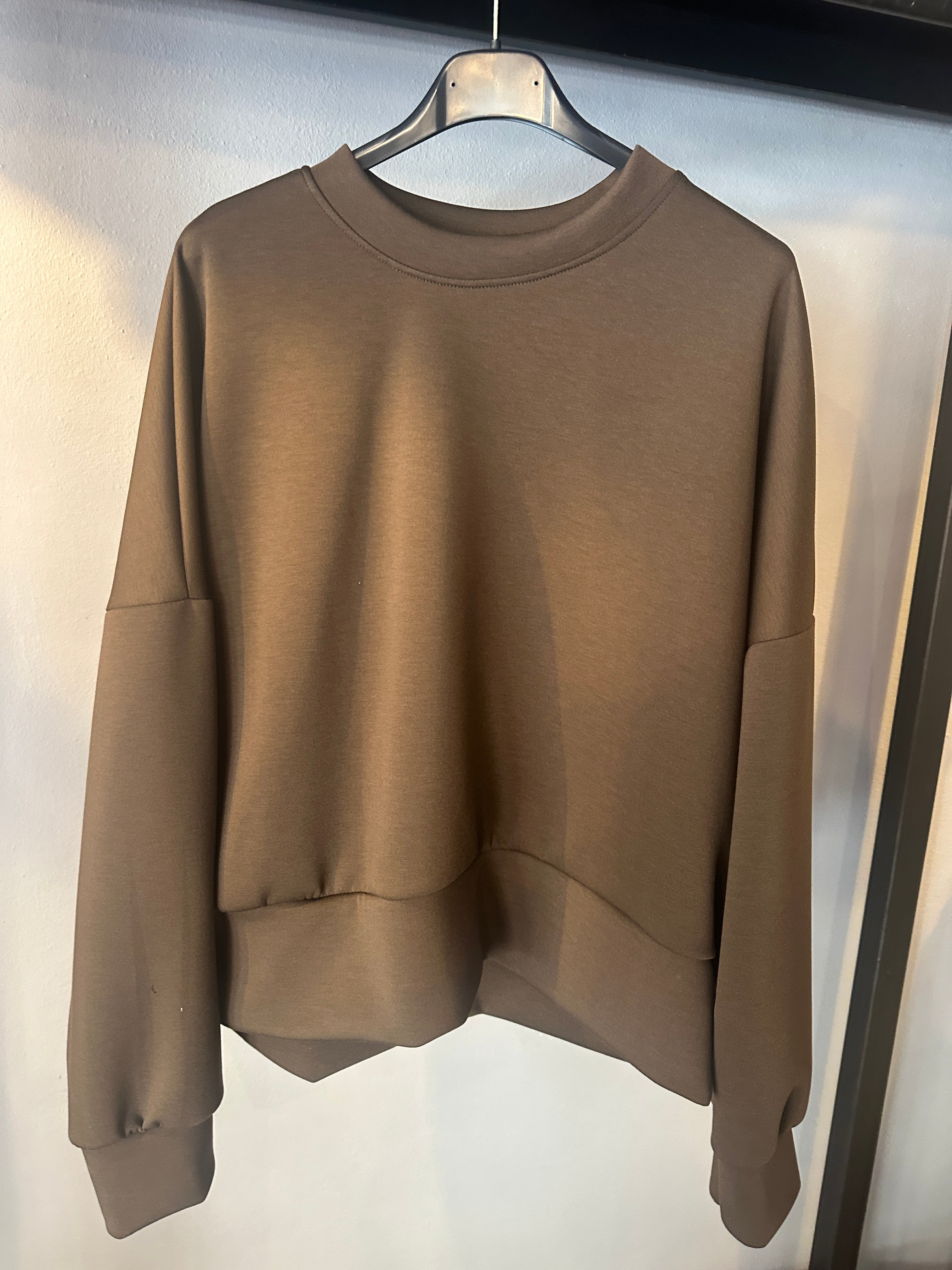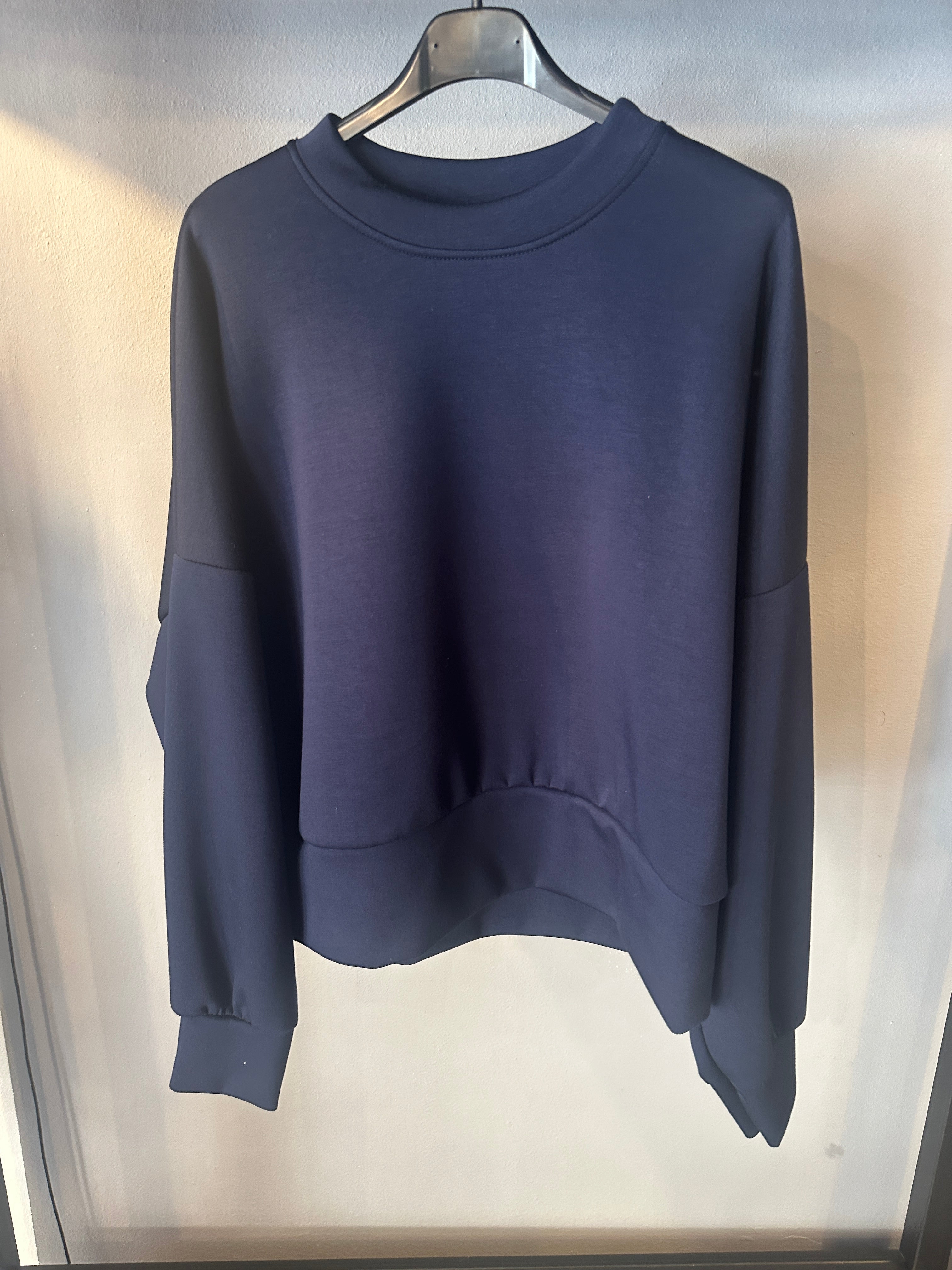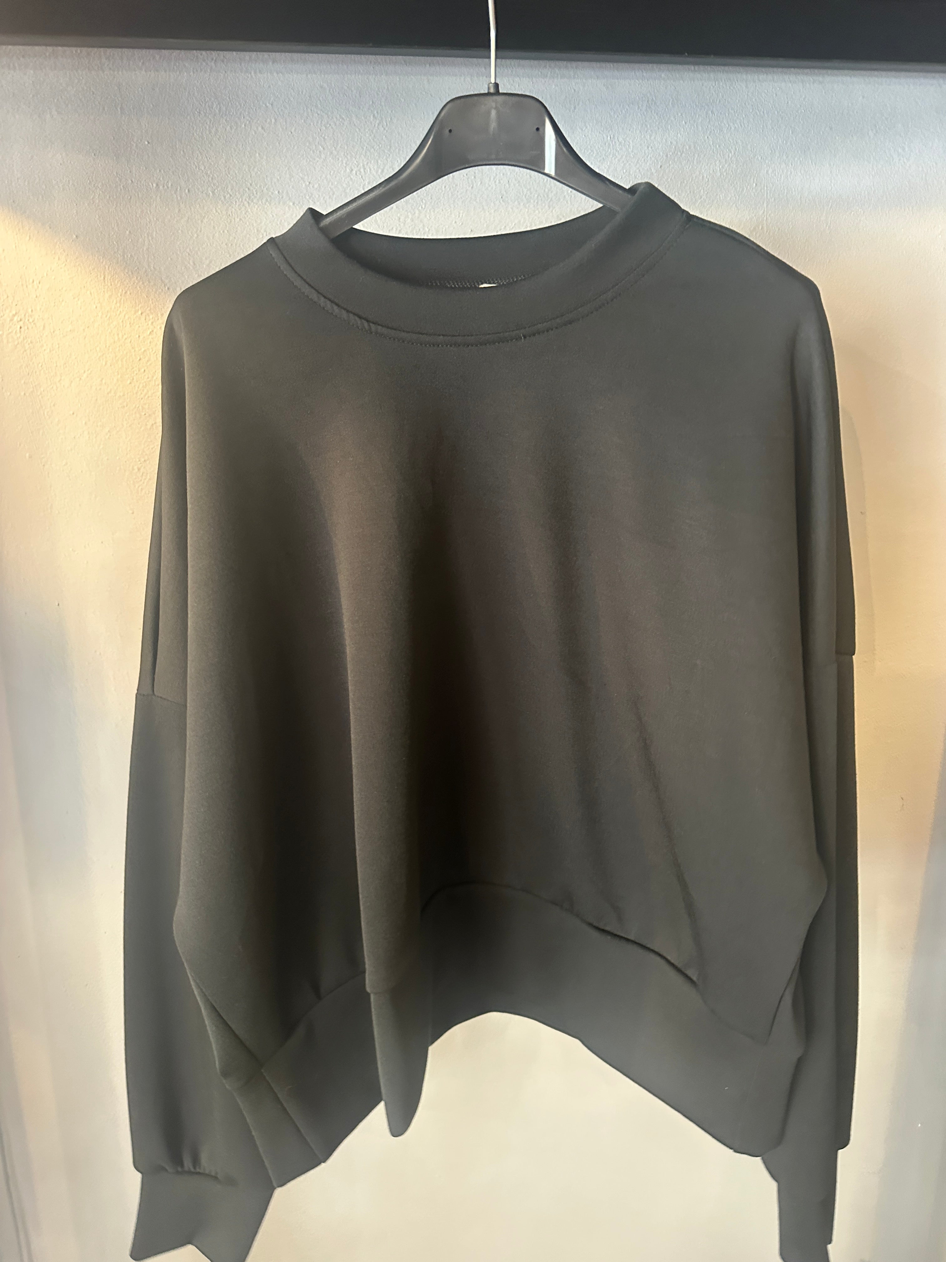 Descrizione: Felpa girocollo in tessuto tecnico. Scollo rotondo. Spalle scese e maniche lunghe con polsino. Fondo con fascione alto