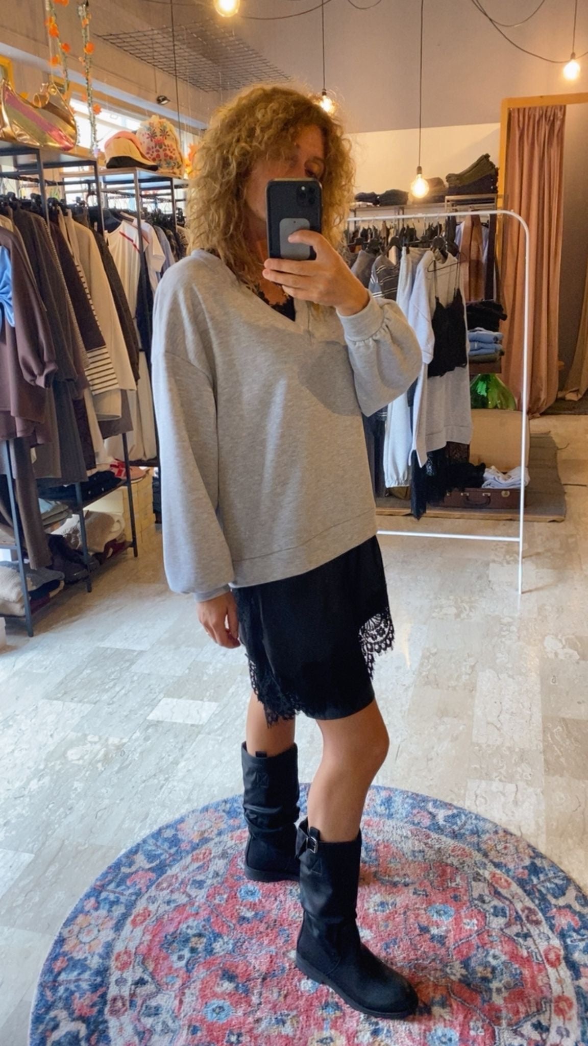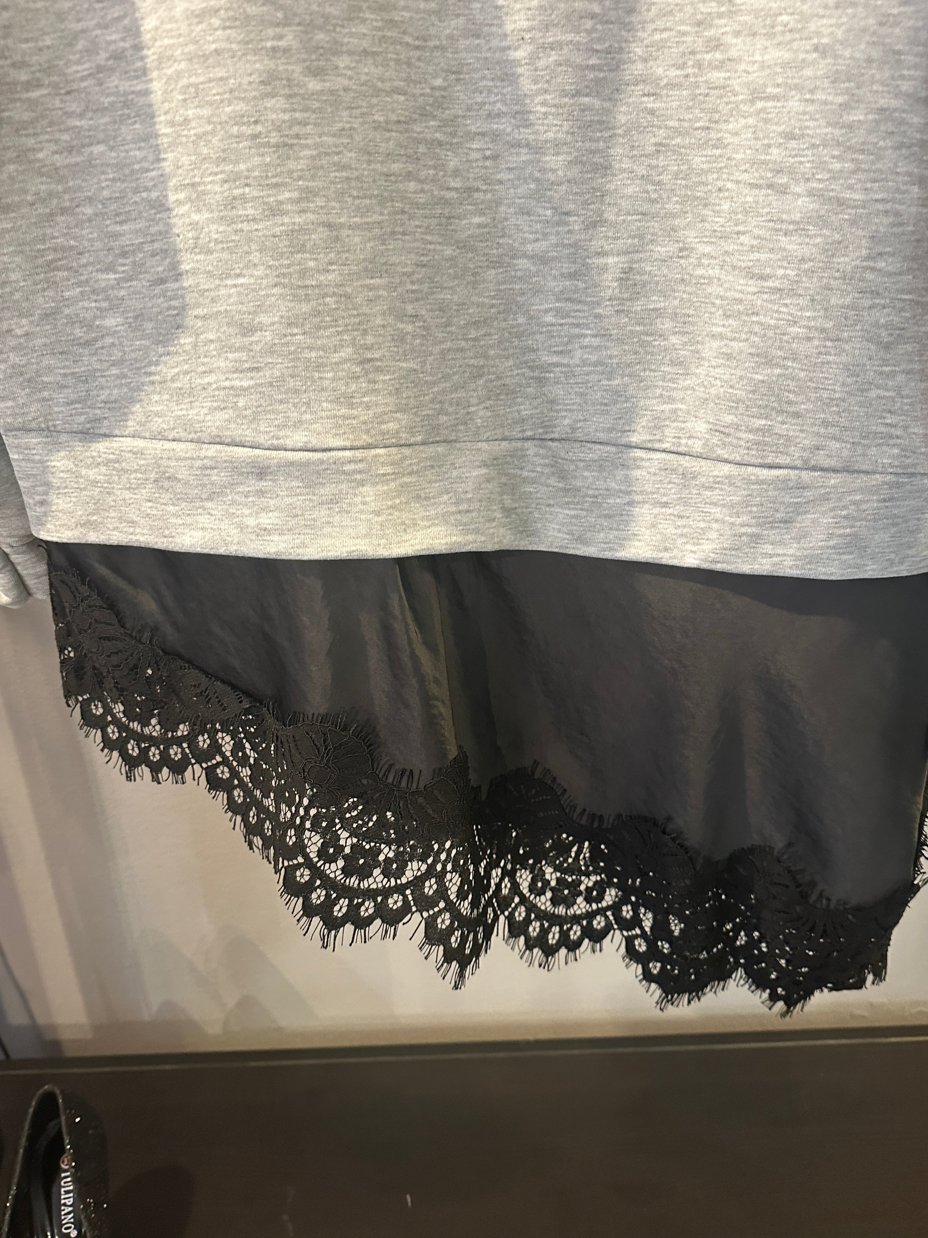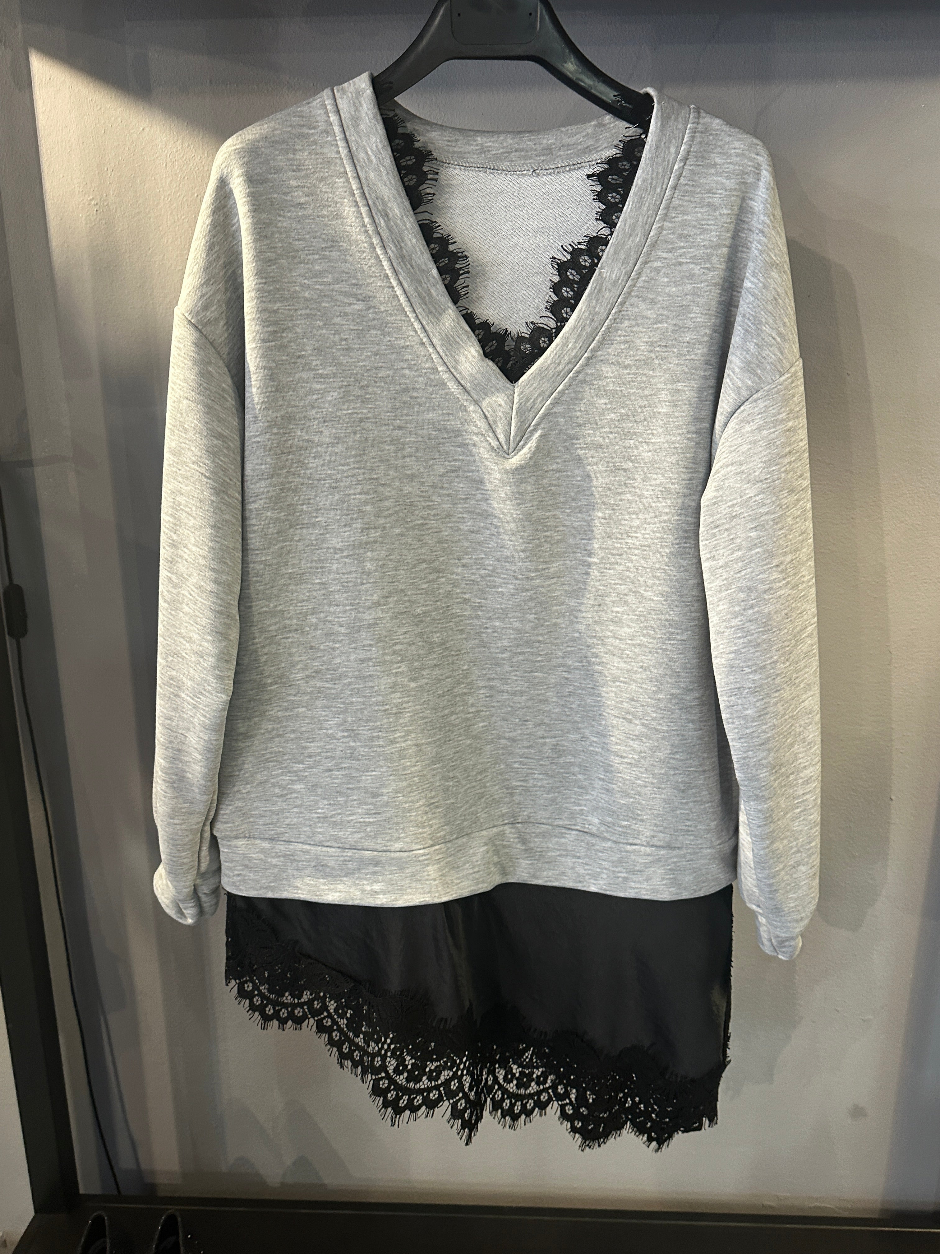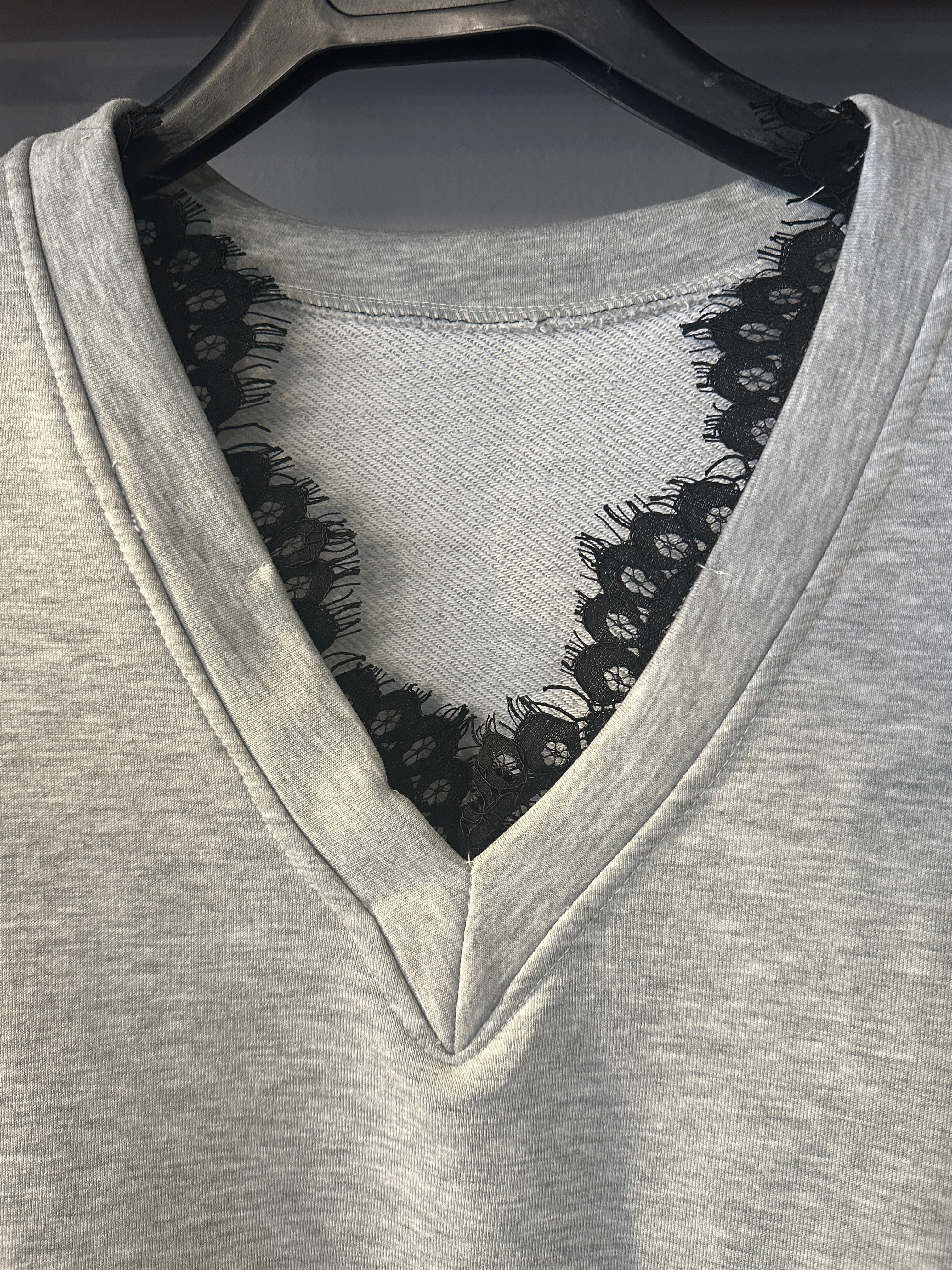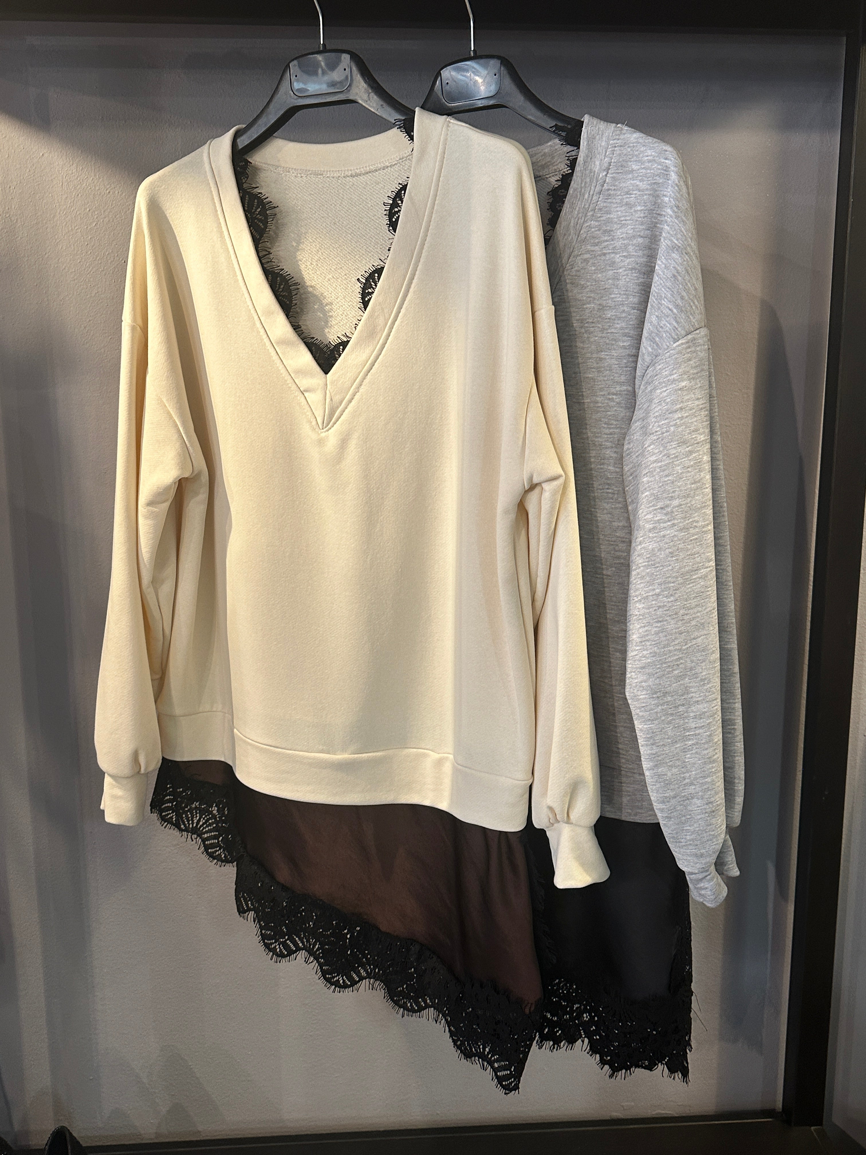 Descrizione: Felpa Donna con Pizzo. Scollo a V con pizzo nello scollo, manica lunga con polsino. Fondo con balza asimmetrica in pizzo