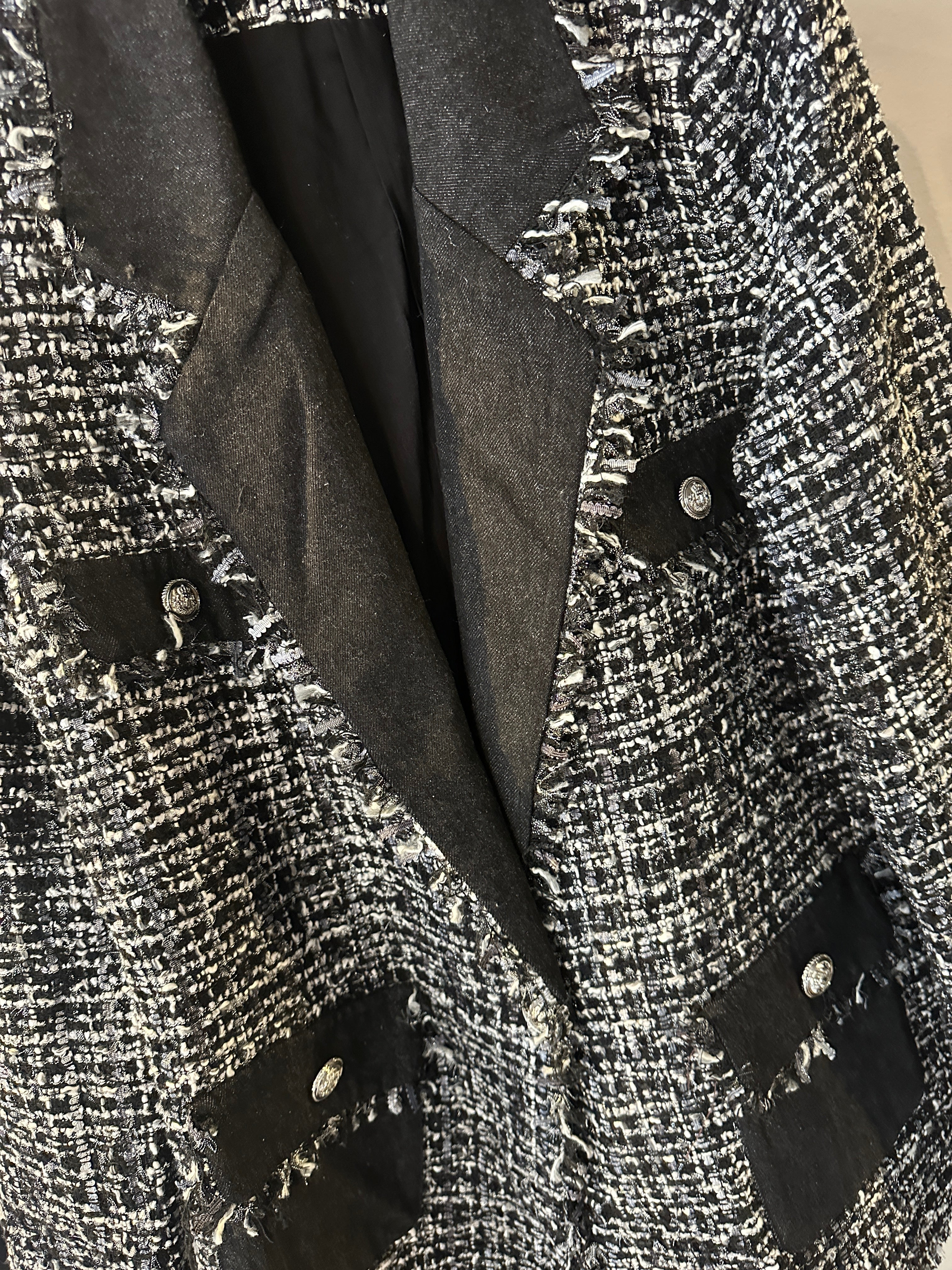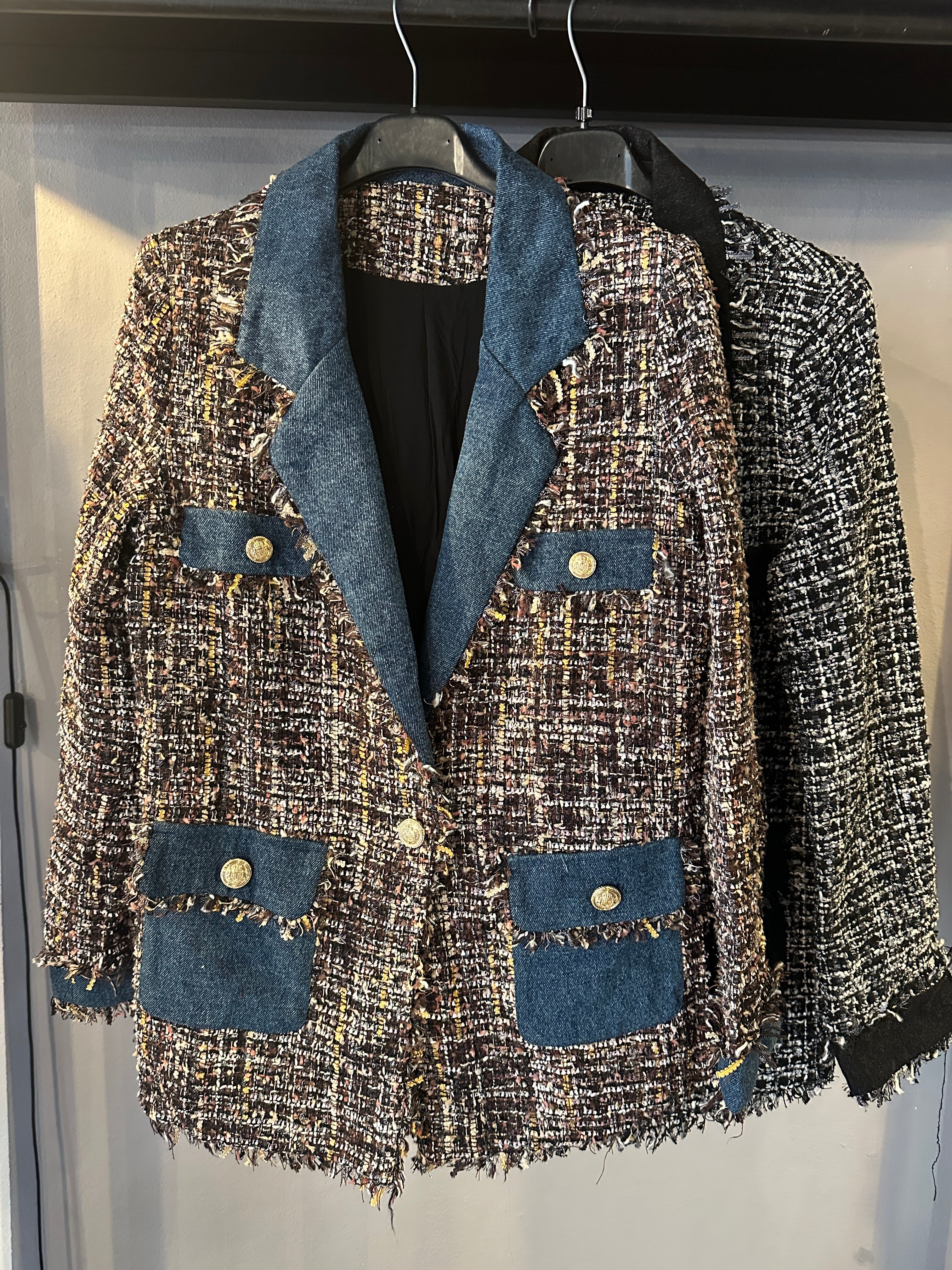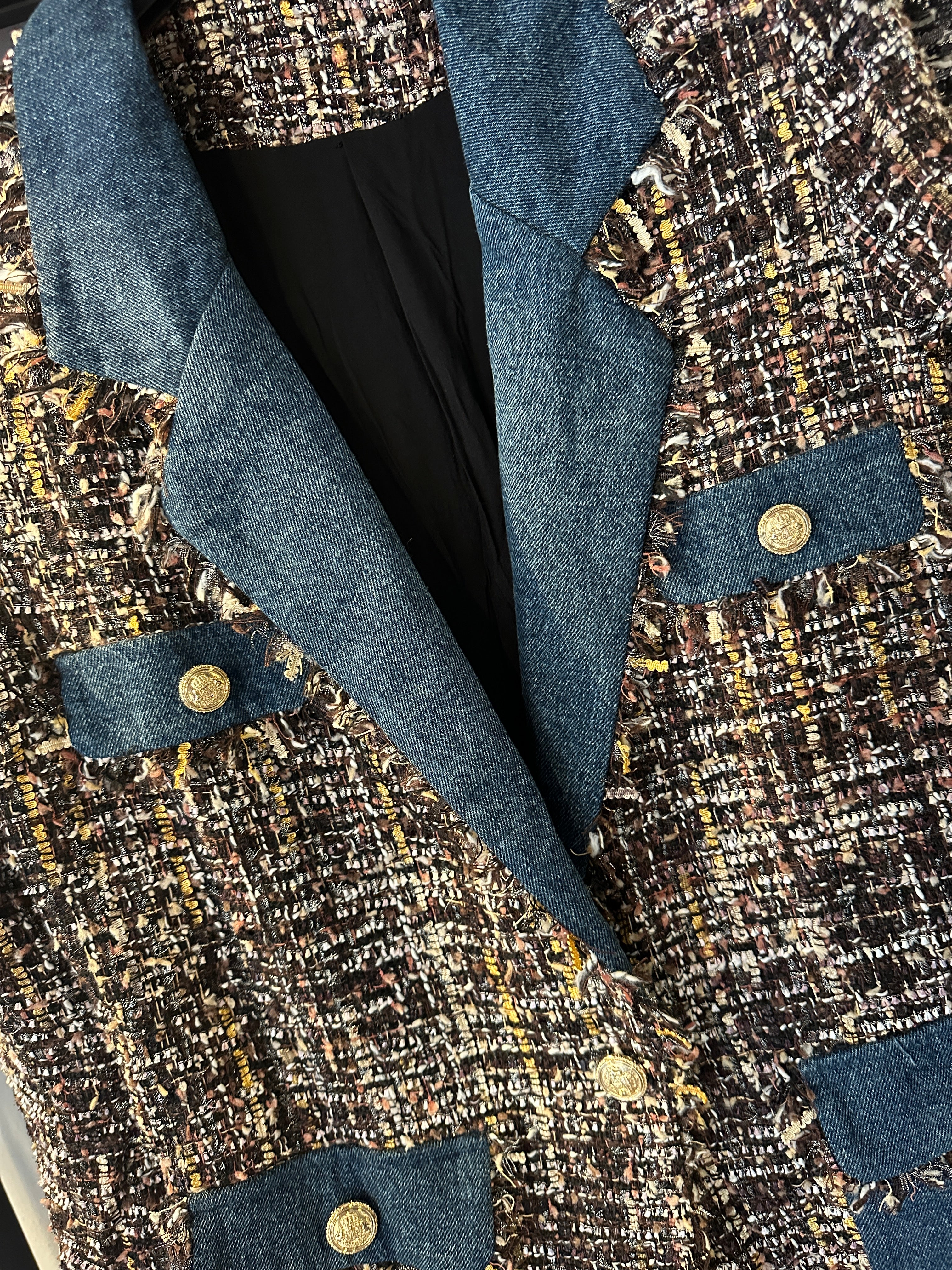 Descrizione: Giacca Donna in Tessuto Chanel e denim. Collo reverse in denim. Tasche applicate e maniche lunghe con polsino in denim