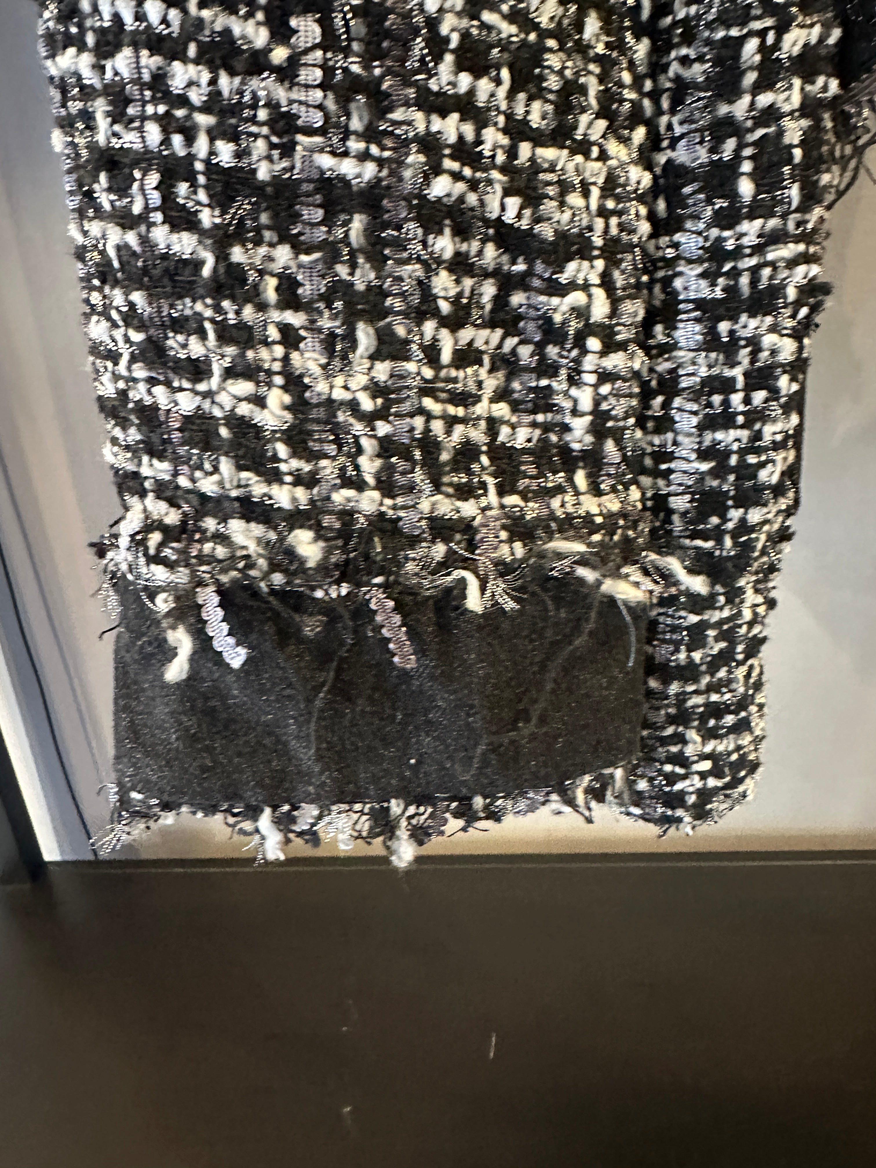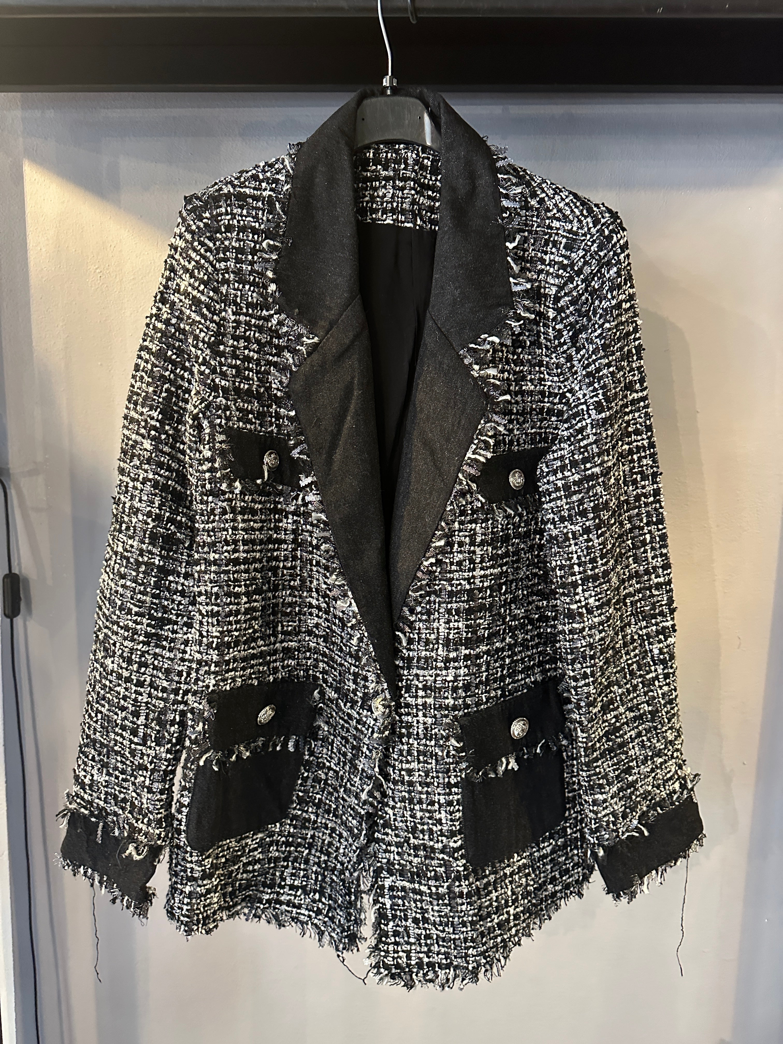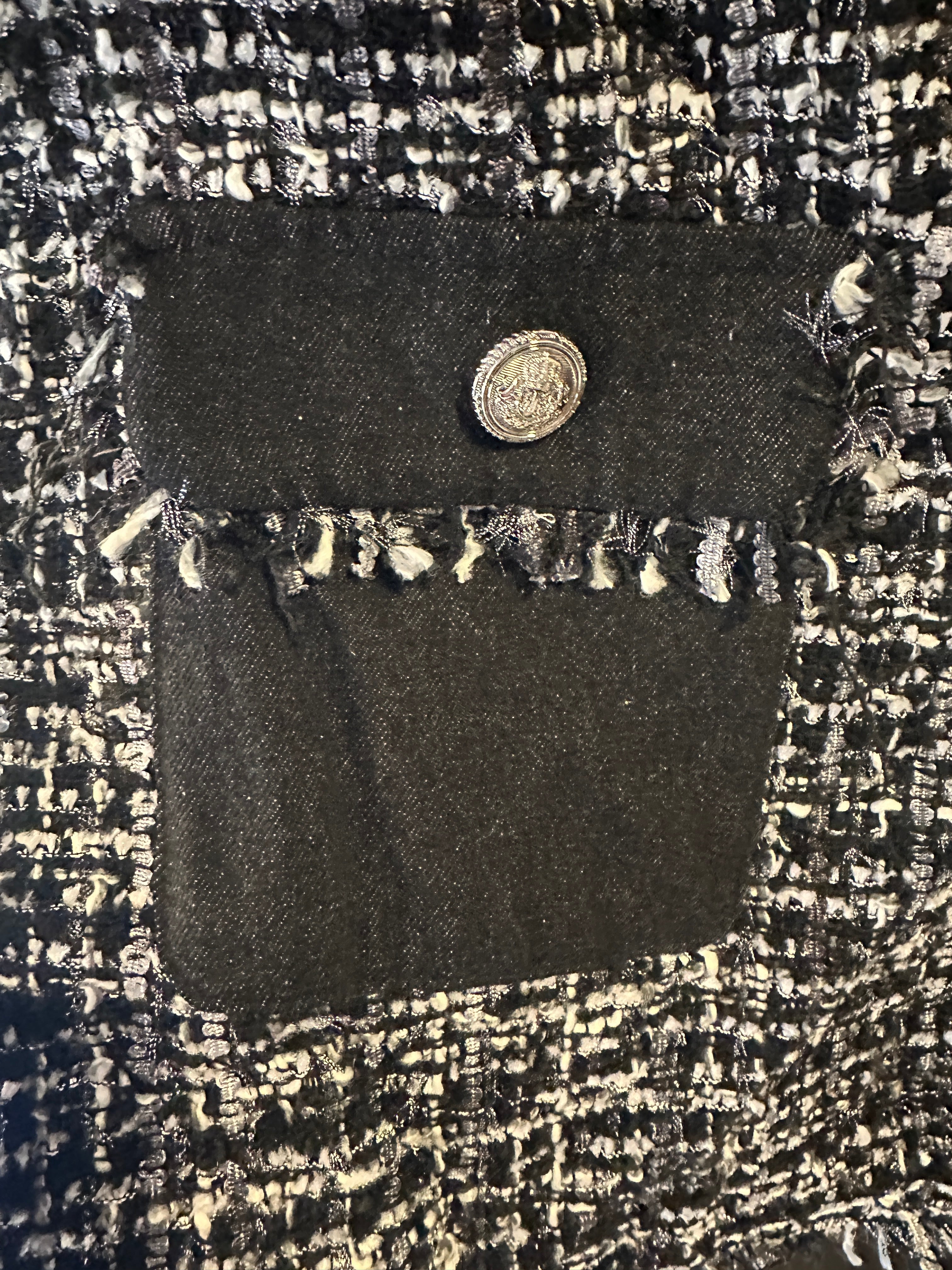 Descrizione: Giacca Donna in Tessuto Chanel e denim. Collo reverse in denim. Tasche applicate e maniche lunghe con polsino in denim