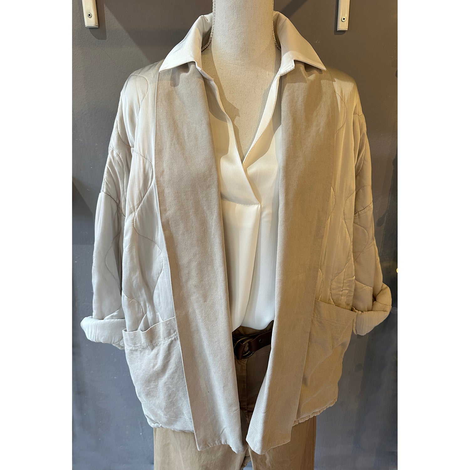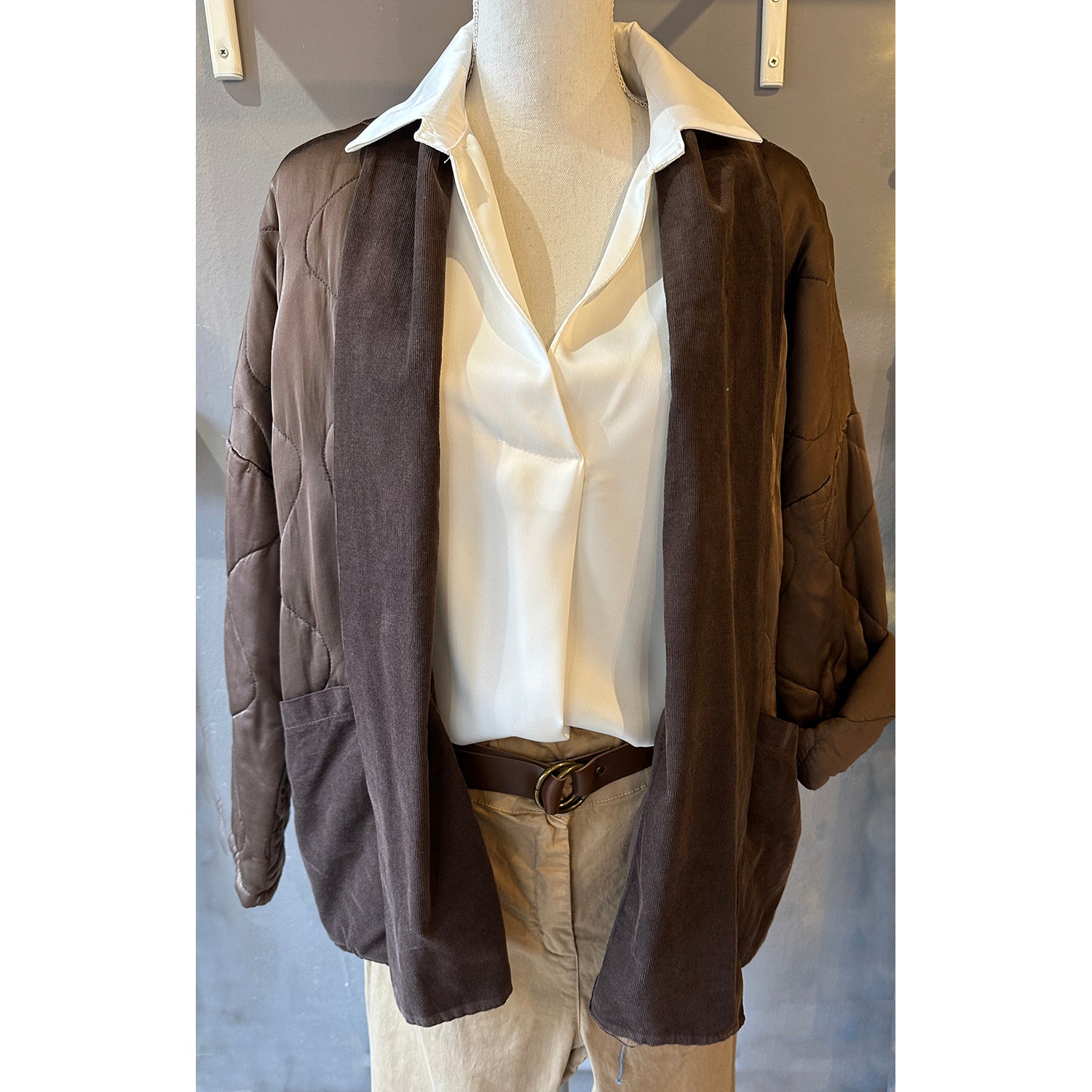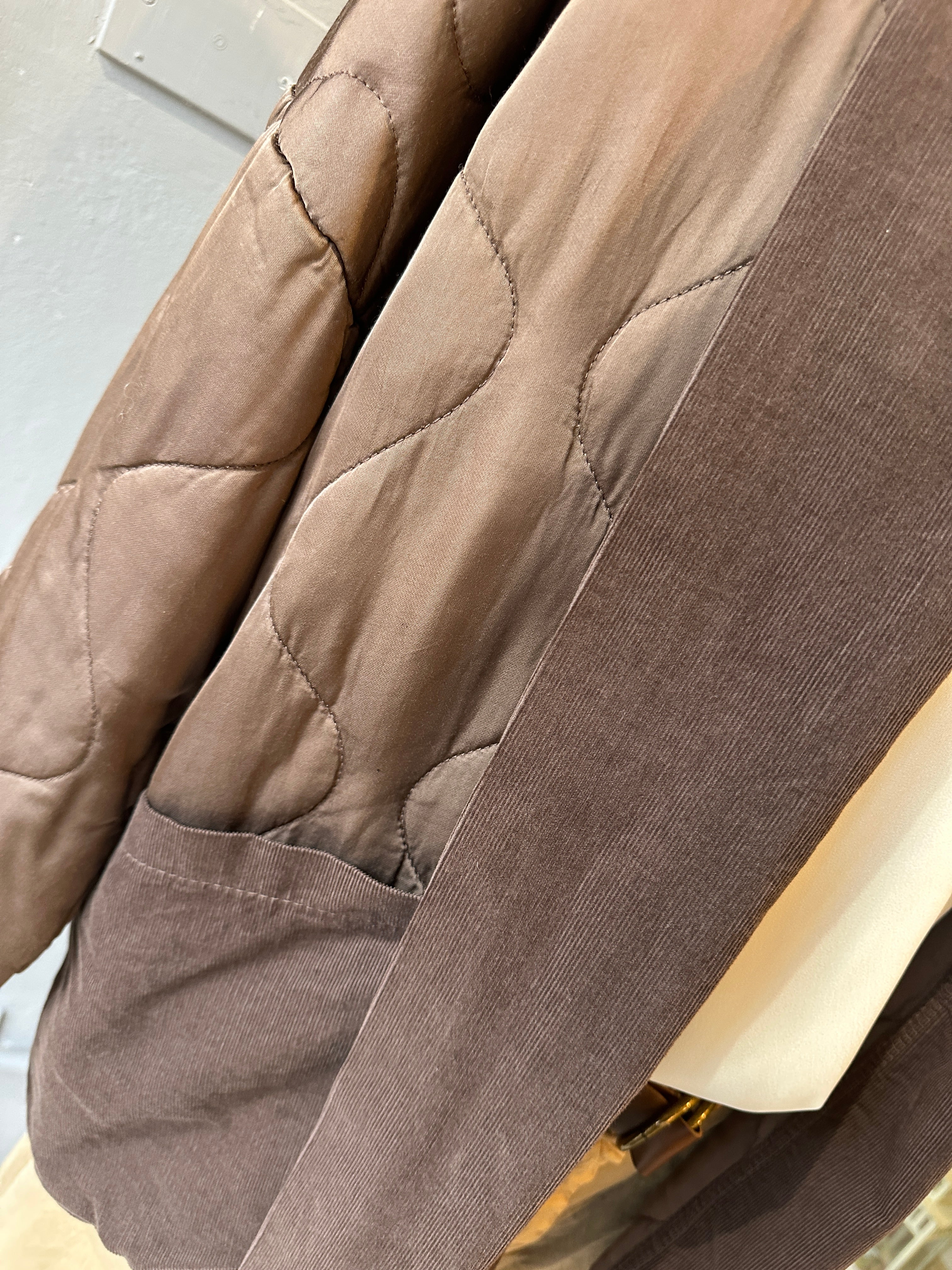 Descrizione: Giacca in Raso di Viscosa Imbottita. Collo sciallato e tasche in velluto millerighe. Spalla calata e maniche lunghe.