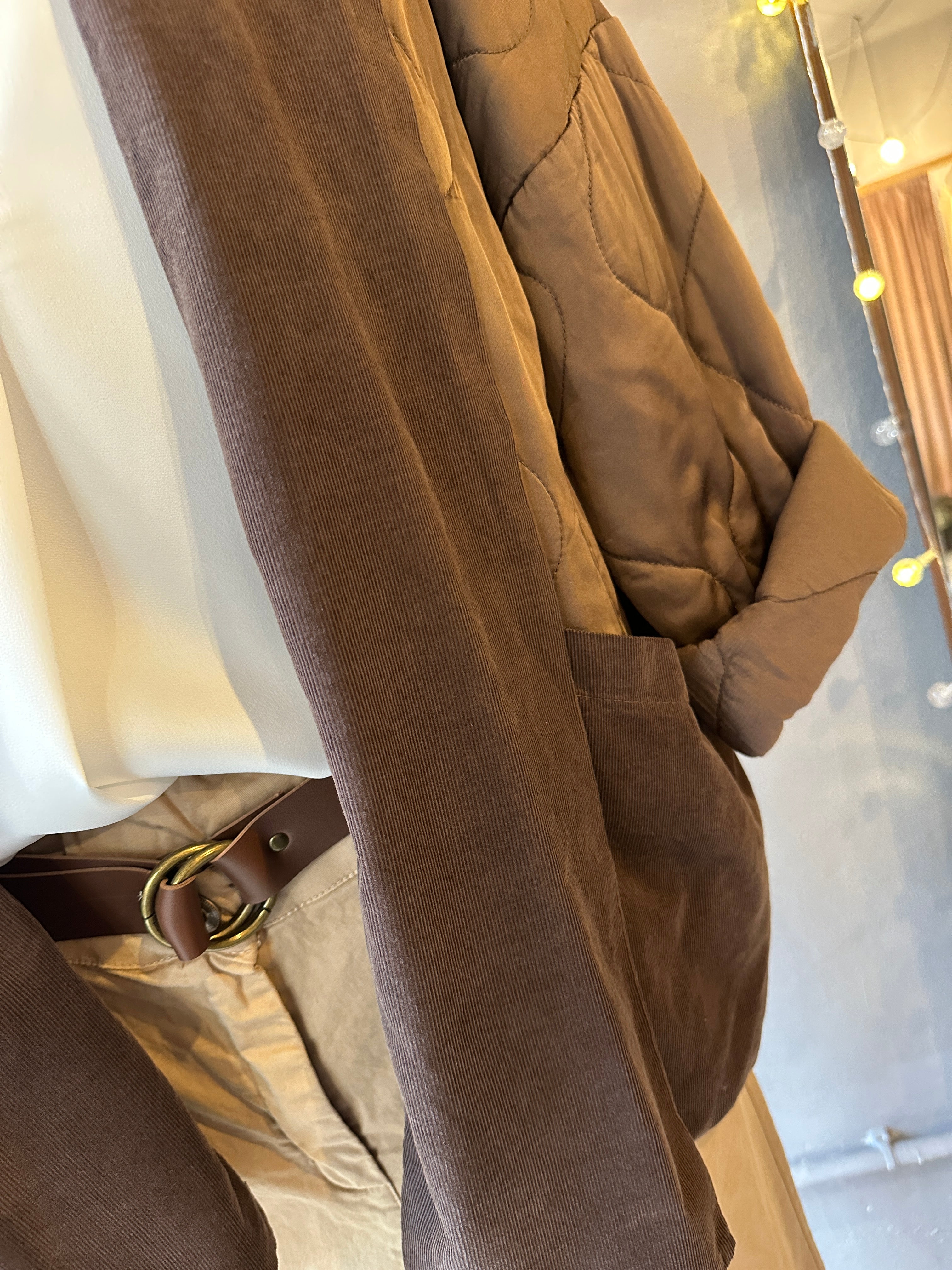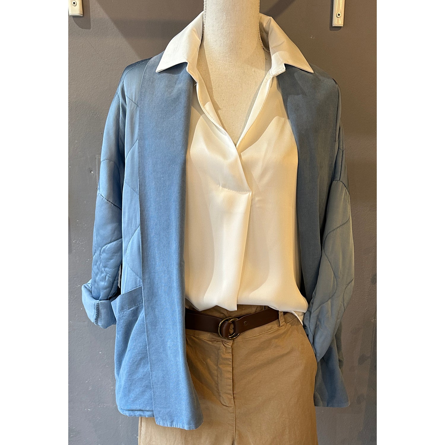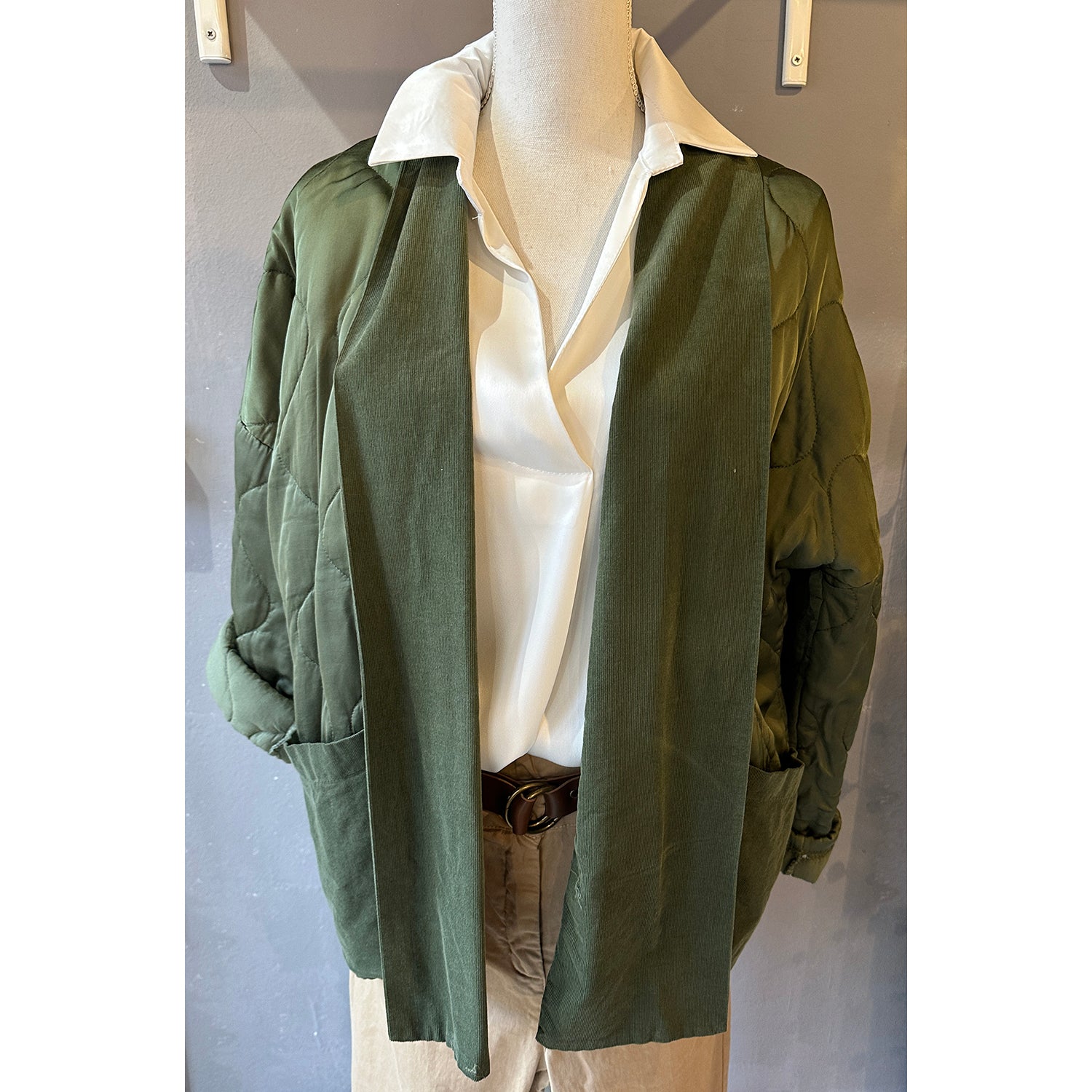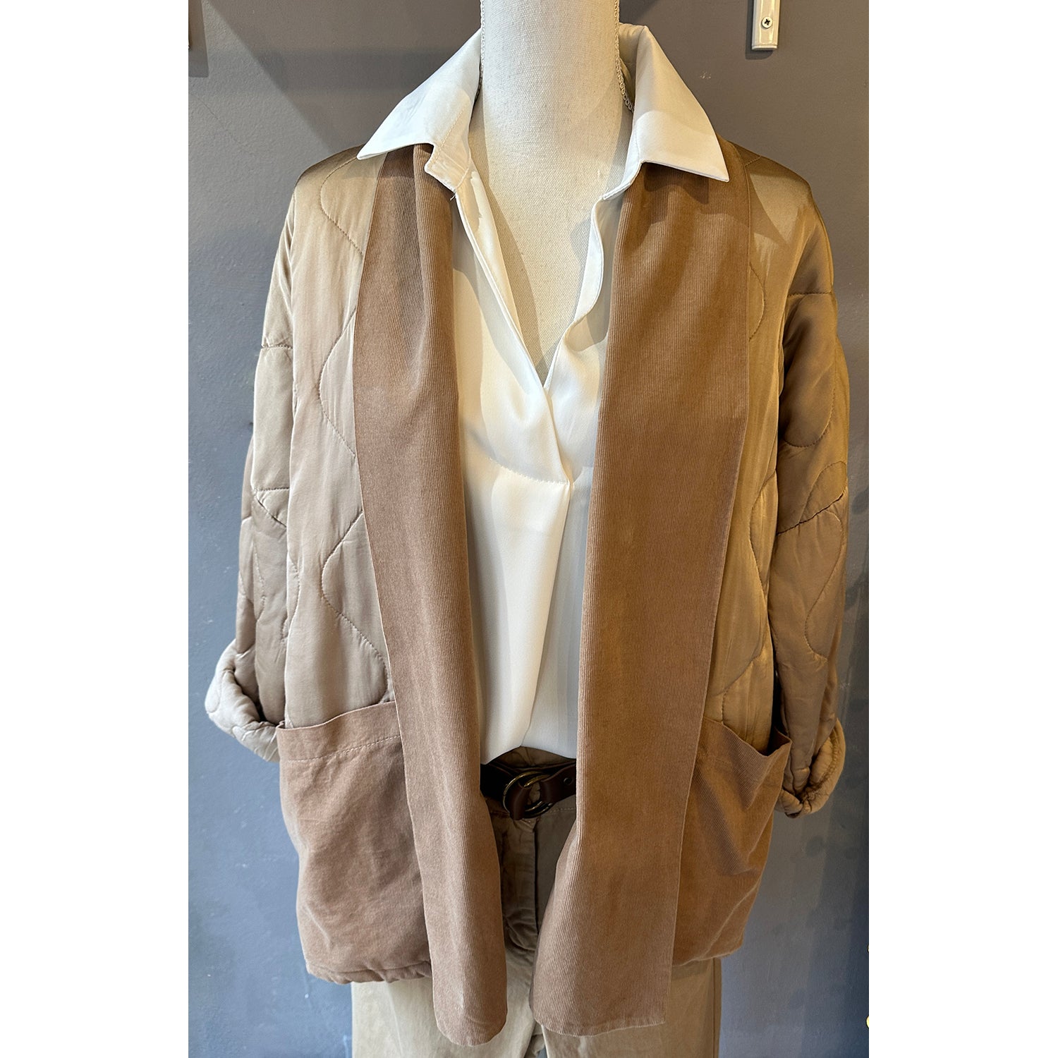 Descrizione: Giacca in Raso di Viscosa Imbottita. Collo sciallato e tasche in velluto millerighe. Spalla calata e maniche lunghe.