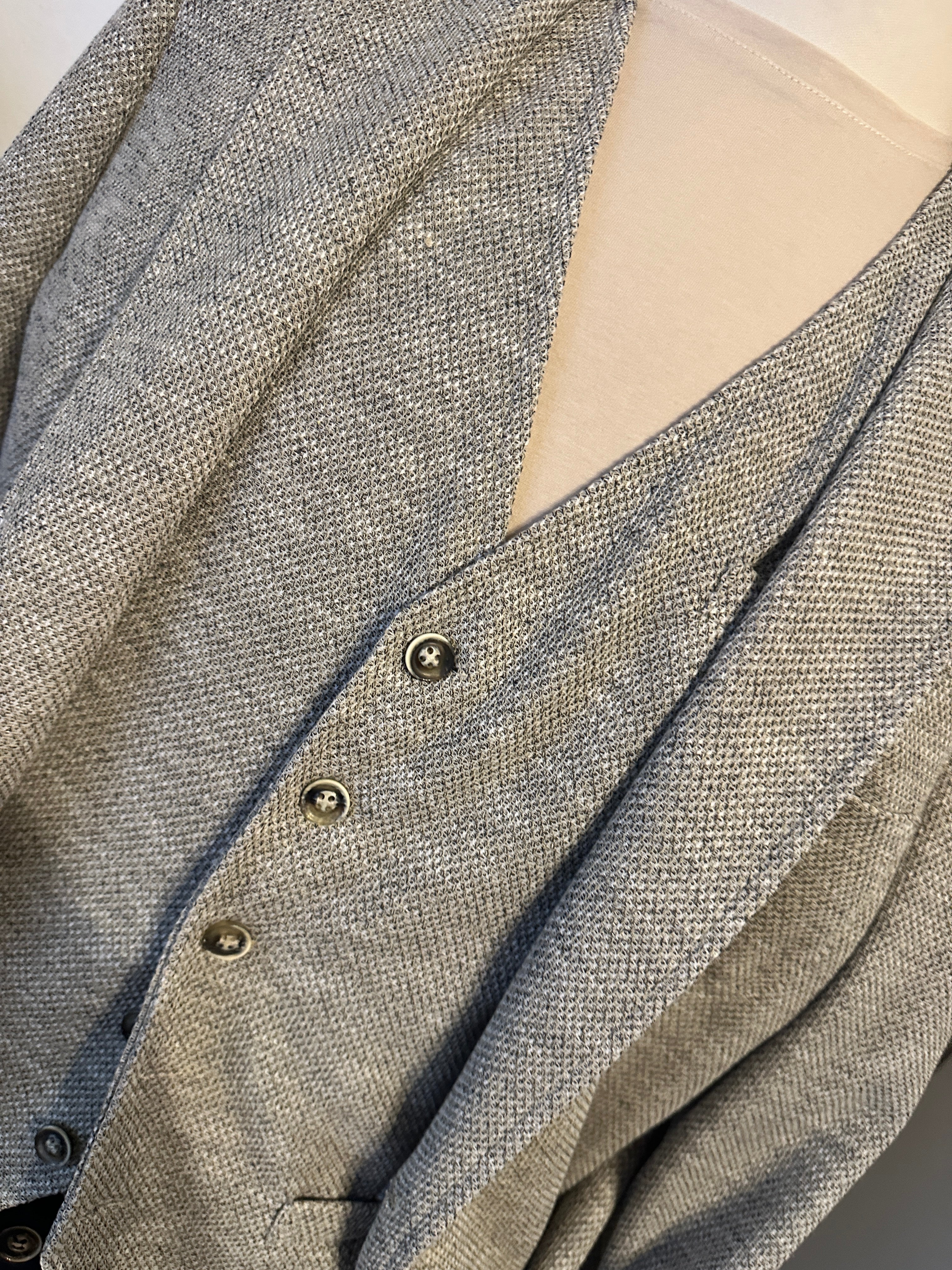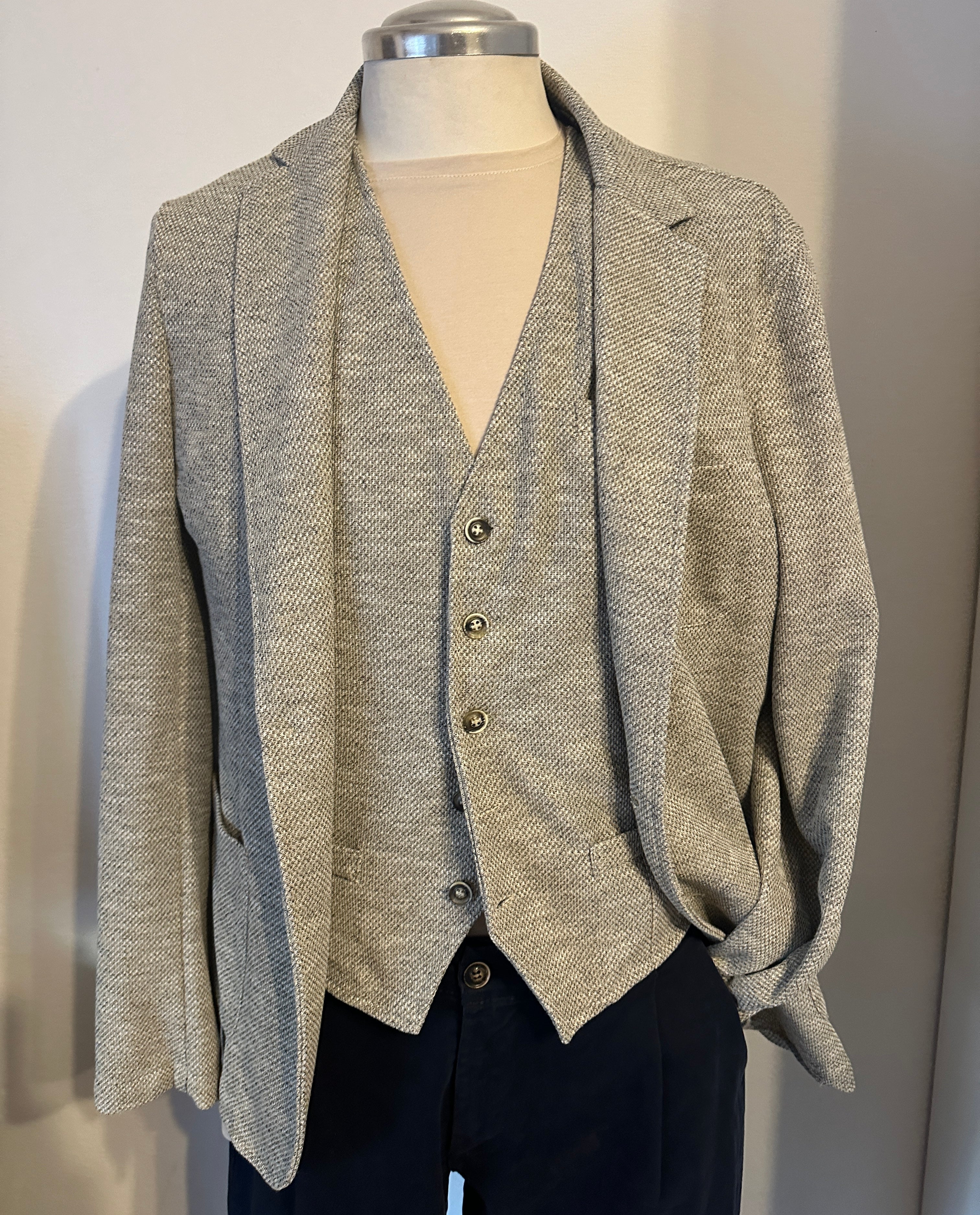Descrizione: Giacca uomo tessuto sale e pepe . Chiusura frontale con bottoni, taschino
