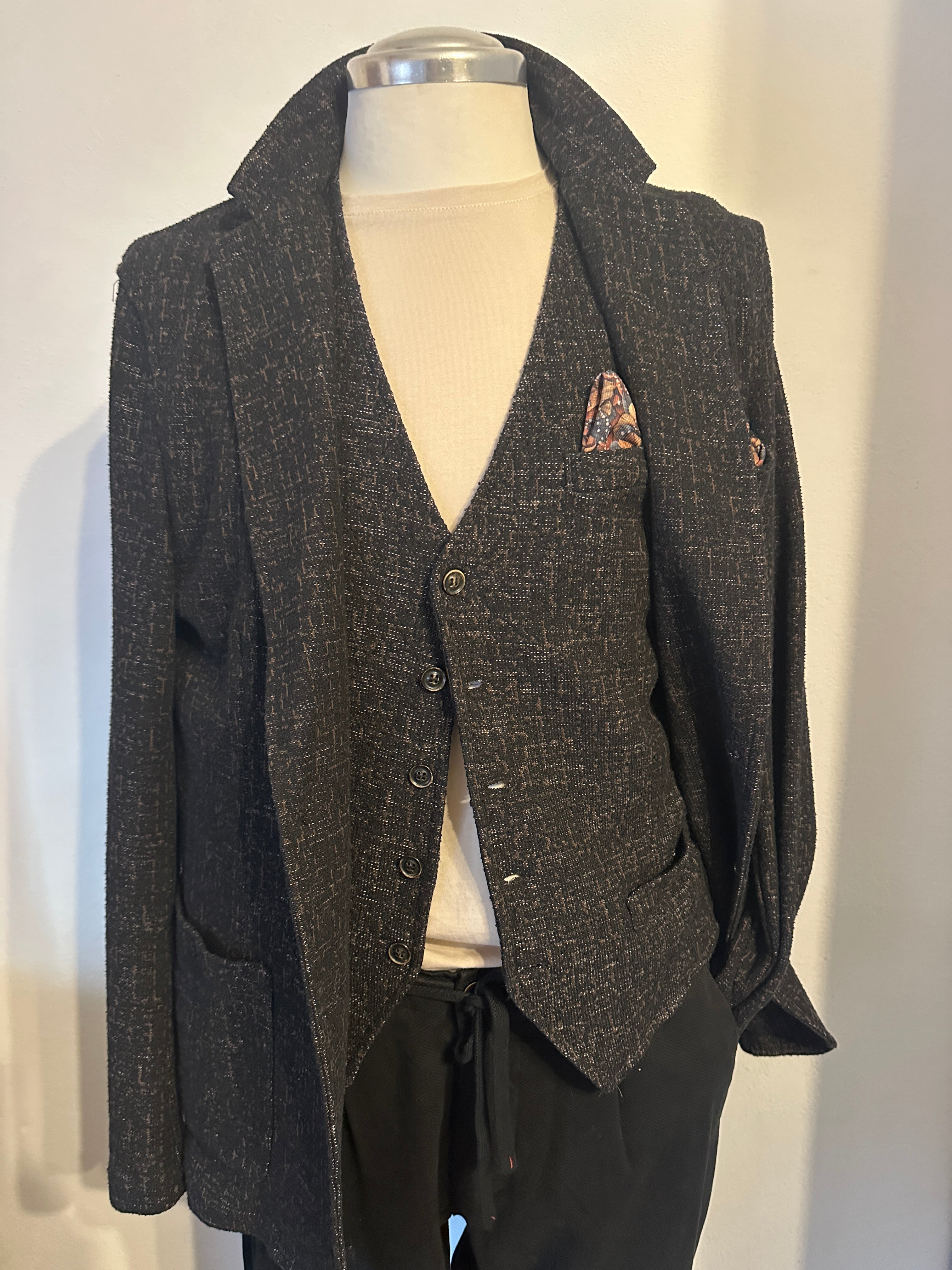 Descrizione: Gilet uomo in maglia lavorata. Chiusura frontale con bottoni, taschino con finta pochette.