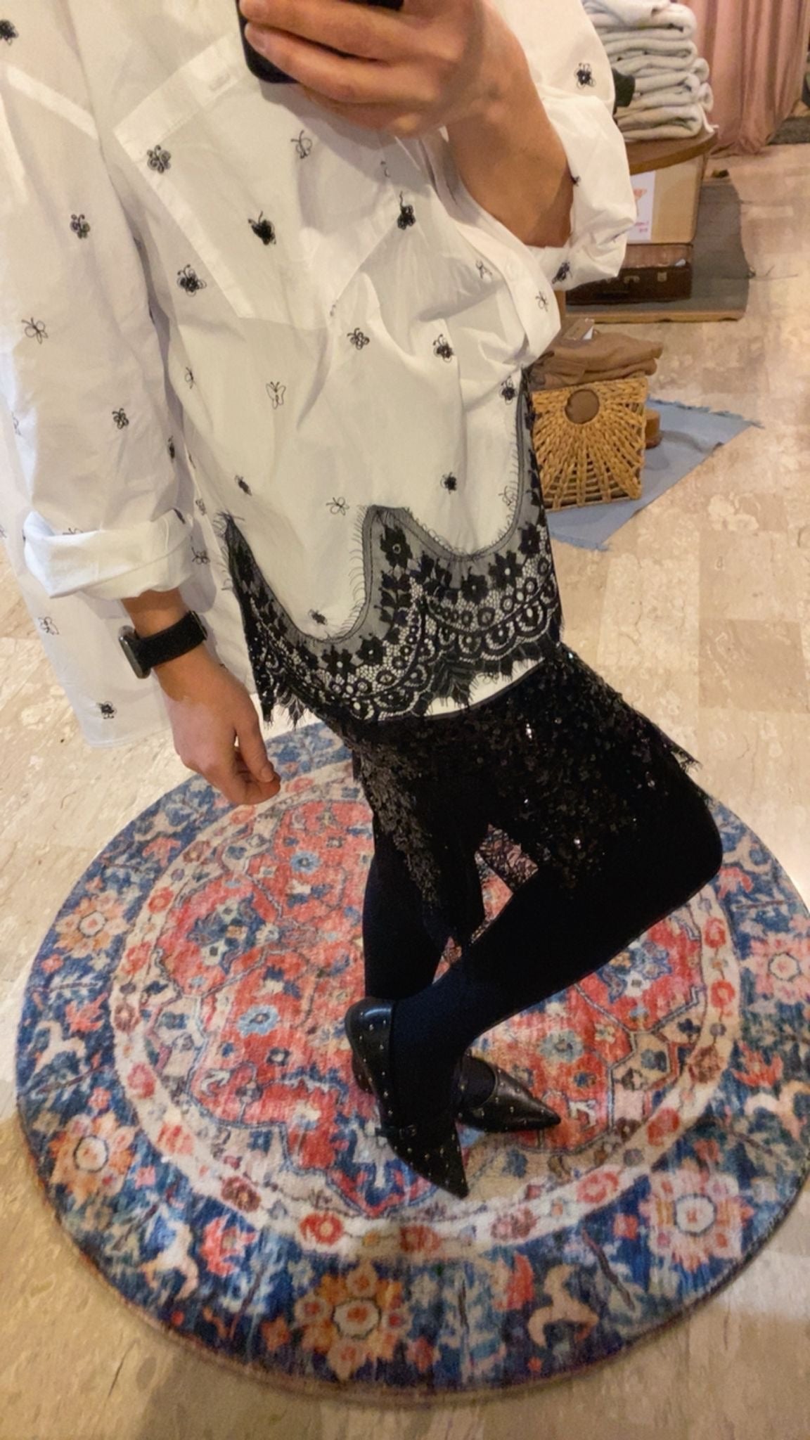 Descrizione: Gonna in paillettes con dettaglio in fondo in pizzo. Fascia elasticizzata in vita