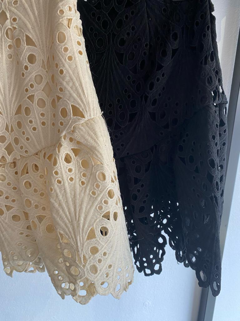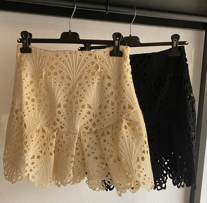 Descrizione: Gonna Corta in Pizzo. Chiusura con zip posteriore