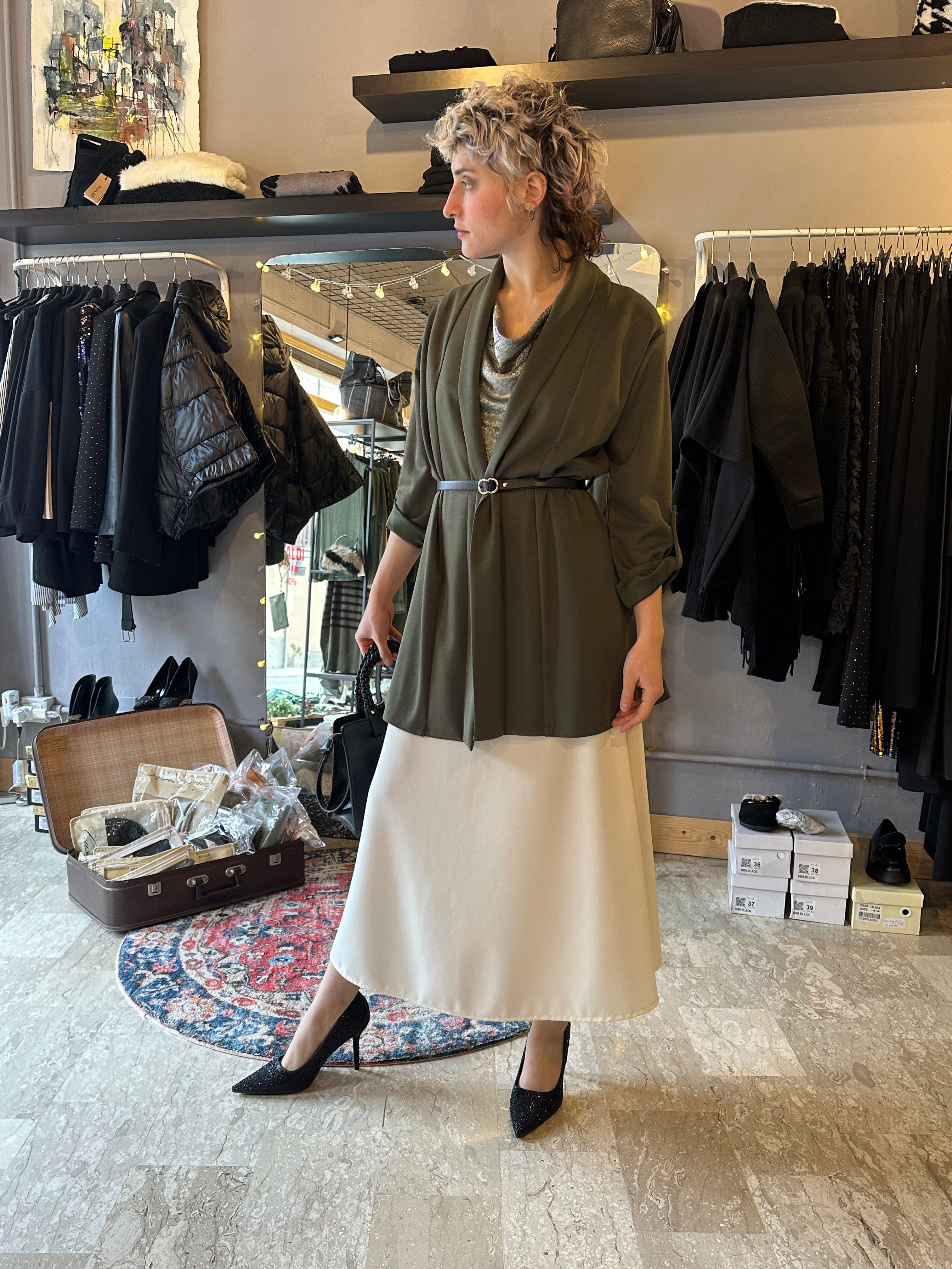 Descrizione: Gonna Midi in punto milano. Elastico in vita, fondo svasato