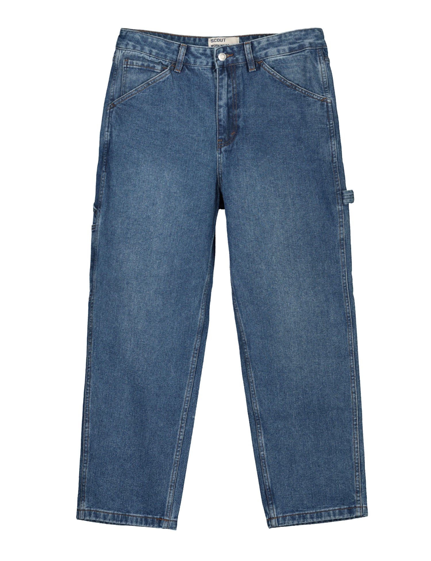 Descrizione: Jeans modello work con vestibilità cropped. Chisura frontale con bottone e zip, tasche laterali a filetto passante porta martello.