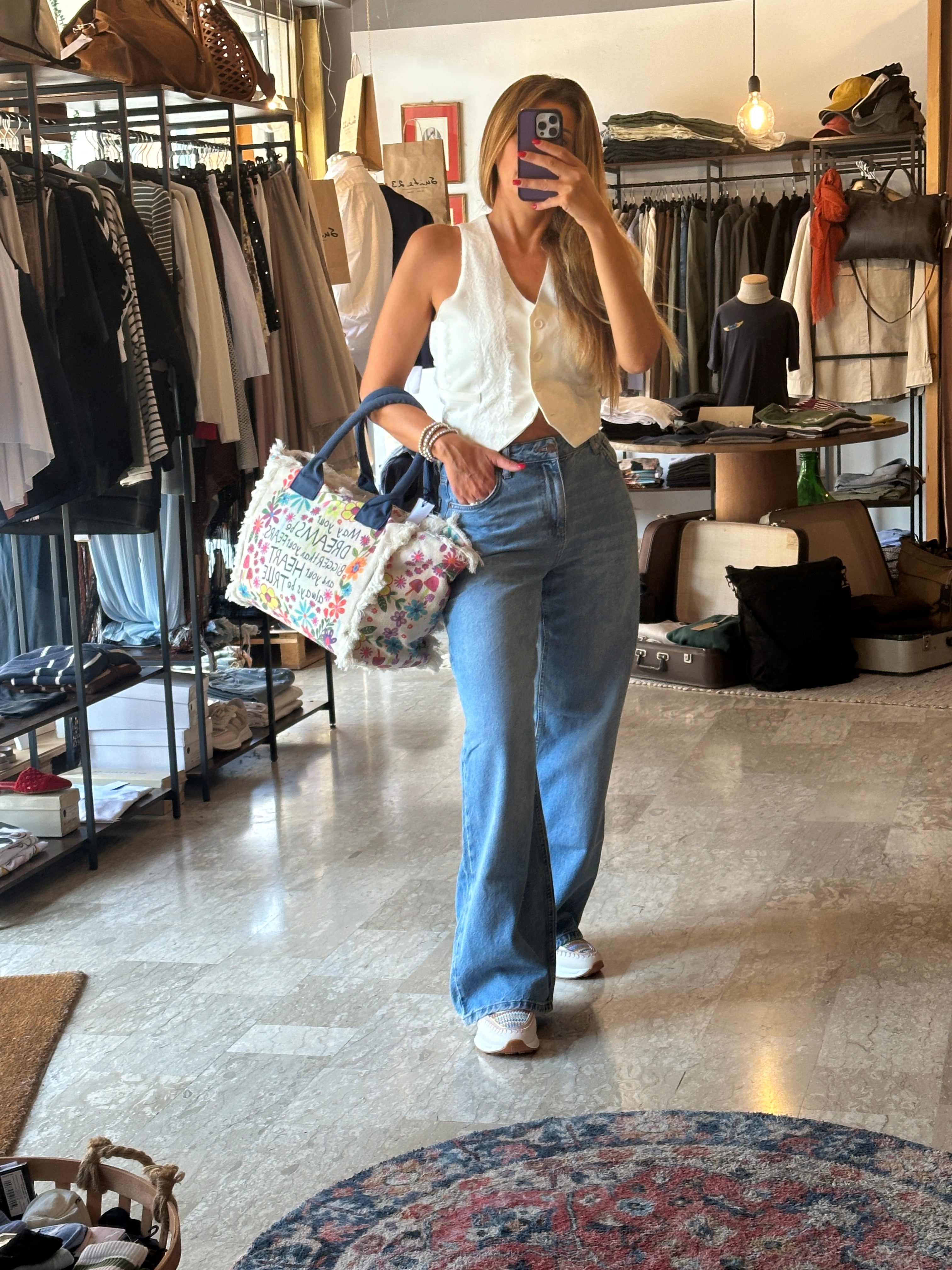 Descrizione: Jeans modello wide leg con gamba larga. Chiusura frontale con bottone e zip e cinque tasche