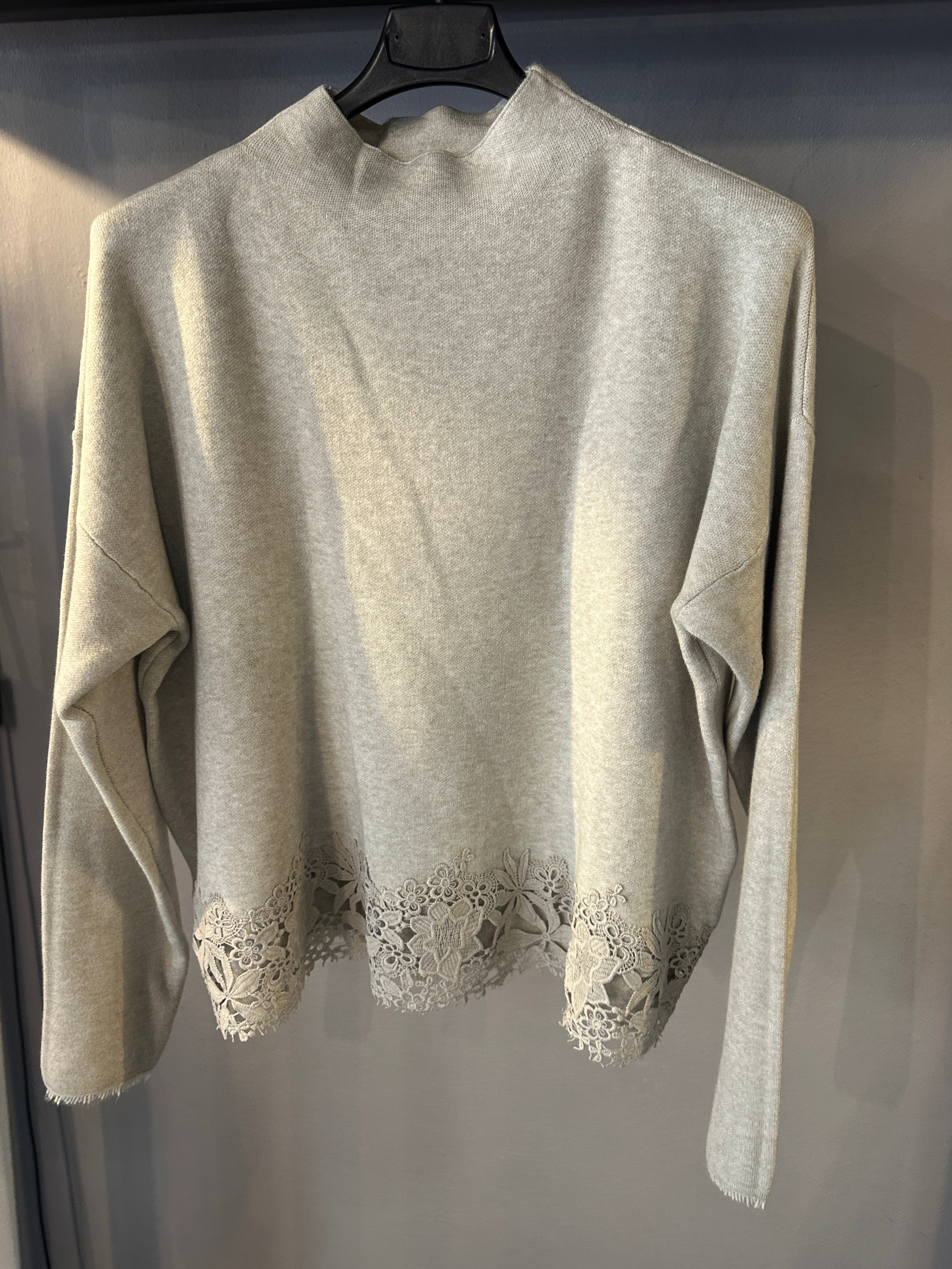 Descrizione: Maglia Donna smacchinata punto maglia. Collo a cratere, spalla scesa, manica lunga. Fondo con pizzo