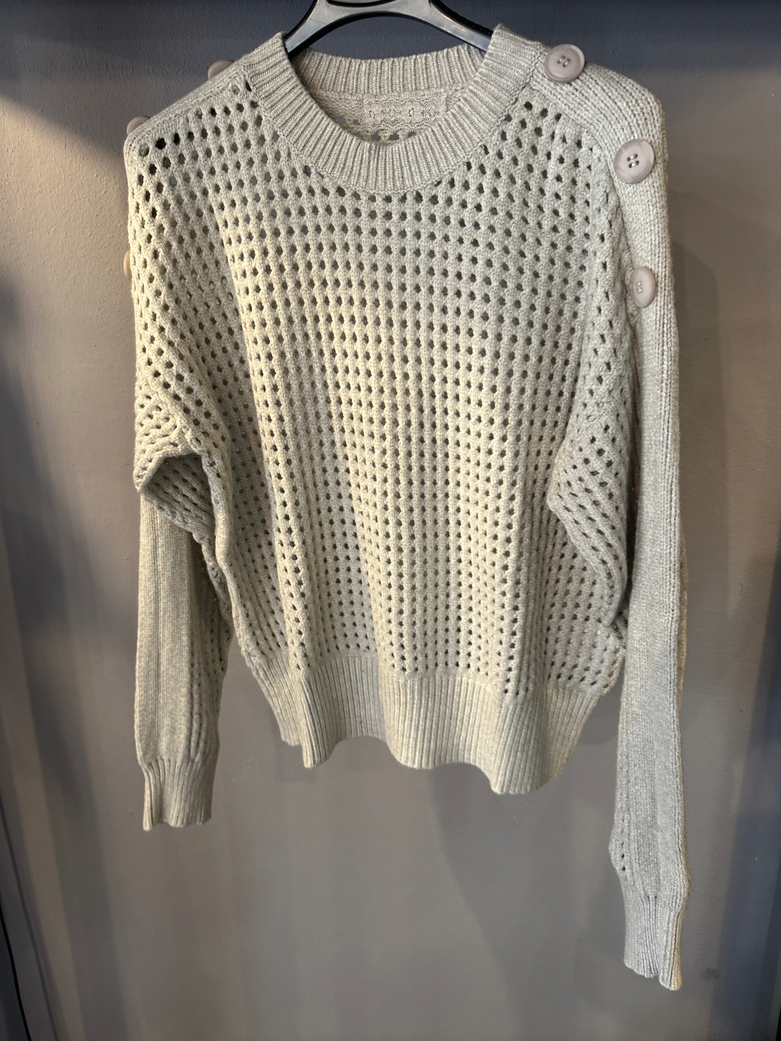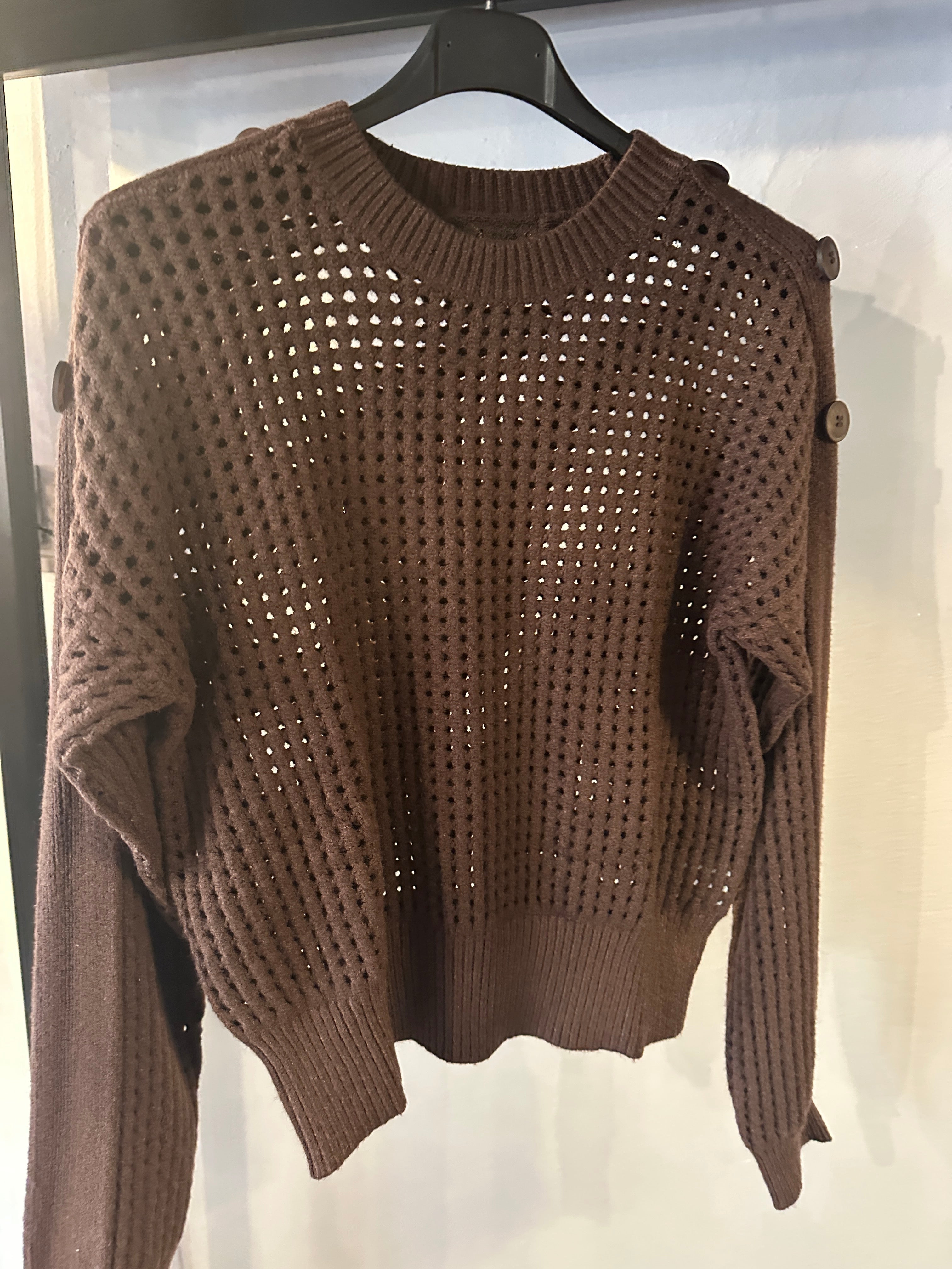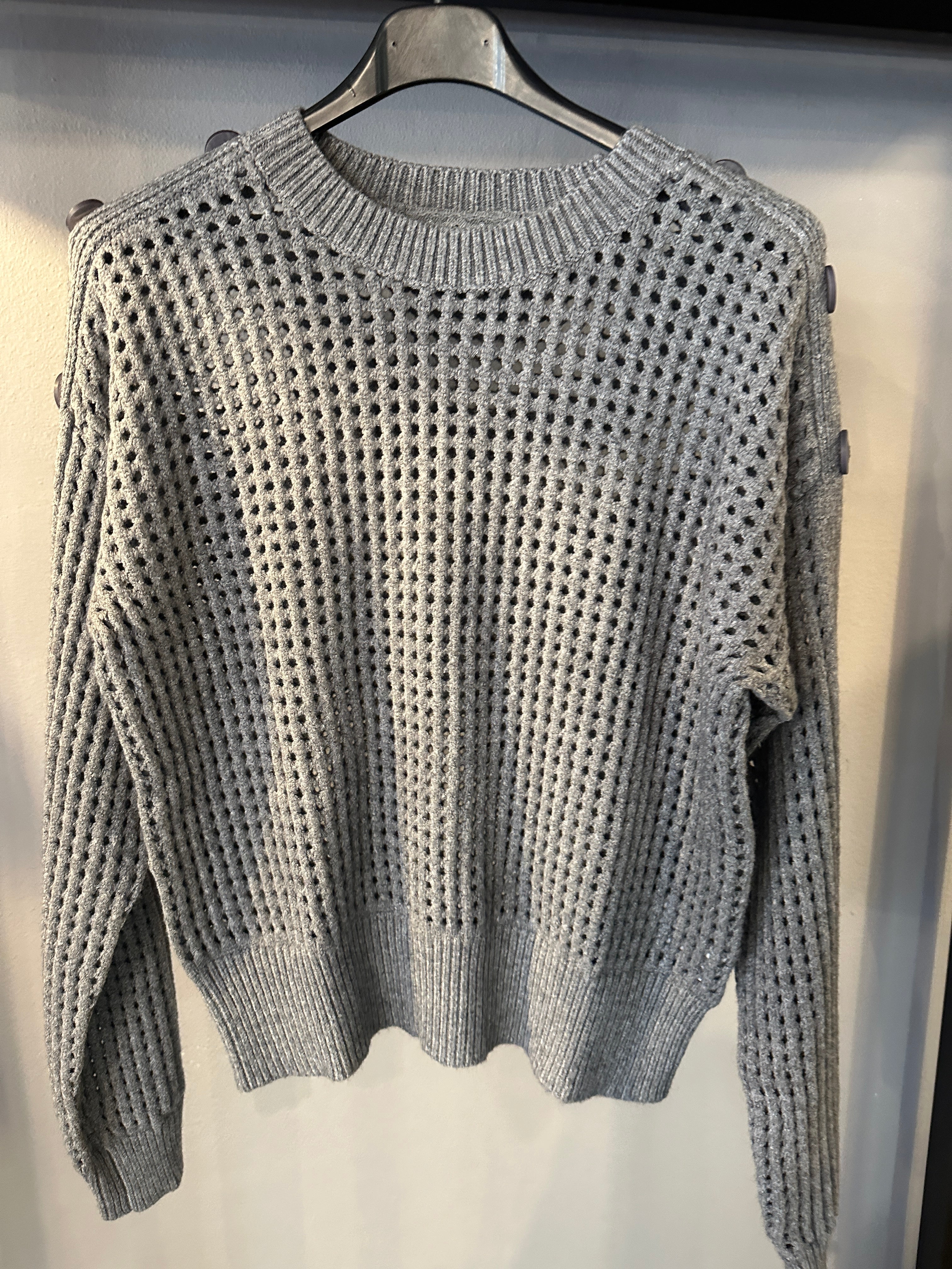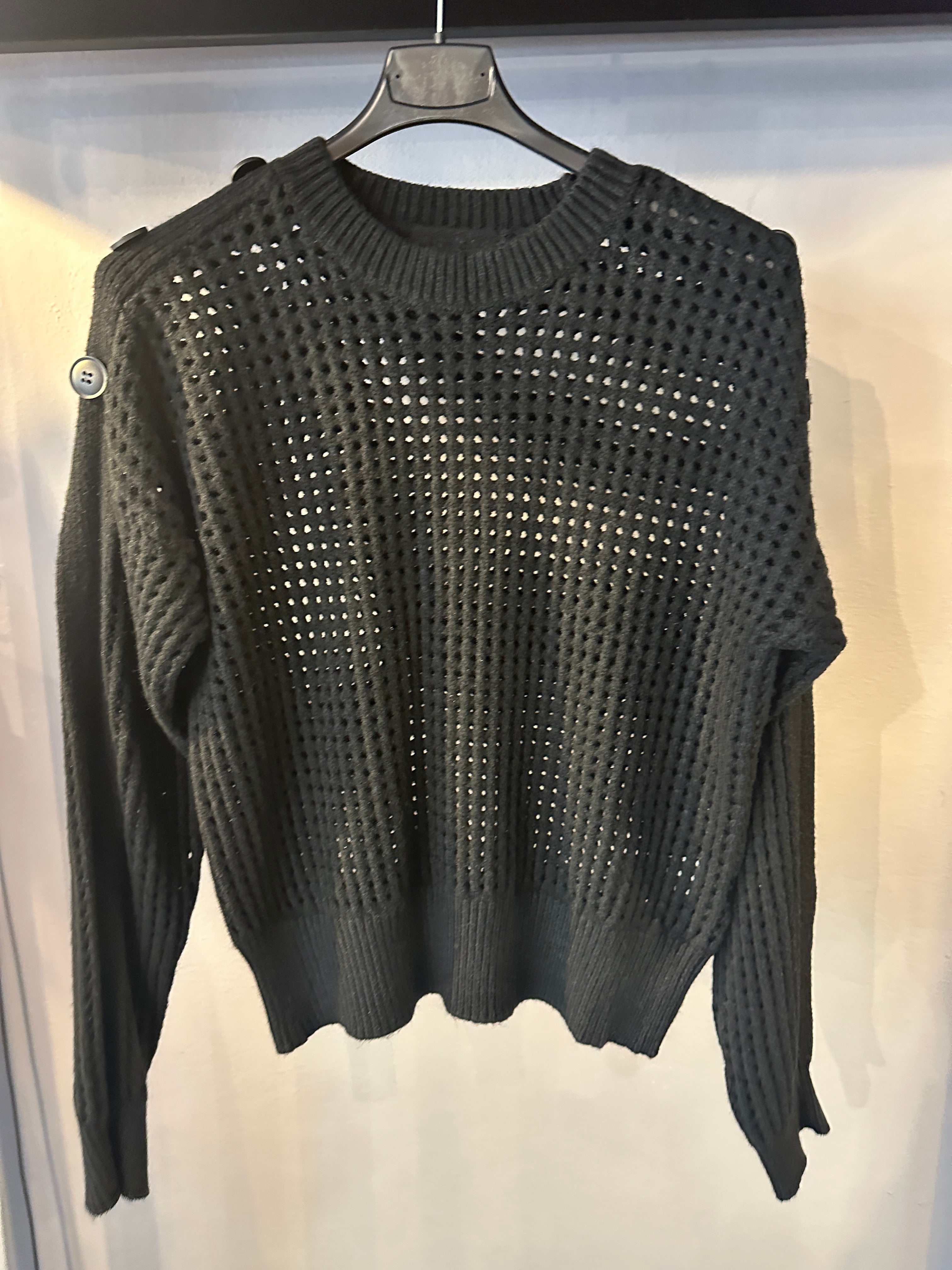 Descrizione: Maglia Donna smacchinata traforata. Girocollo, fondo e polsi con costina 2x2. Spalla scesa ,manica lunga. Dettaglio bottoni sulle spalle