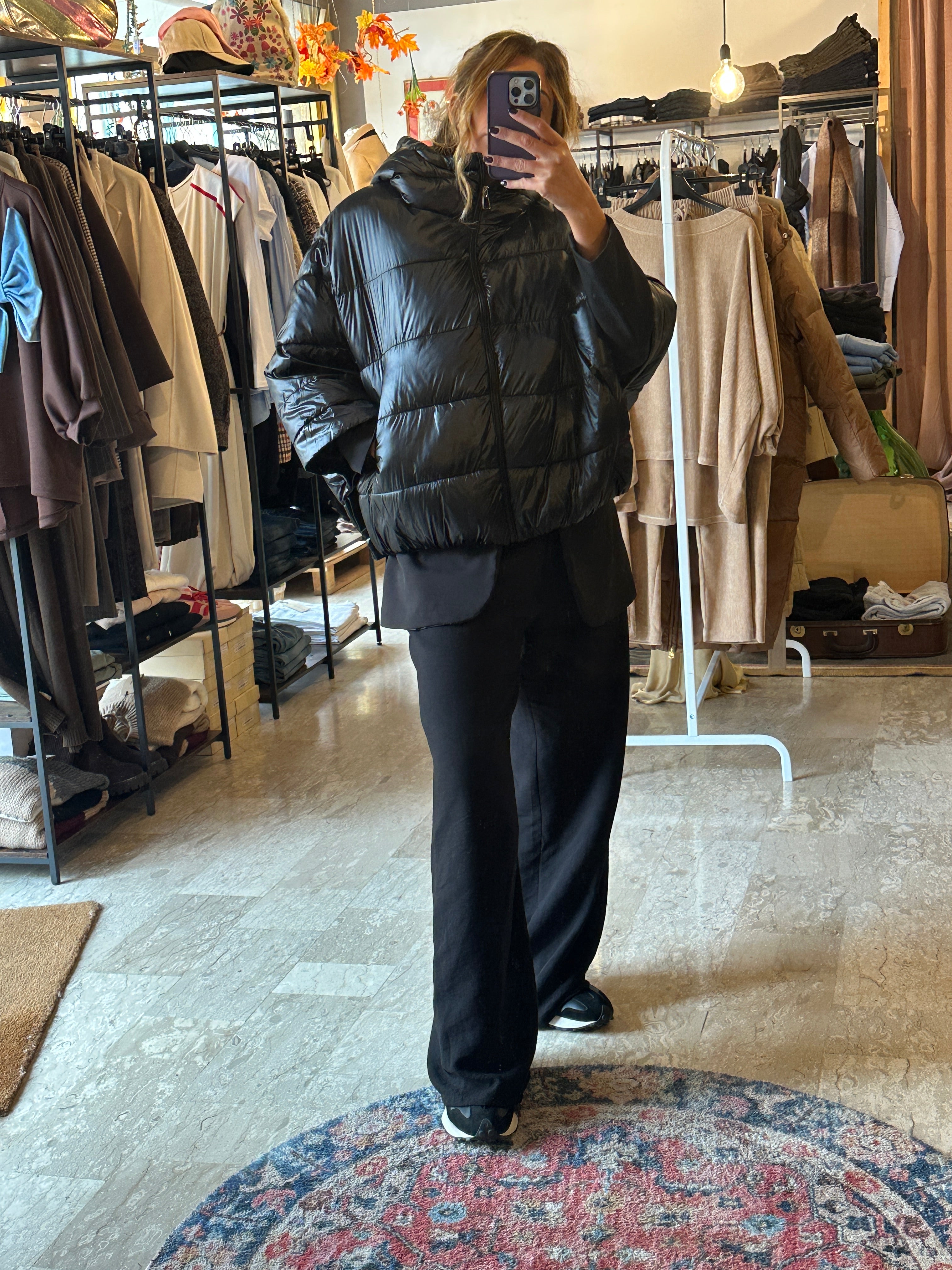 Descrizione: Mantella Donna in Nylon imbottito. Chiusura frontale. Tasche sul fianco. Elastico interno sul fordo. Bottoni sulla parte laterale. Cappuccio