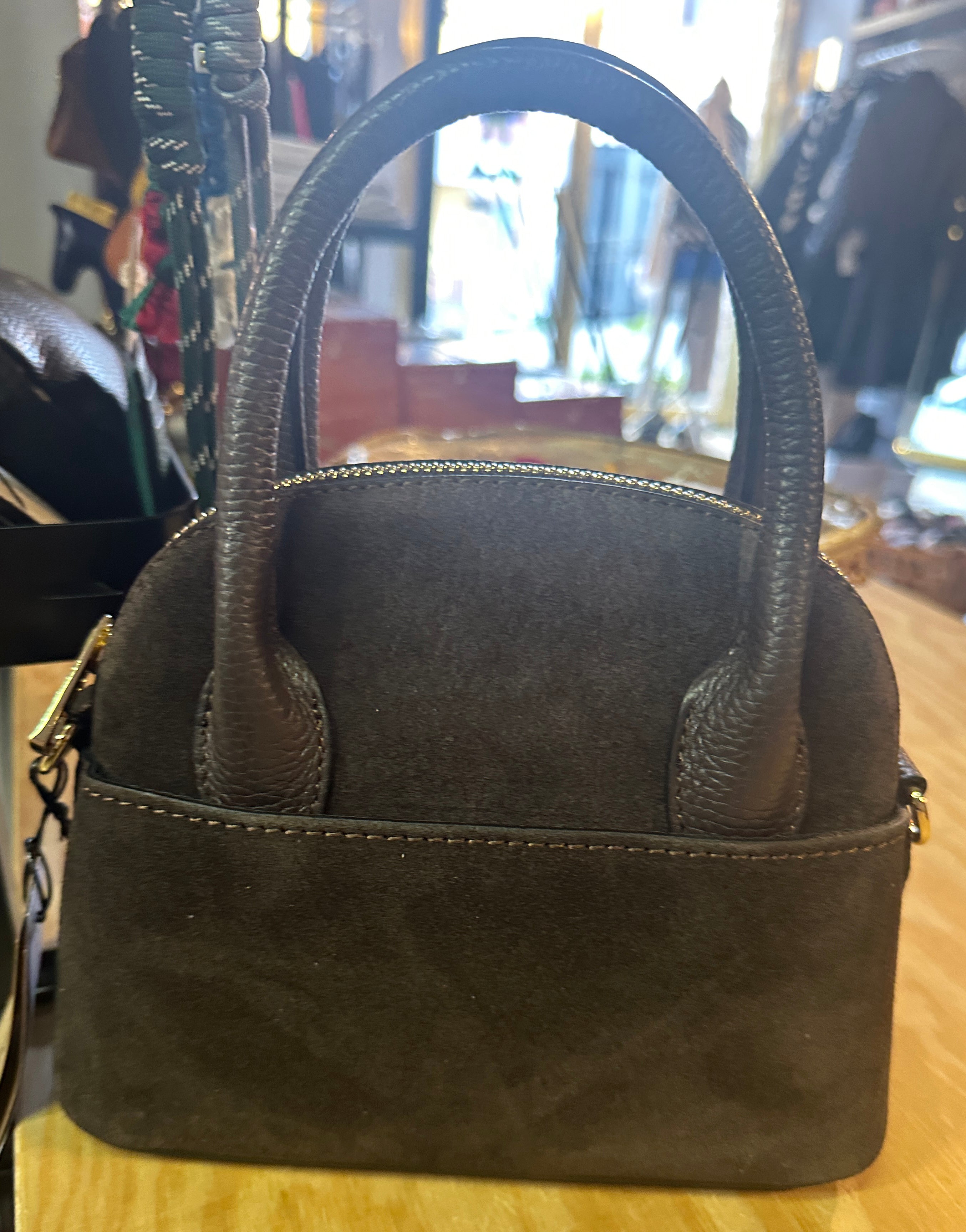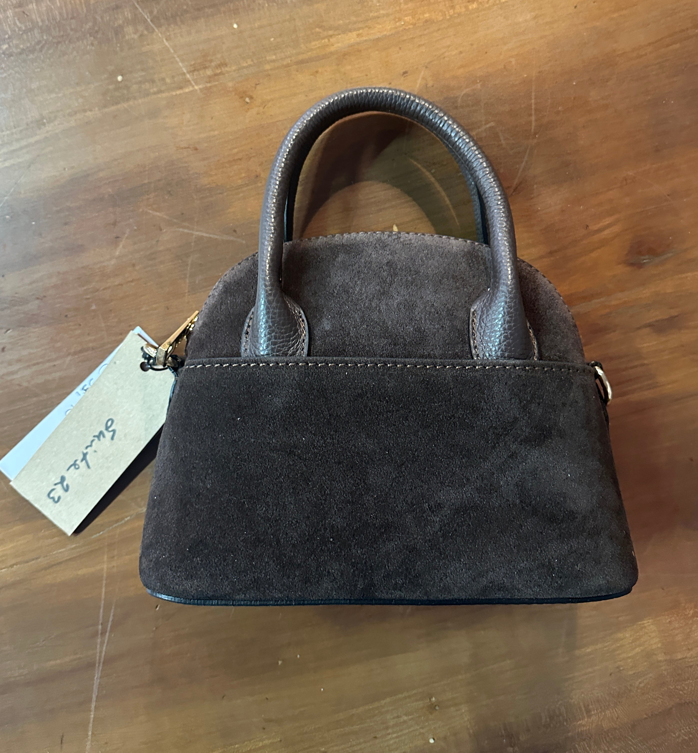 Descrizione: Mini Secchiello in Camoscio. Tracolla rimovibile con moschettoni