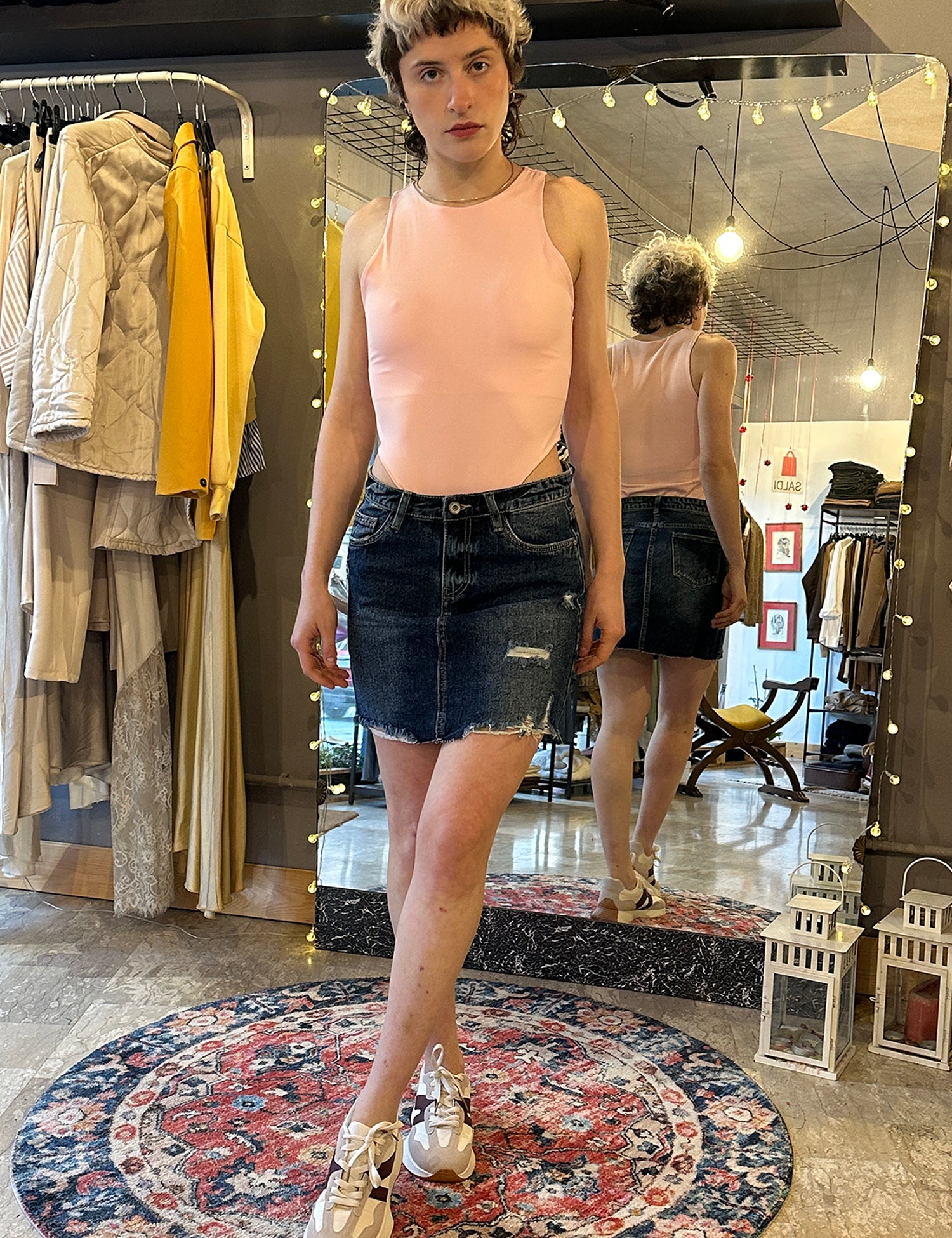Descrizione: Minigonna 5 tasche in denim. Chiusura frontale con bottone e zip, oro a taglio vivo