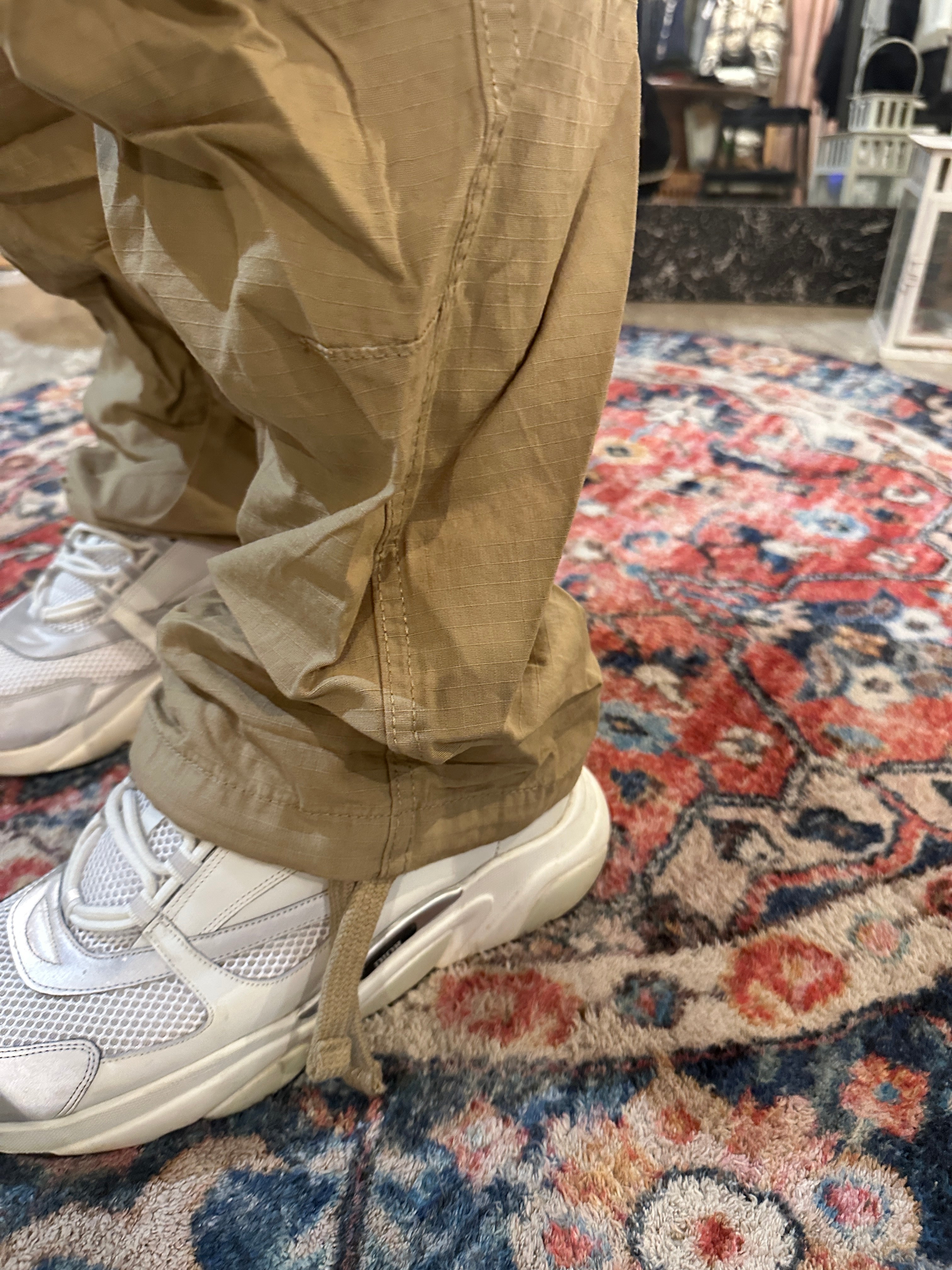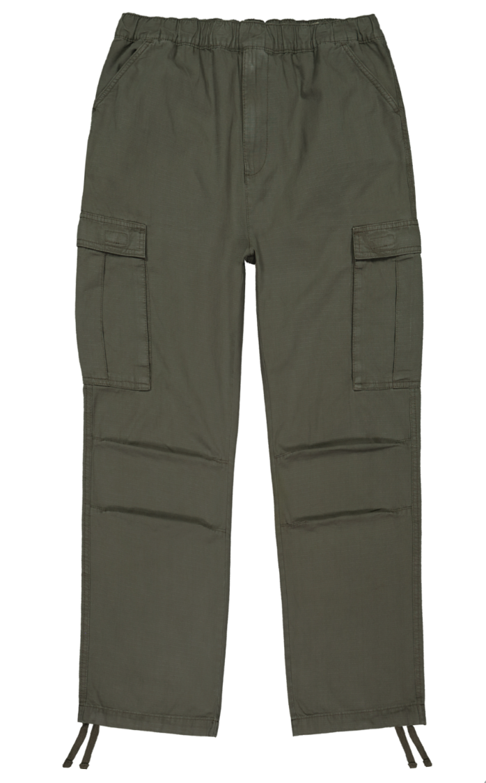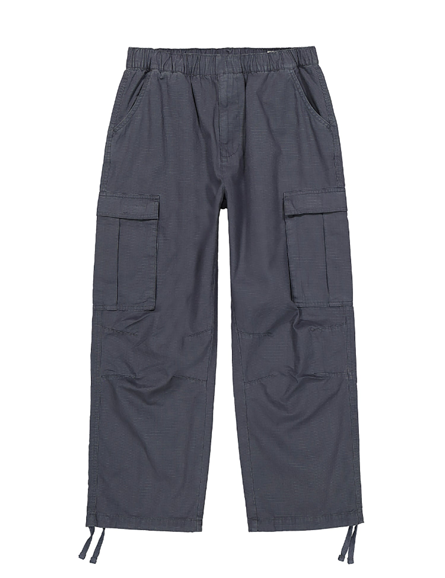 Descrizione: Pantaloni da uomo blu in tessuto rip stop. Girovita elasticizzato, tasche a filetto, tasche cargo laterali e coulisse sul fondo.