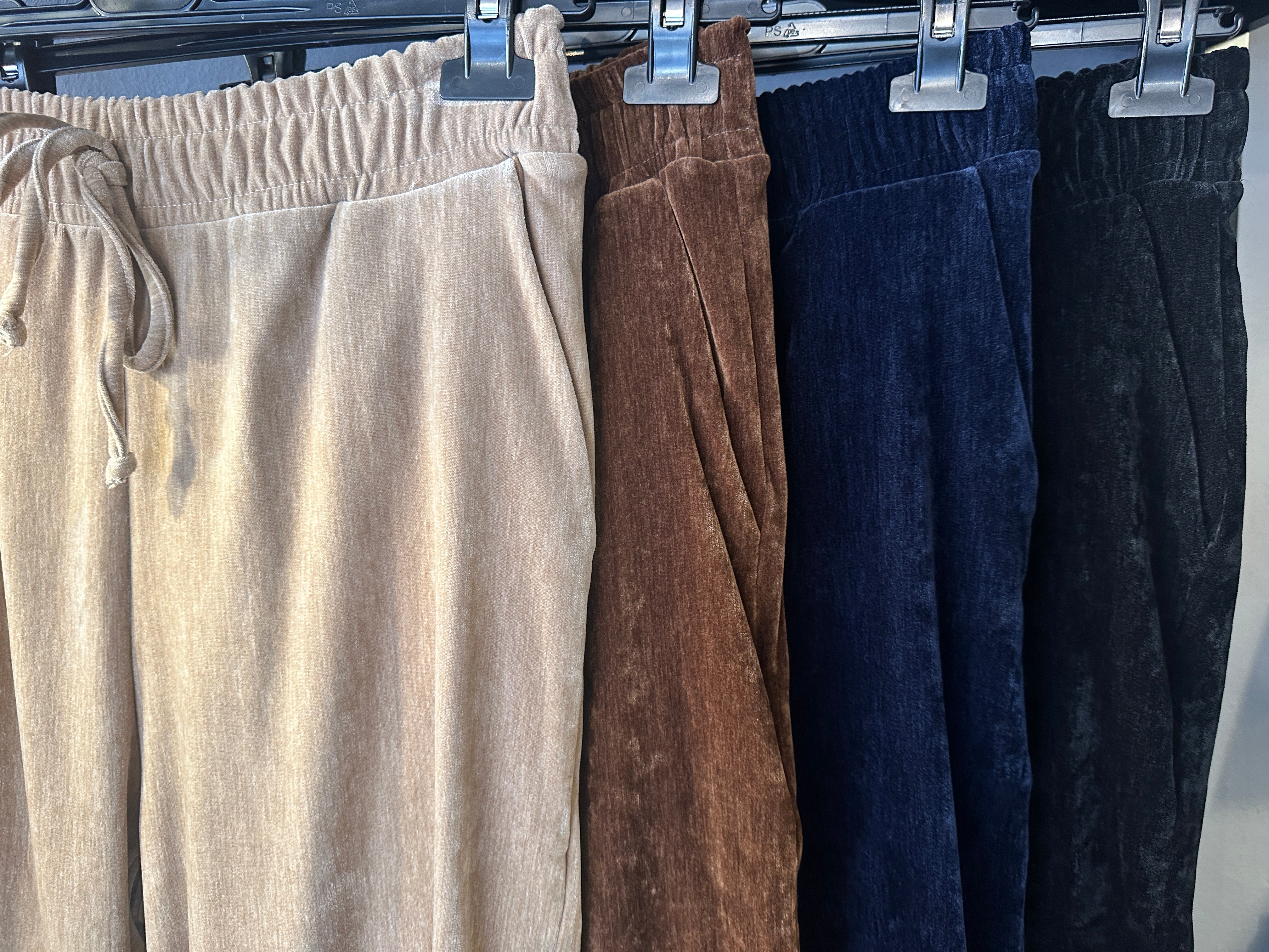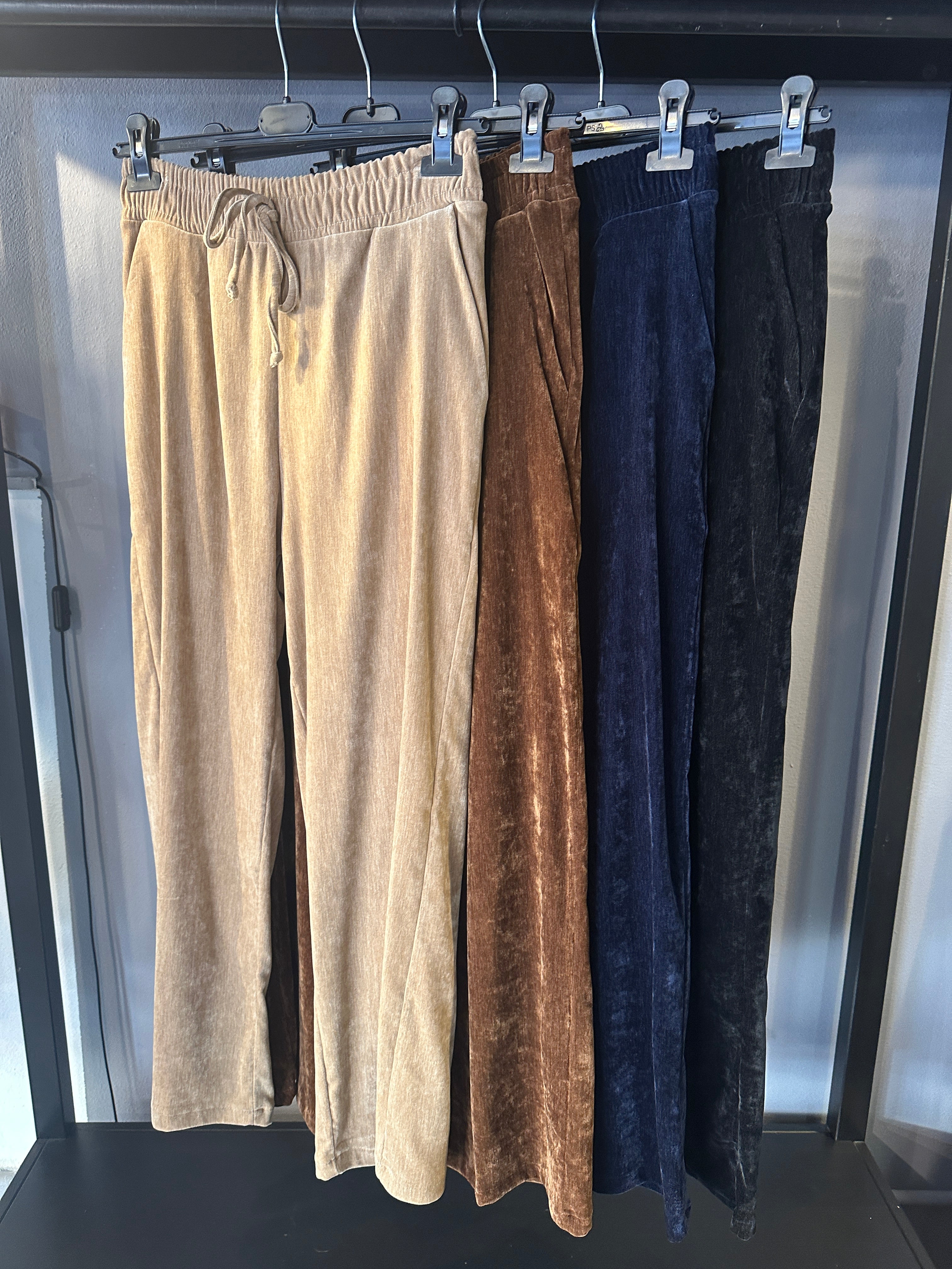 Descrizione: Pantalone Donna a Palazzo in Ciniglia. Fascia elasticizzata in vita con coulisse. Tasche alla francese, gamba larga