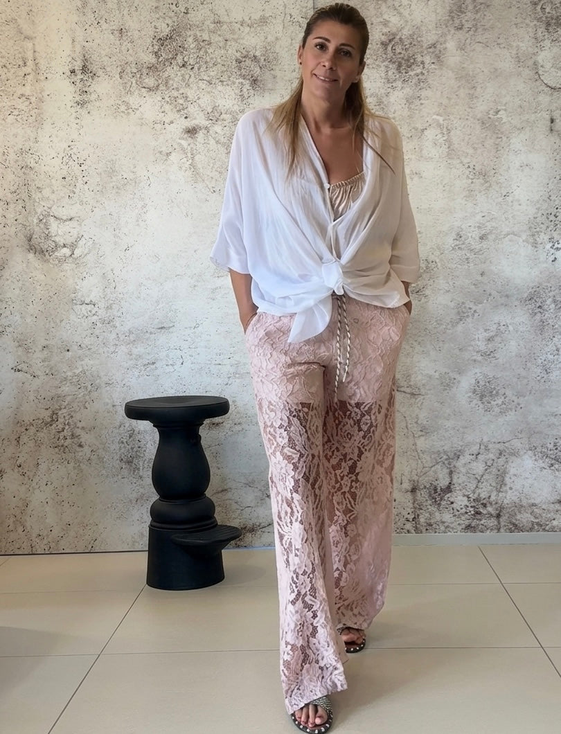 Descrizione: Pantalone in pizzo e tessuto fluido. Davanti in pizzo e dietro in tessuto fluido, vita con coulisse, tasca a filetto dietro. Parte alta del pizzo foderata
