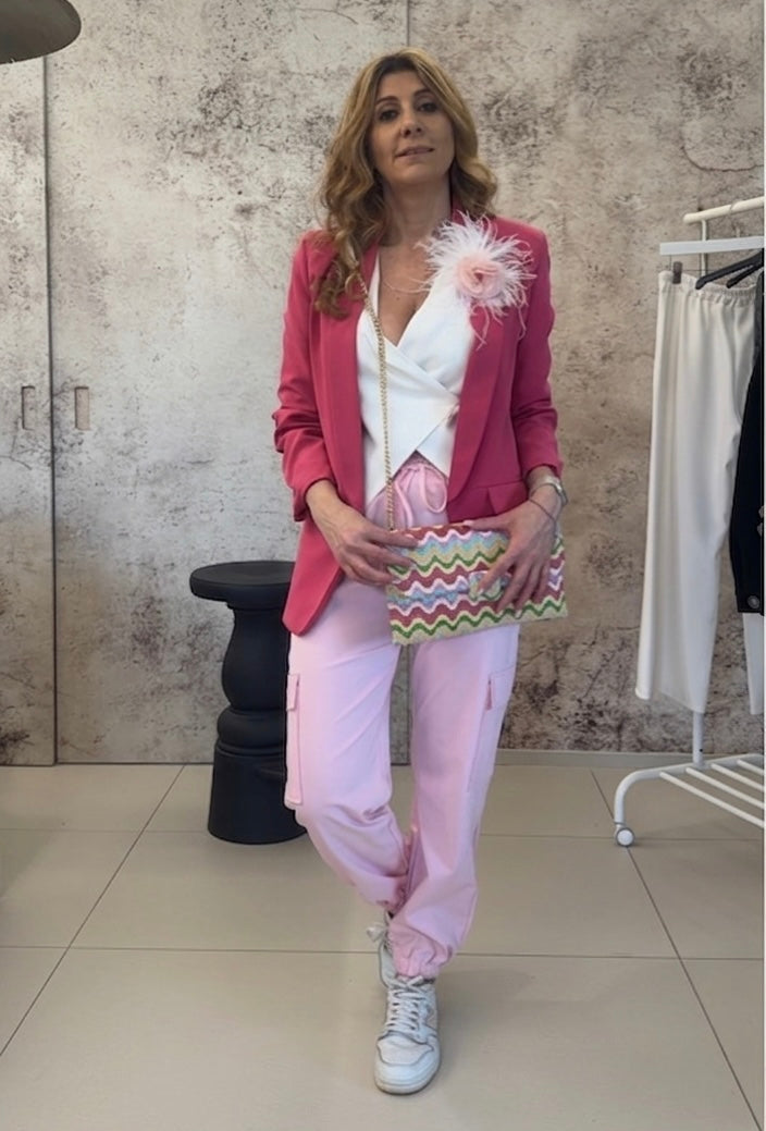 Descrizione: Pantalone tasconato in Punto Milano. Vita con coulisse . Gamba dritta con tasconi laterali, polsino sul fondo.