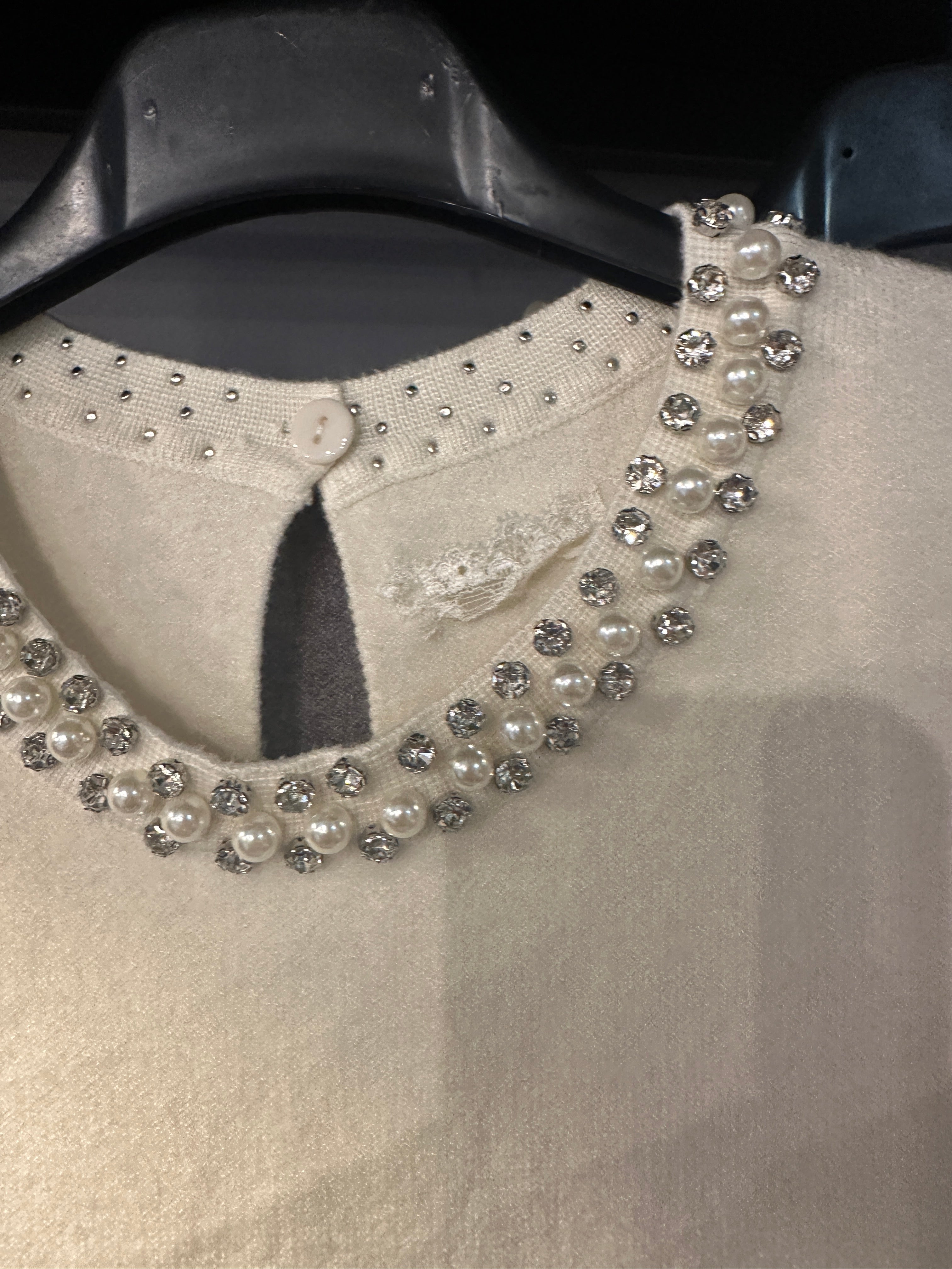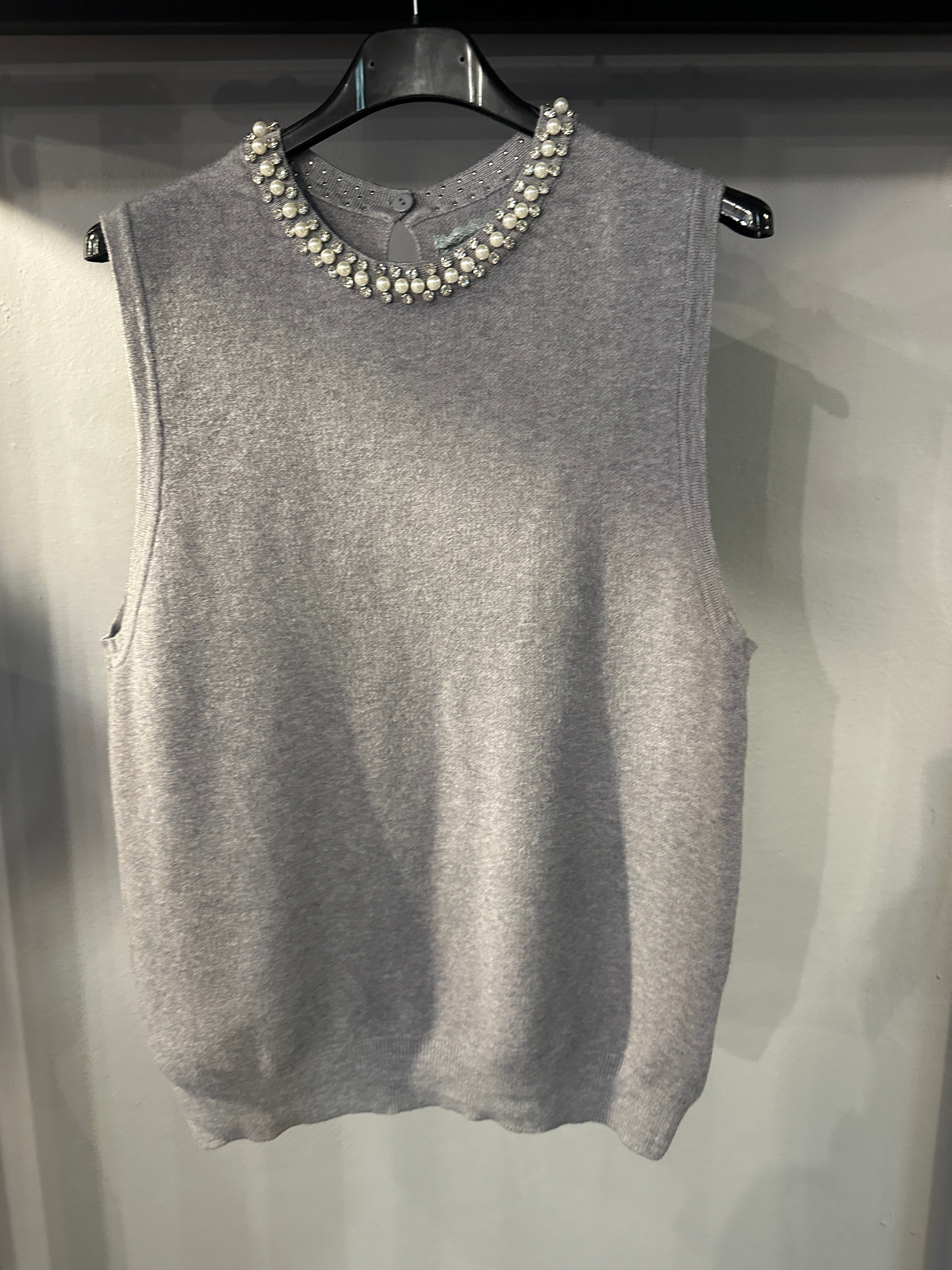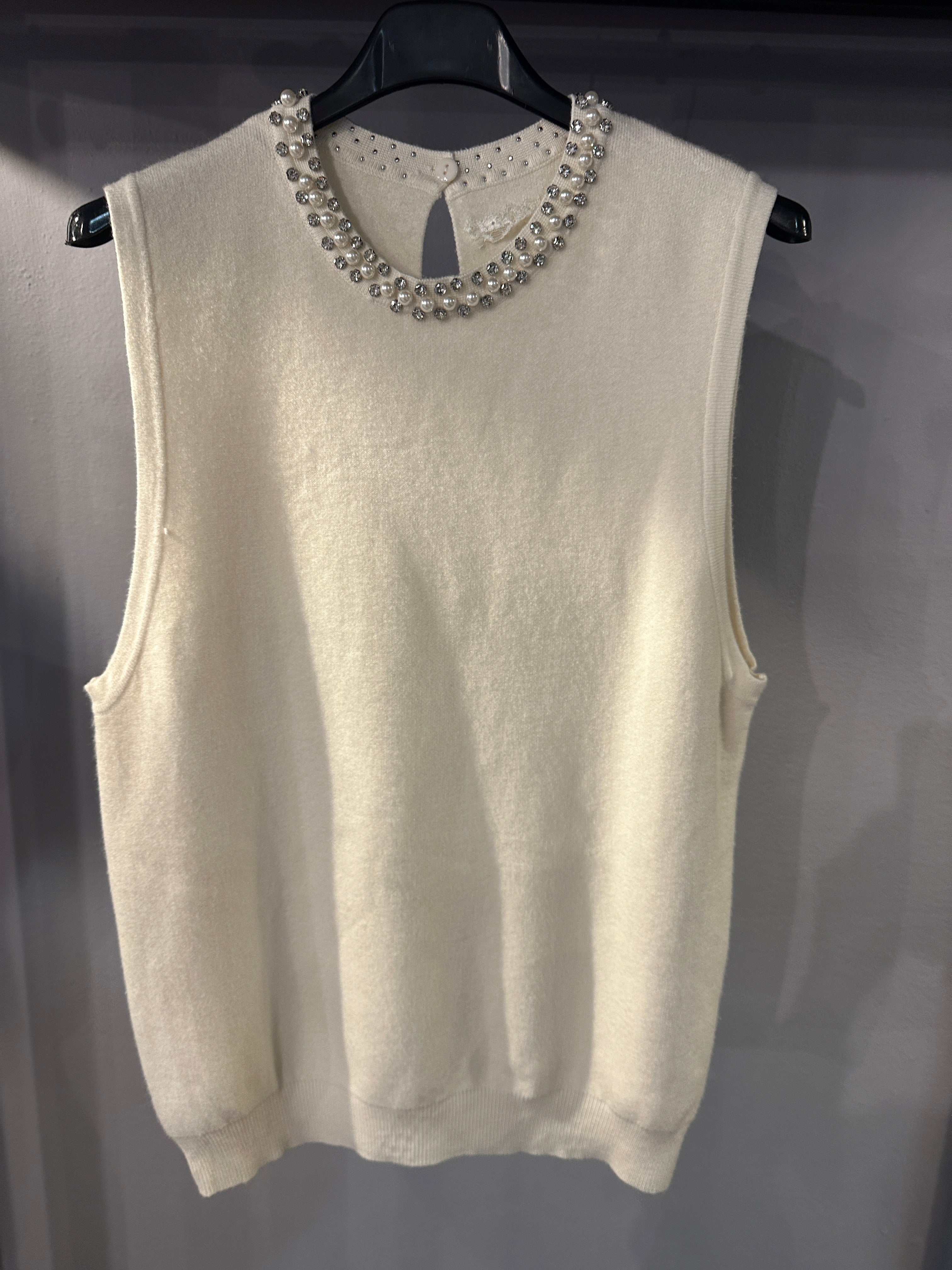 Descrizione: Pullover Smanicato Donna in Viscosa smacchinata. Girocollo con perle e cabochon. Apertura dietro con goccia.