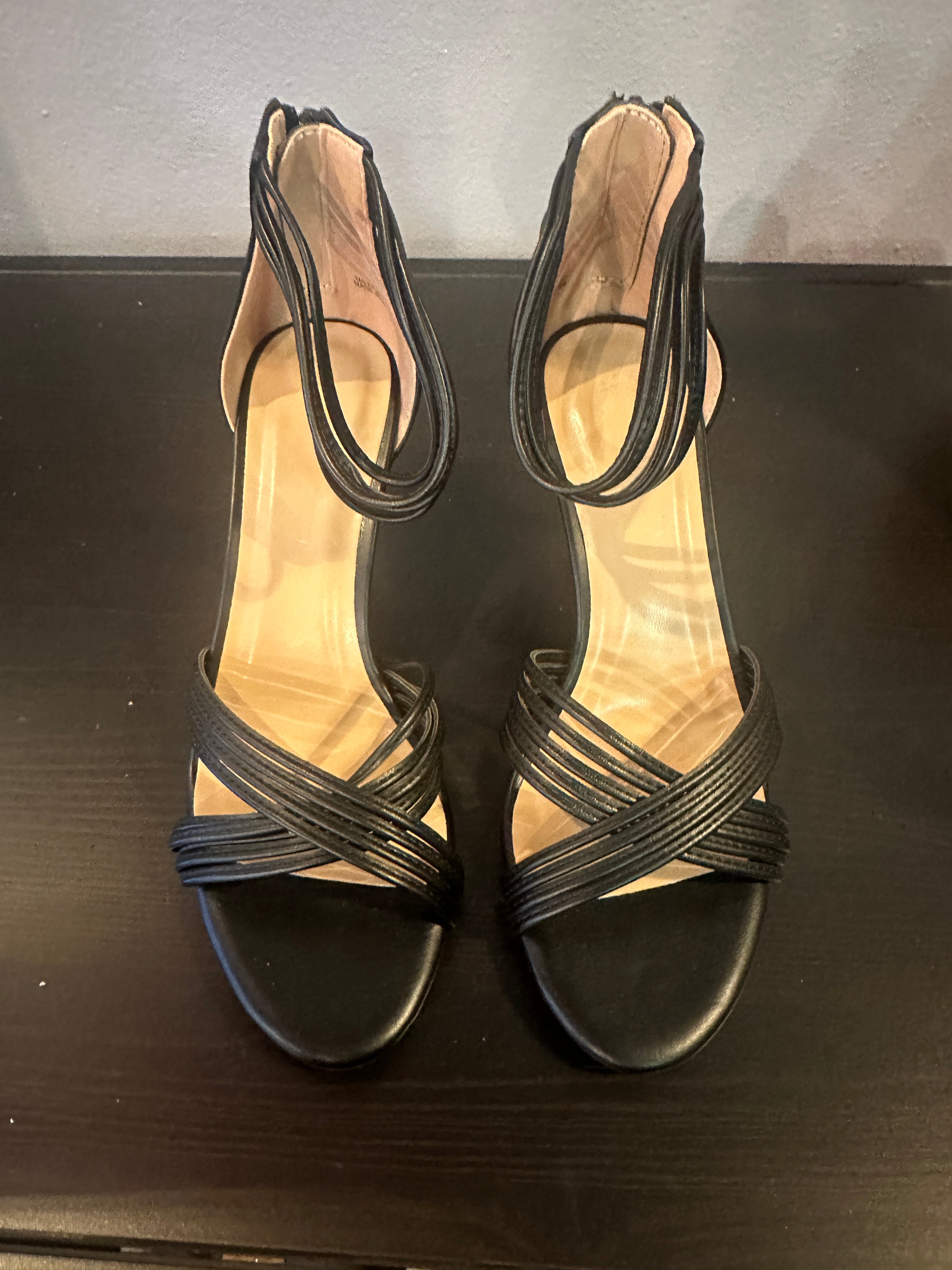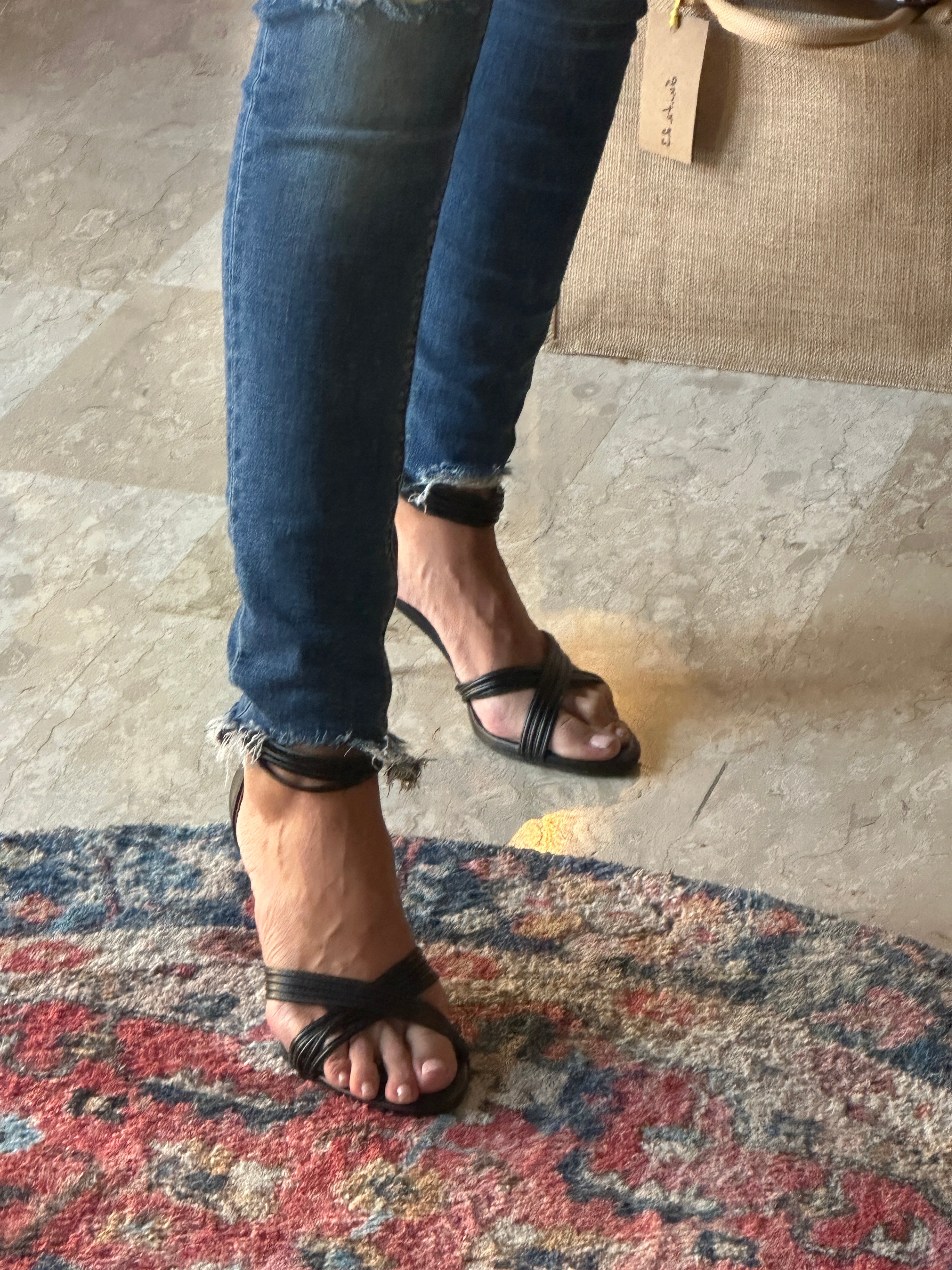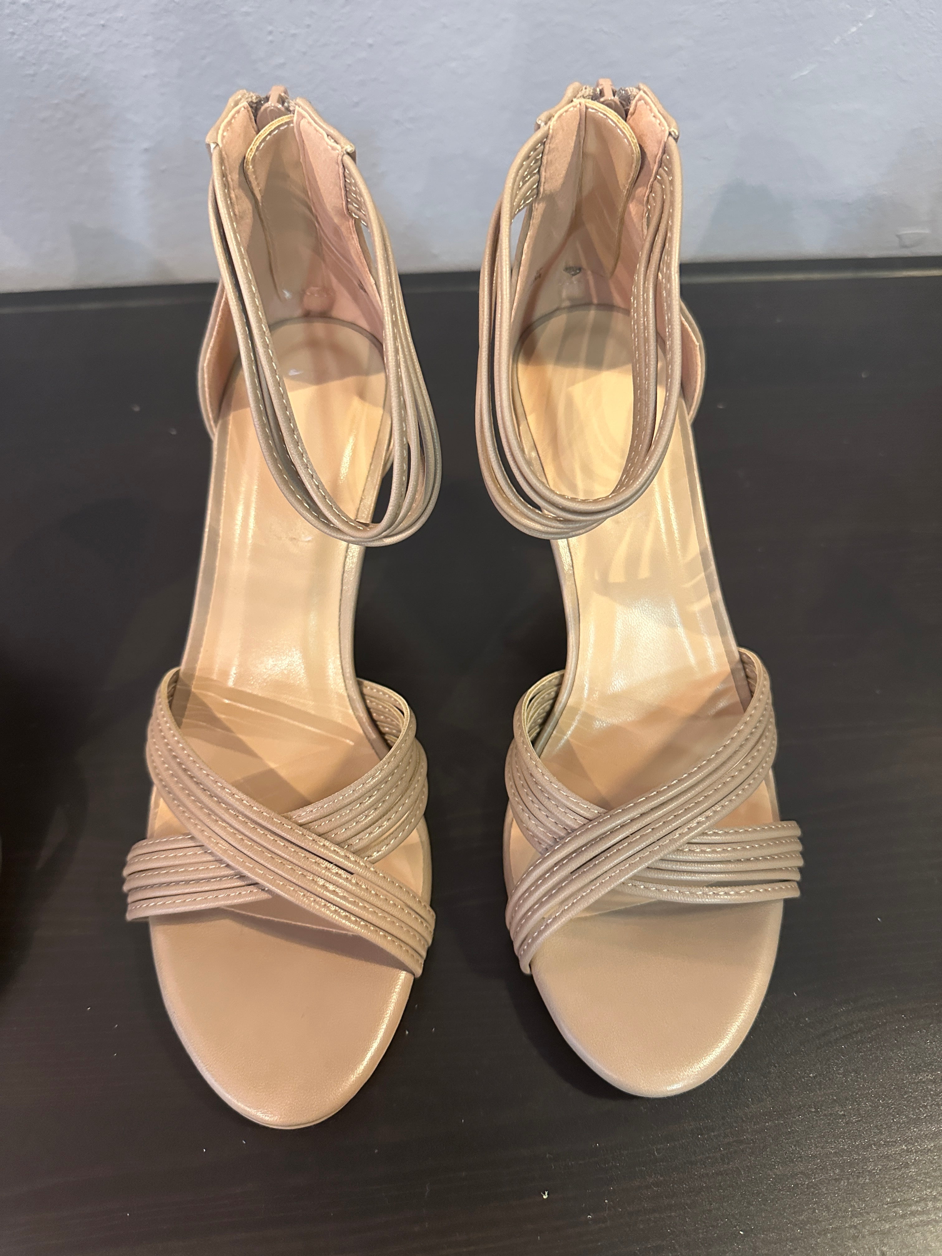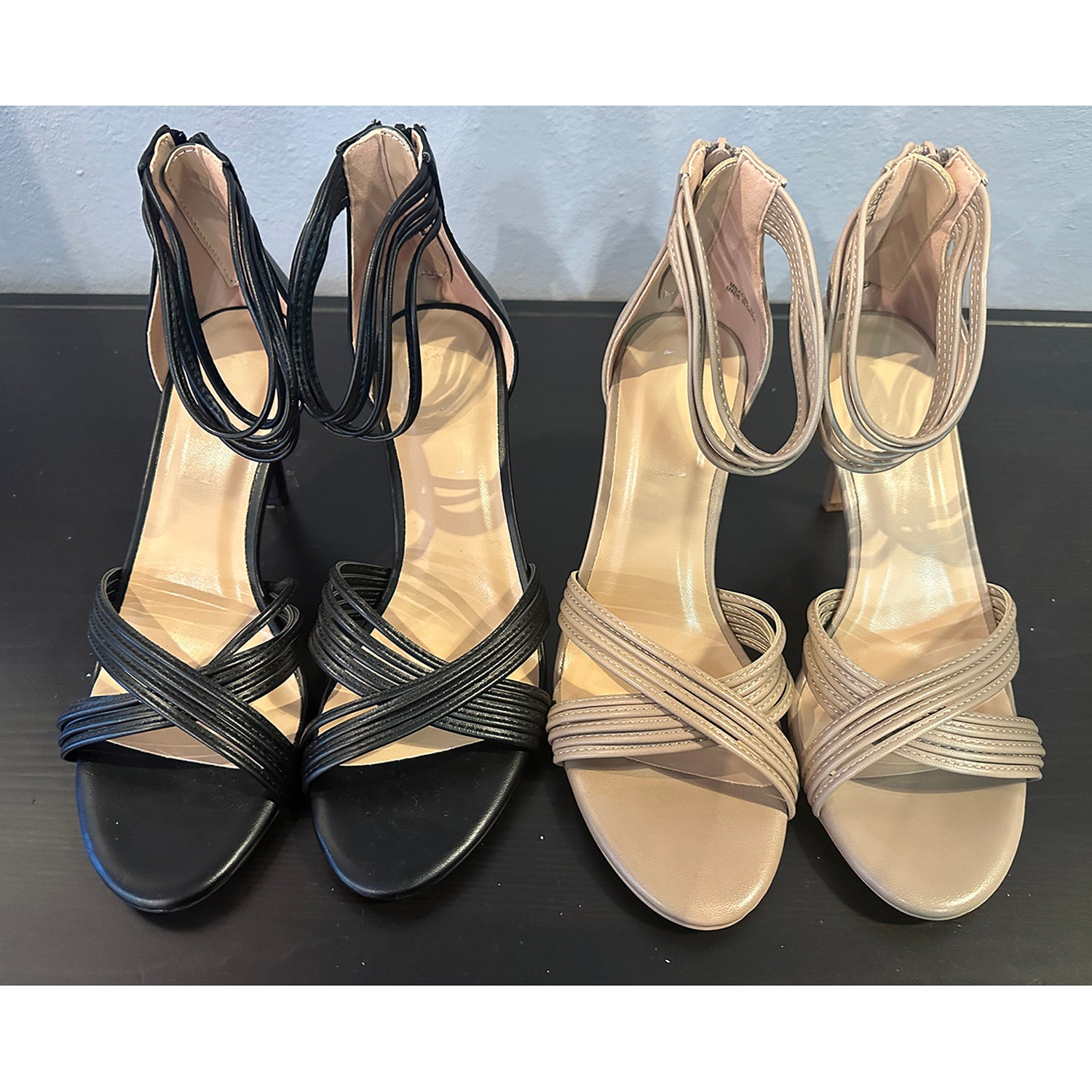 Descrizione: Sandali con tacco in ecopelle. Fascette incrociate sulla parte anteriore e sulla caviglia. Chiusura con zip sul retro. Tacco alto sottile.