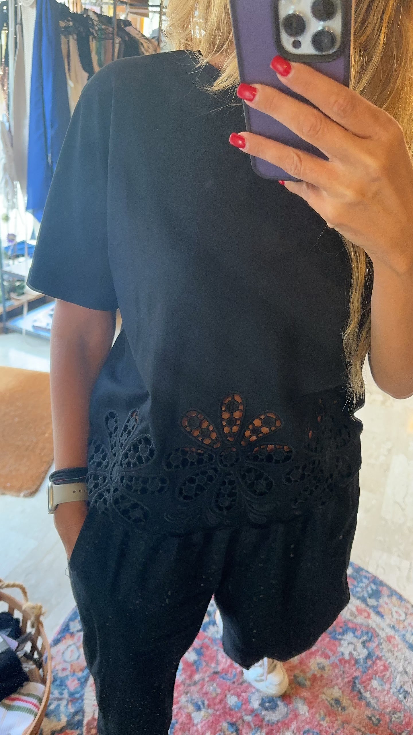 Descrizione: T-shirt con ricamo sul fondo. Girocollo e manica corta.