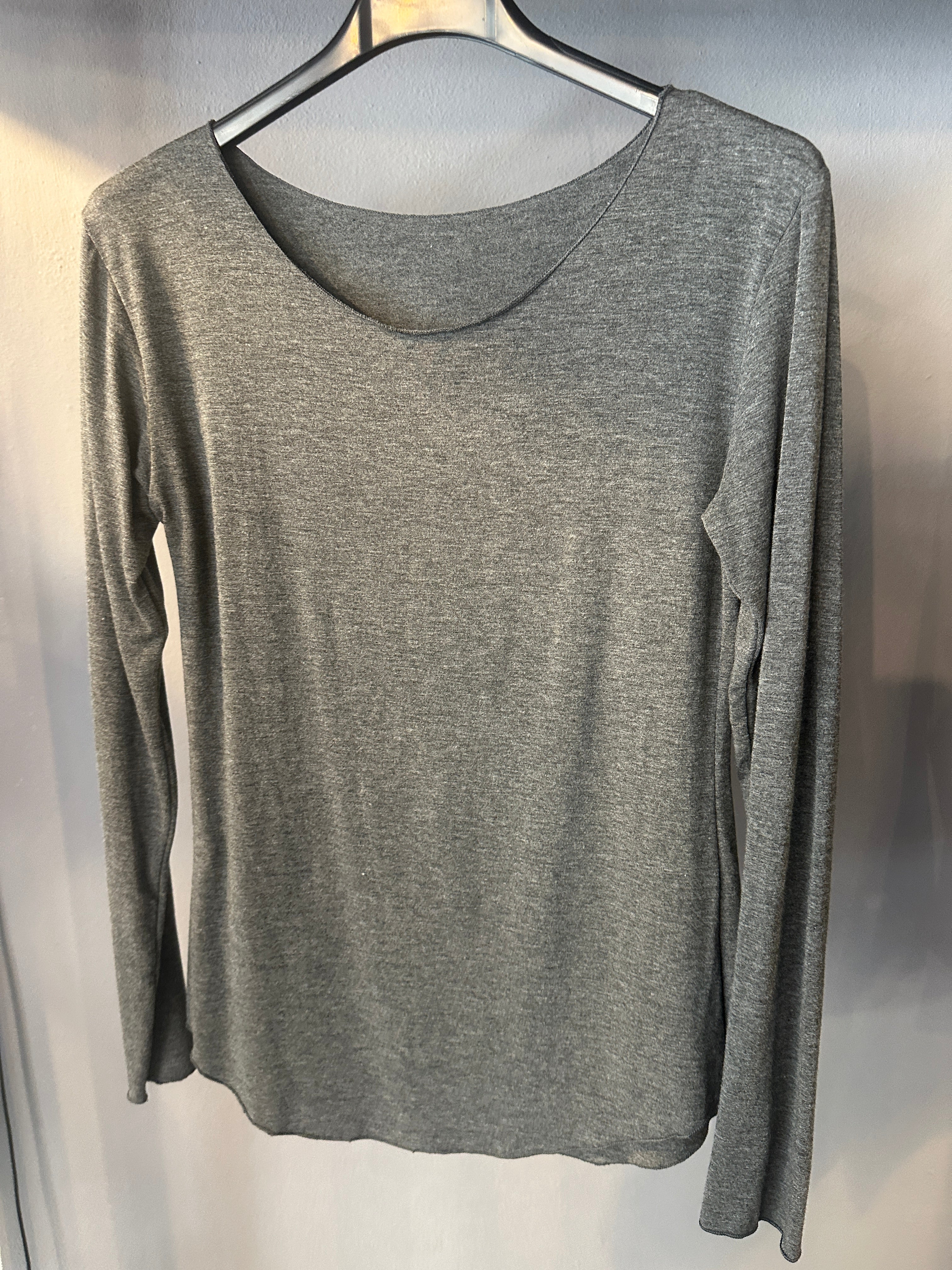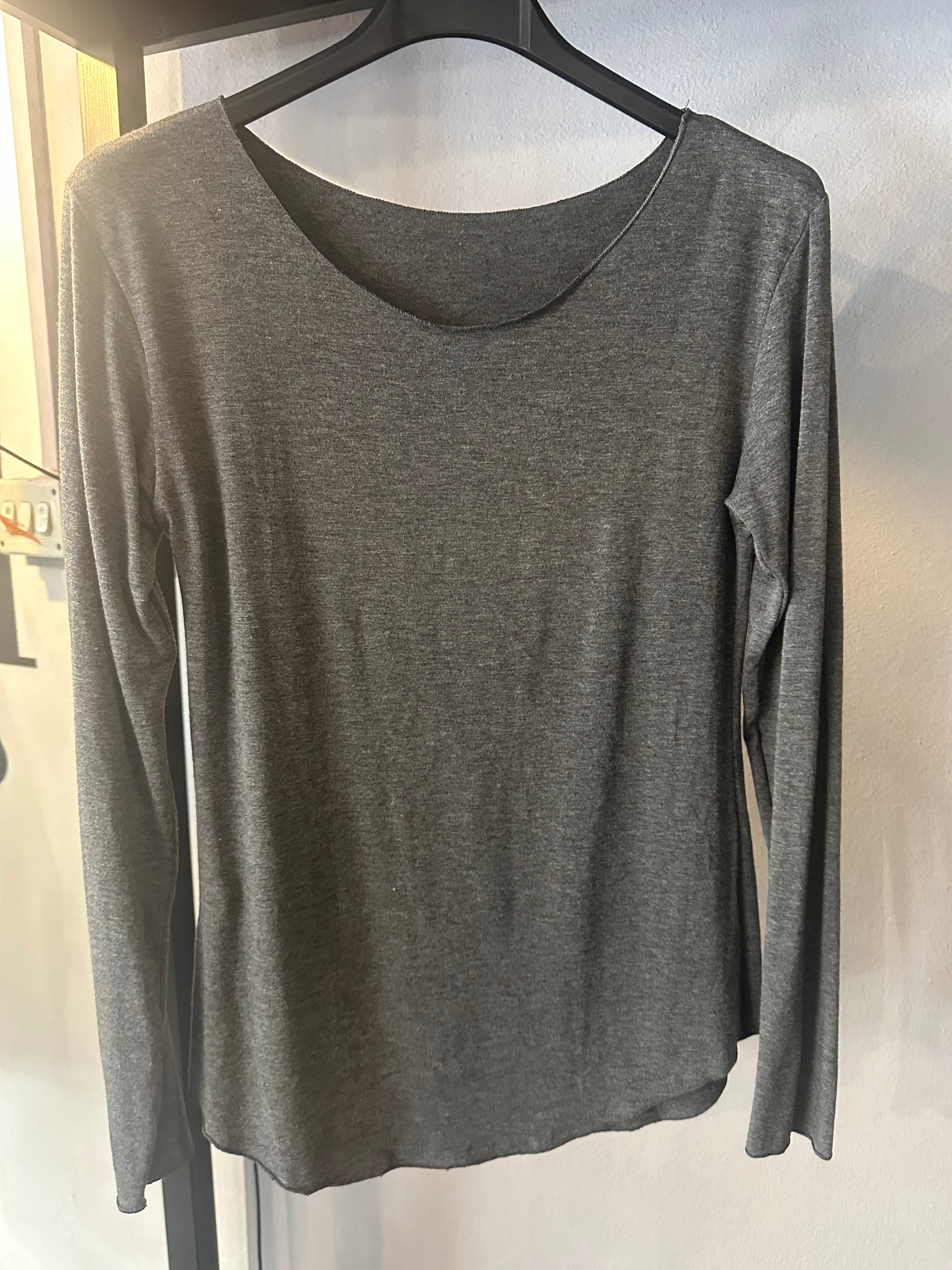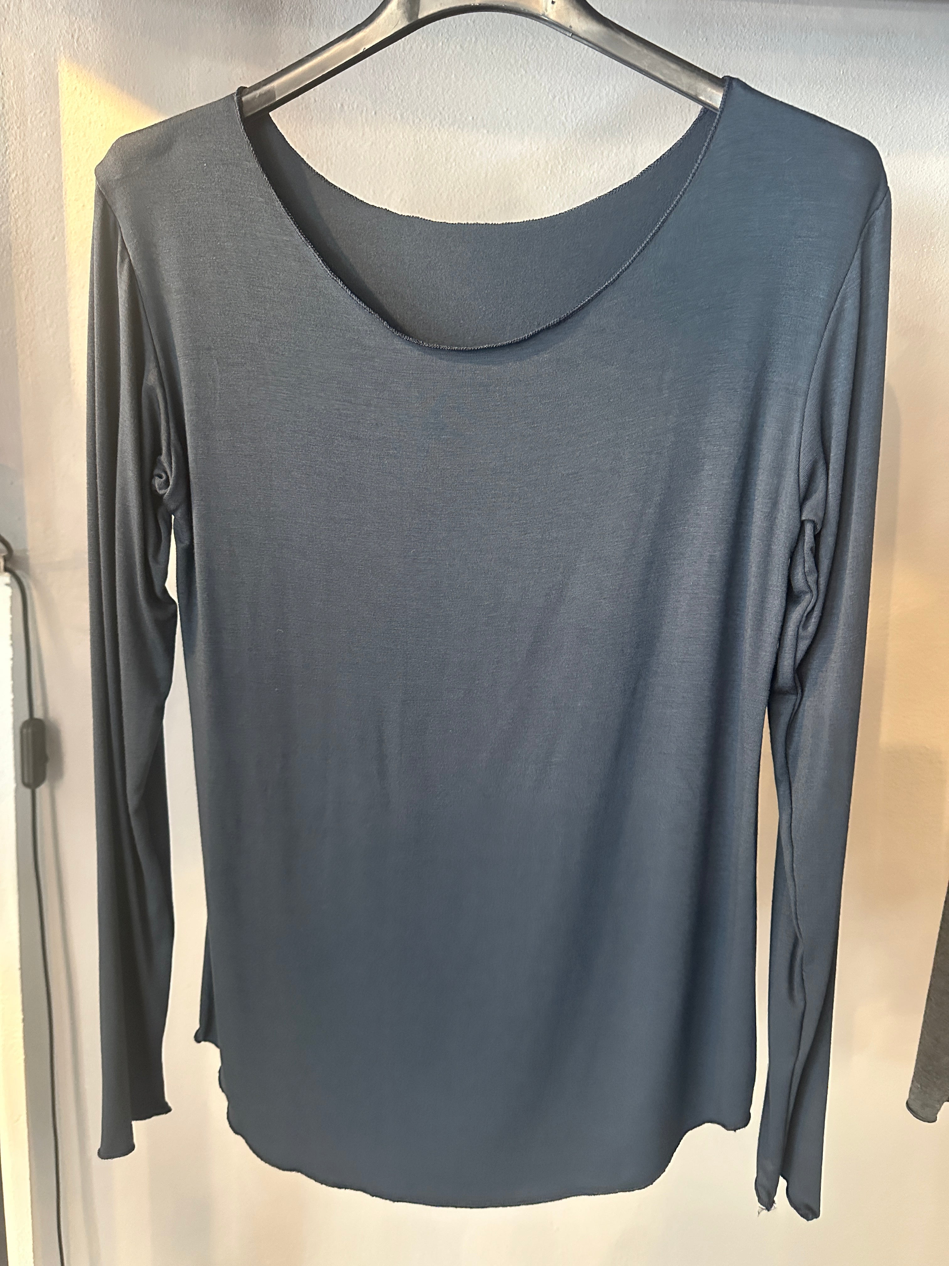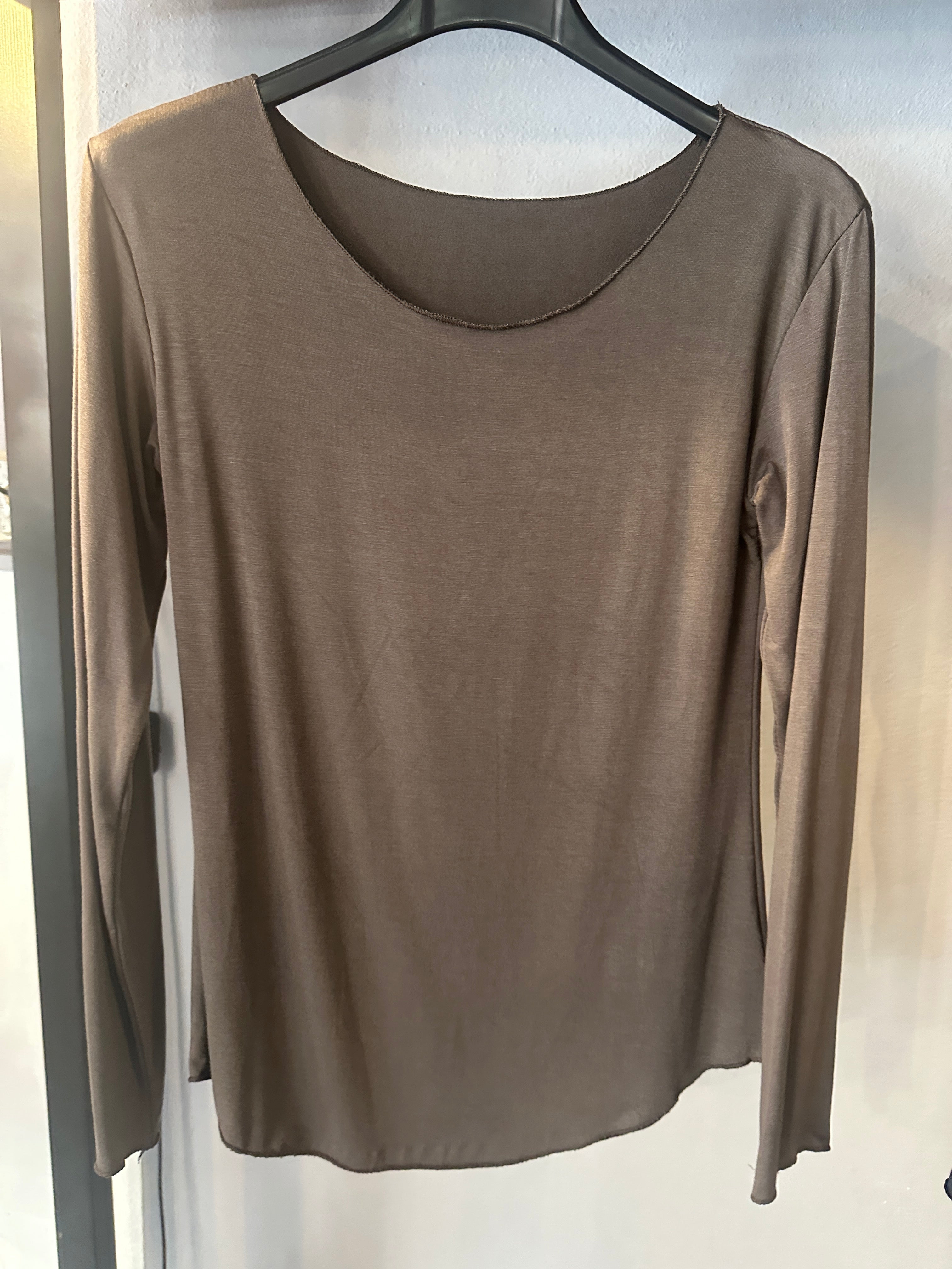 Descrizione: T-shirt Basica in Viscosa. Scollo Madonna e manica lunga. Rifiniture con prillino