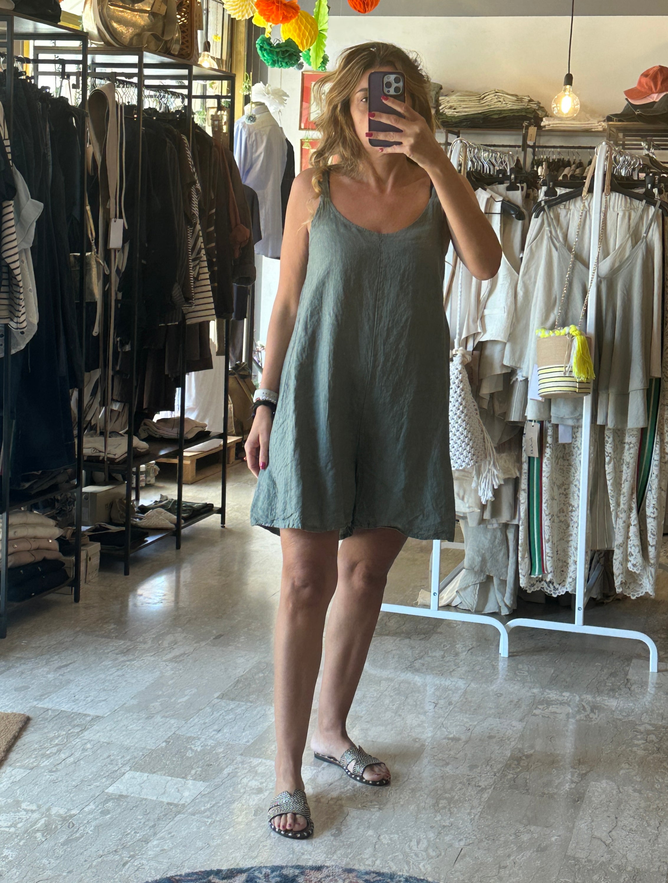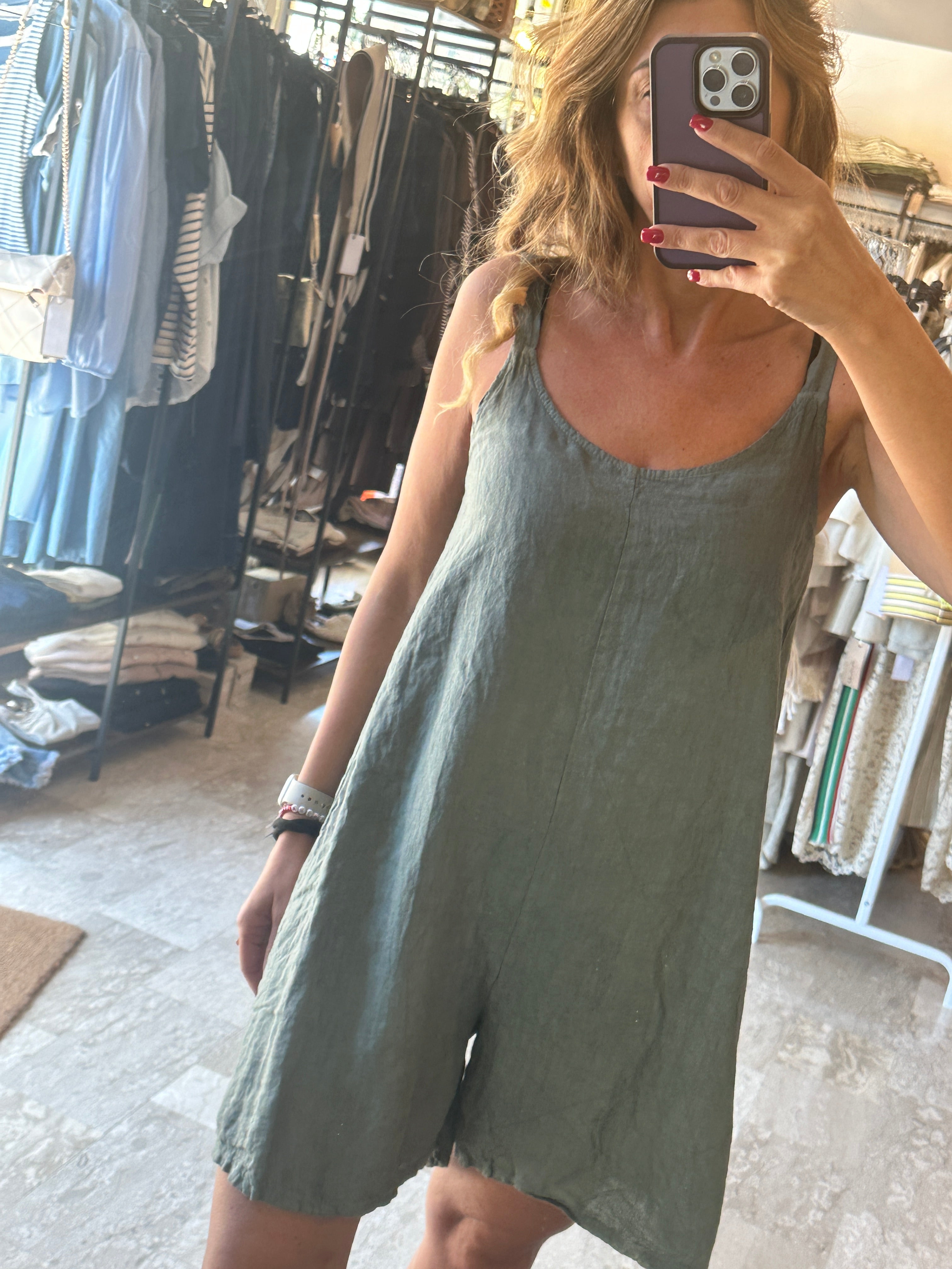 Descrizione: Tuta corta in lino. Scollo davanti a V e dietro arricciato. Bretelle larghe in lino. Gamba over