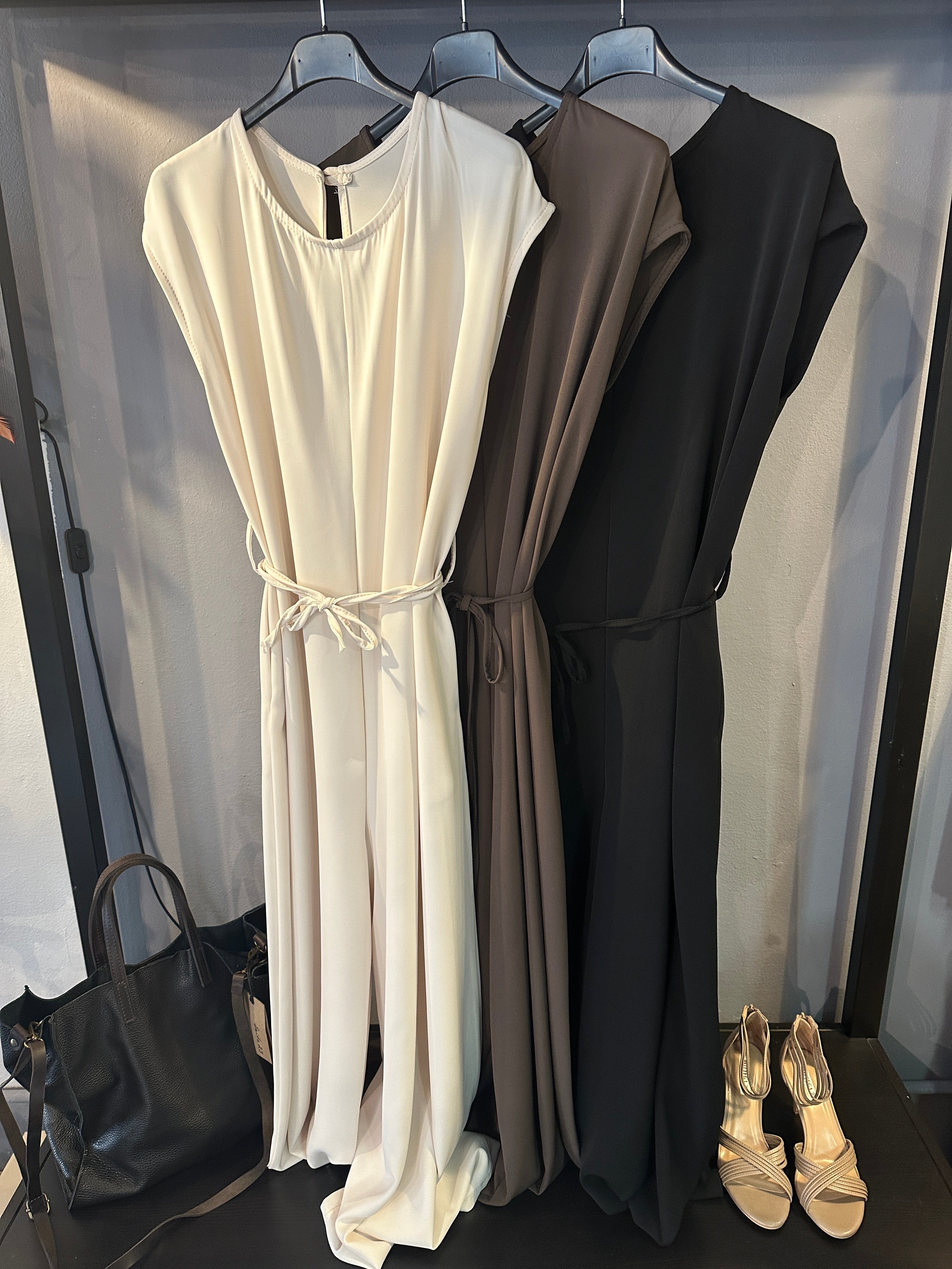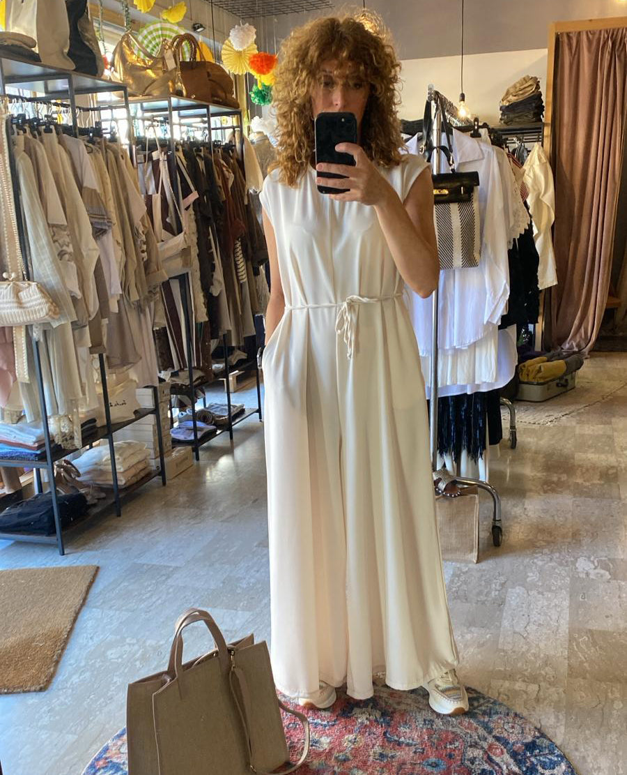 Descrizione: Tuta intera con cinturina. Girocollo, apertura dietro con asola e bottone, goccia dietro profonda. Gamba larga.