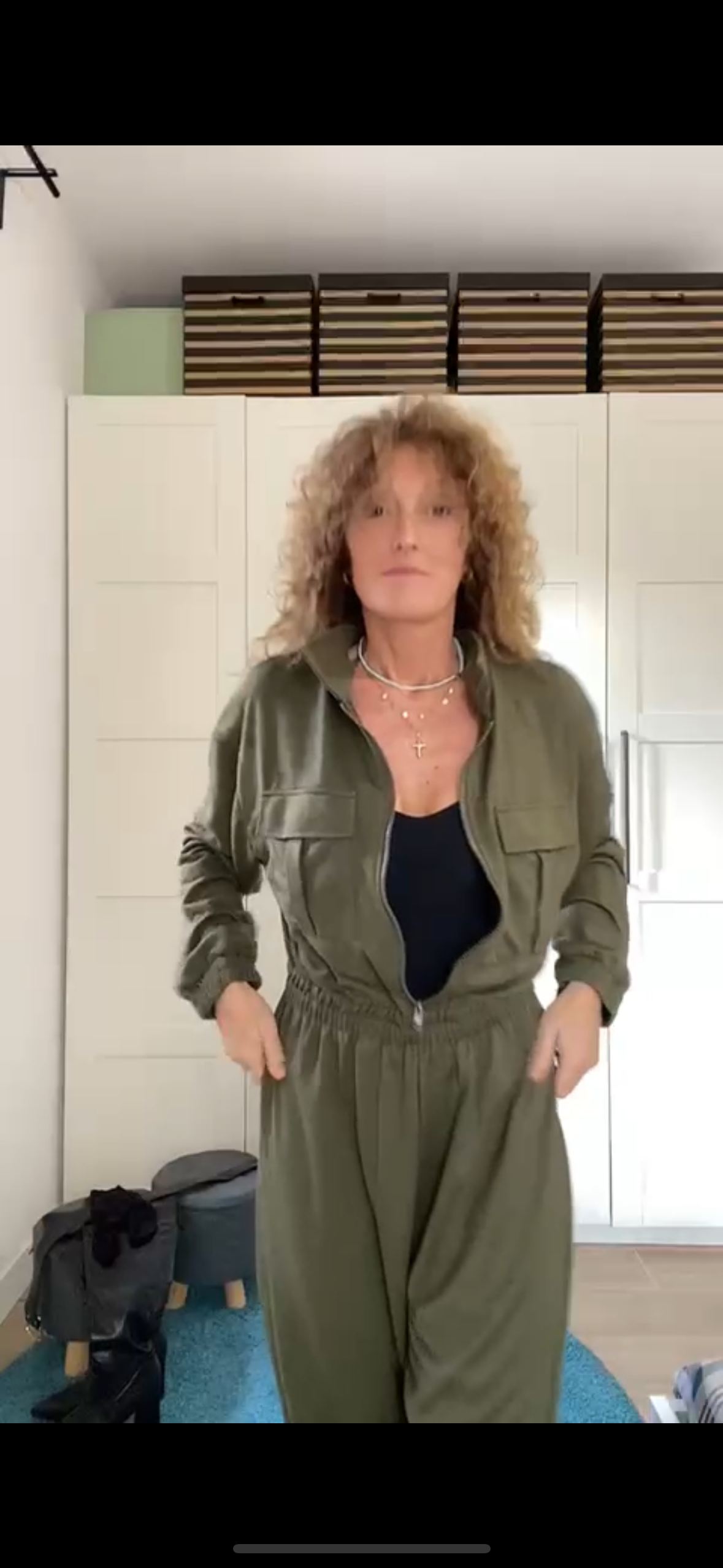 Descrizione: Tuta intera con collo a camicia. Apertura davanti con zip, elastico in vita e gamba dritta. Manica lunga