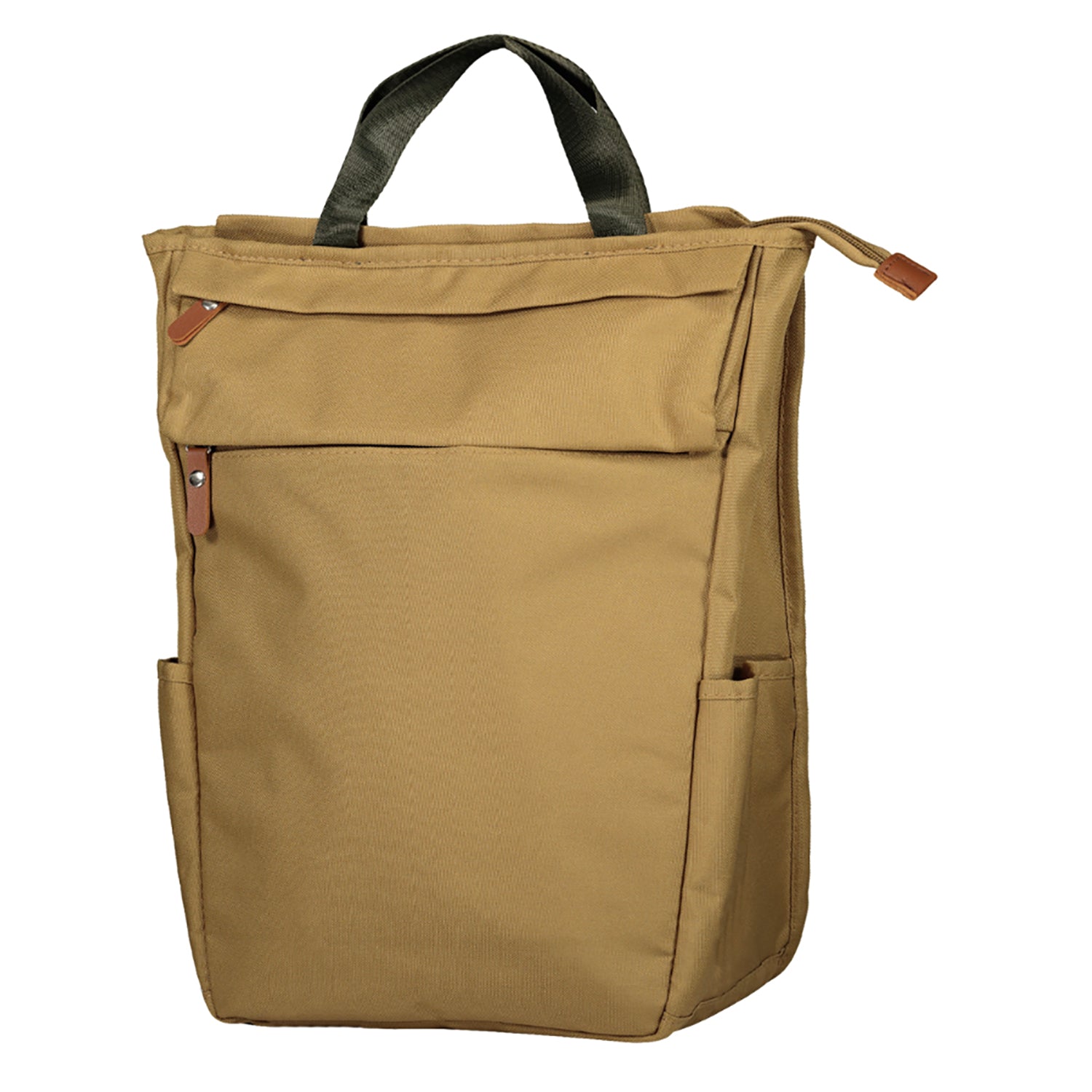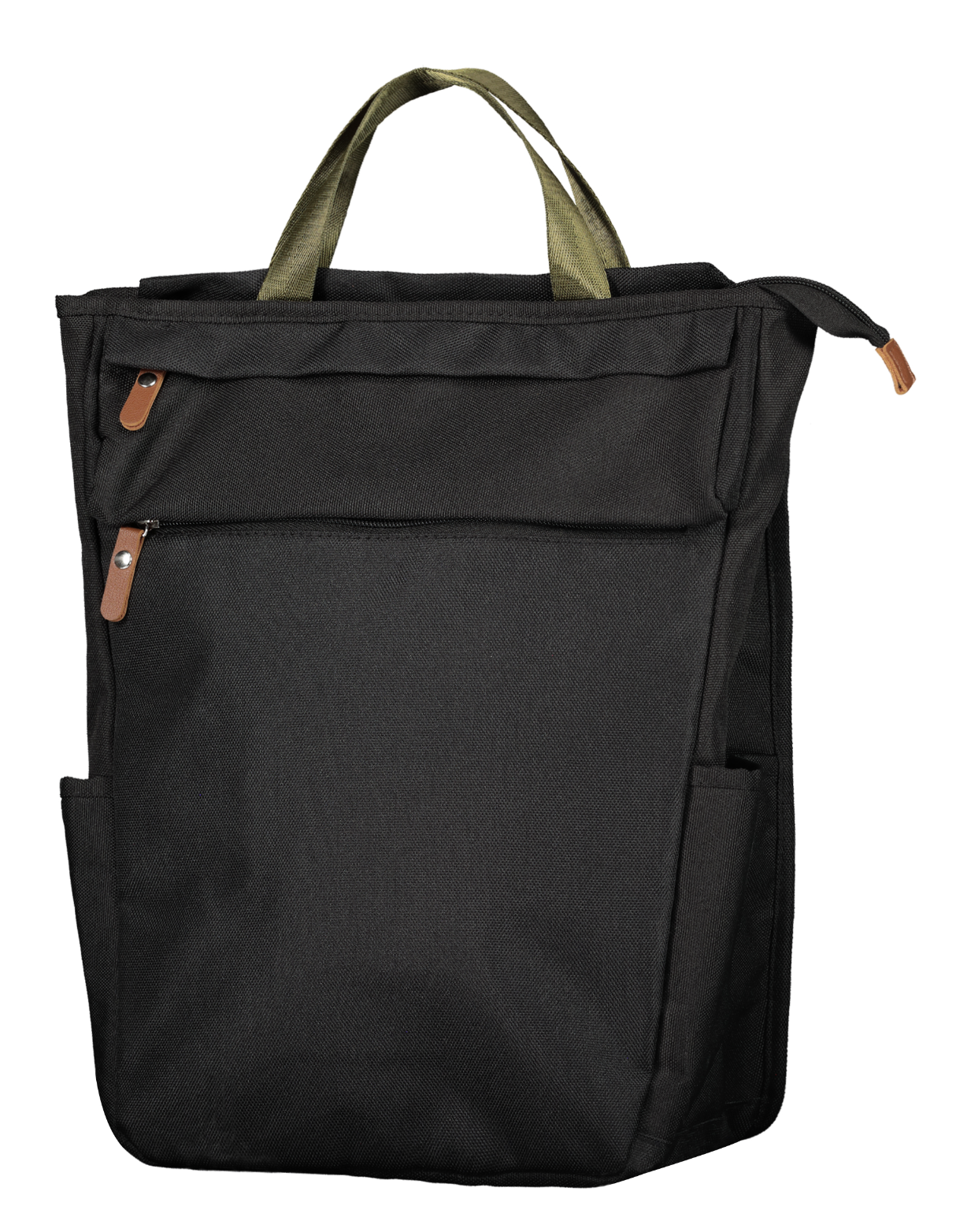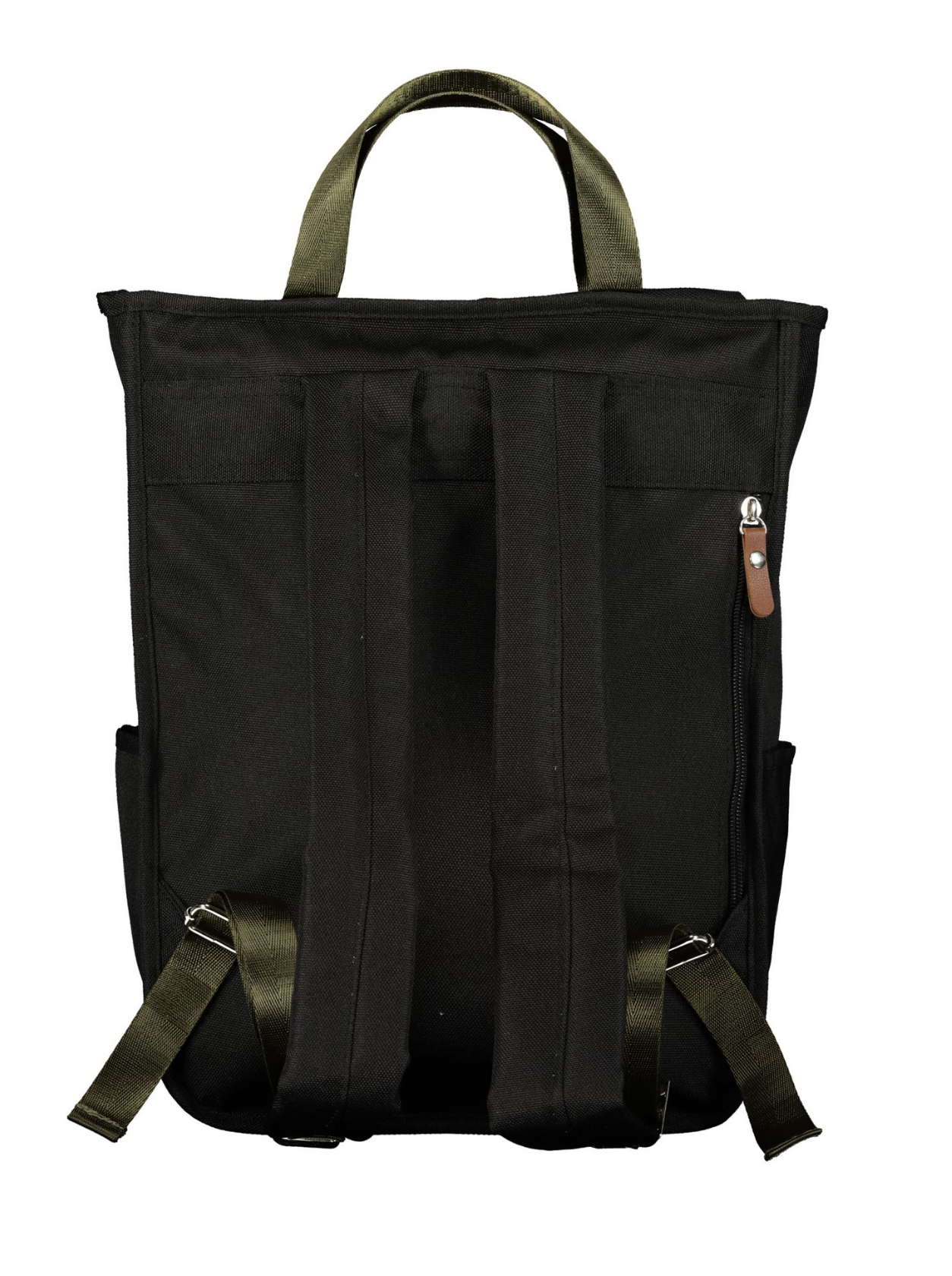 Descrizione: Zaino con manici in contrasto sulla parte superiore, spallacci sul retro e tasche apribili con cerniera laterale e sul davanti.
